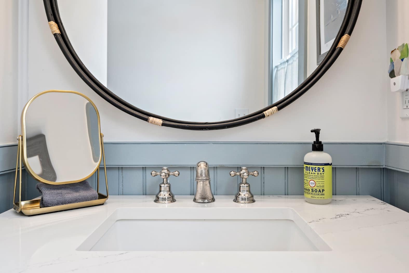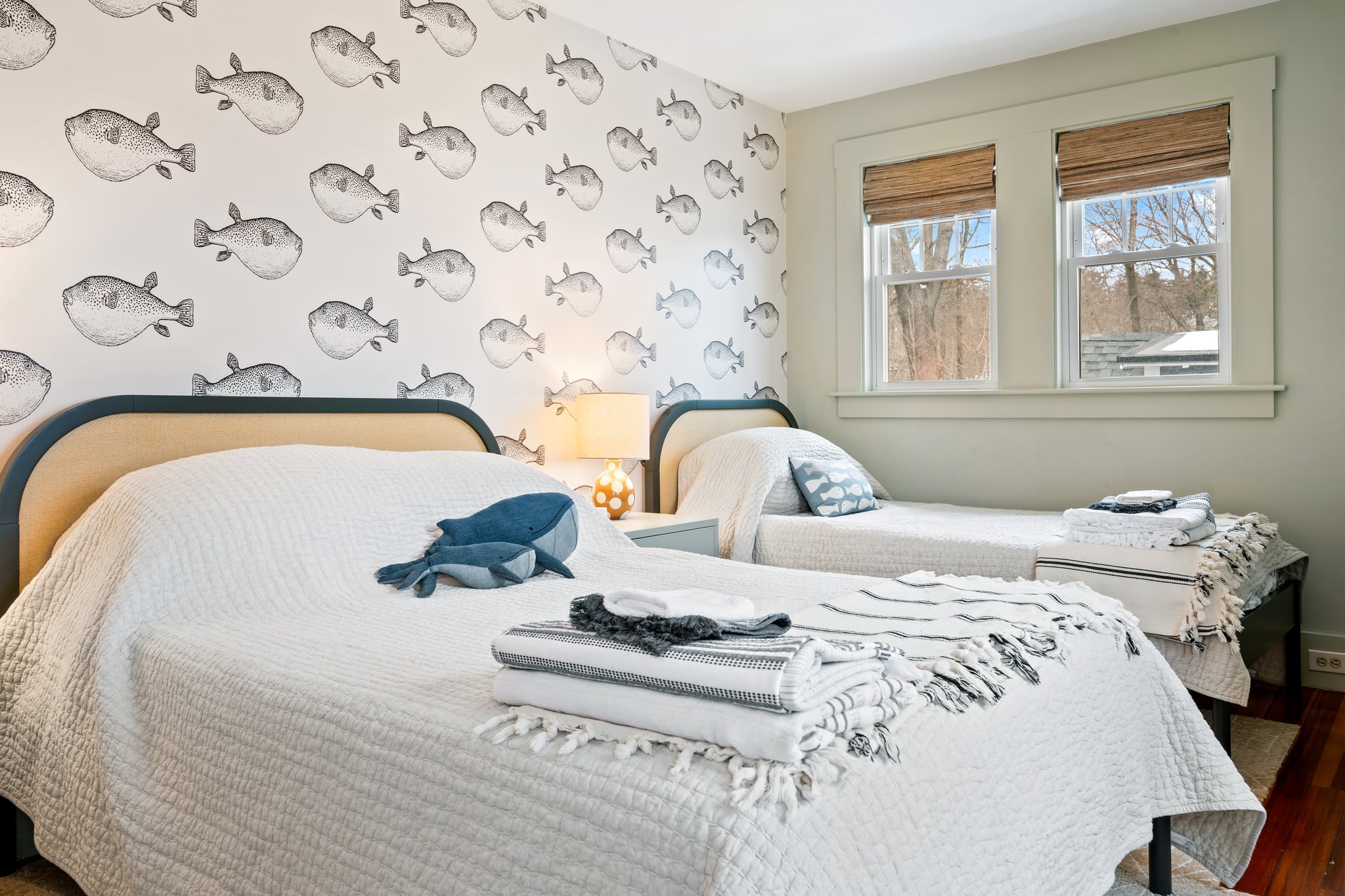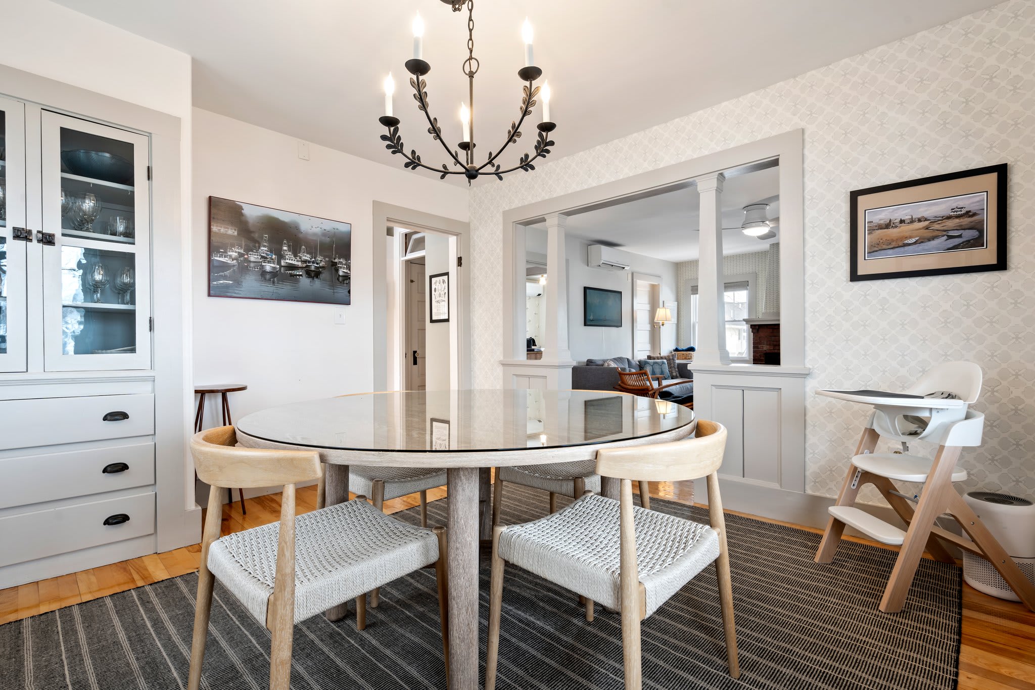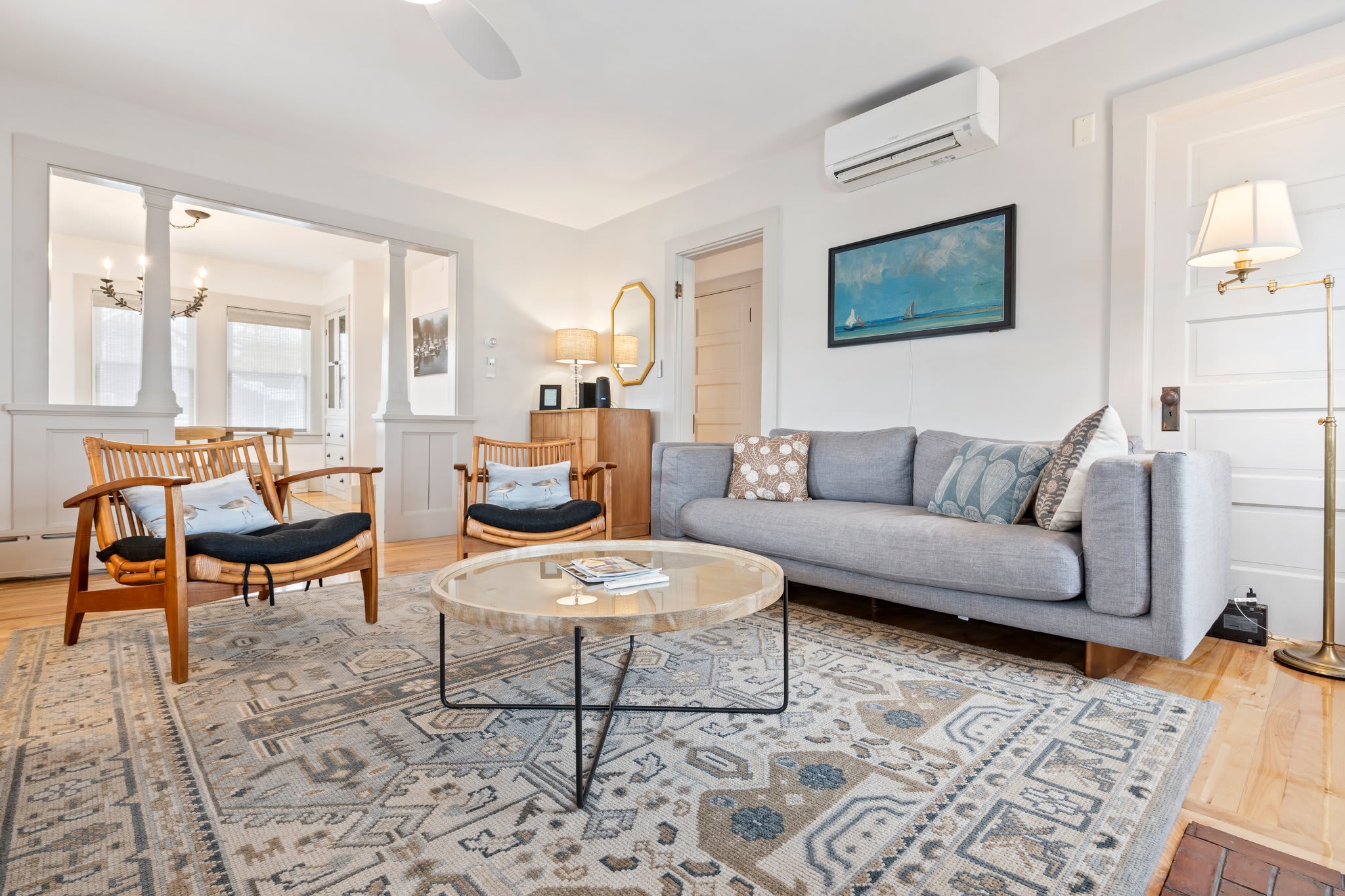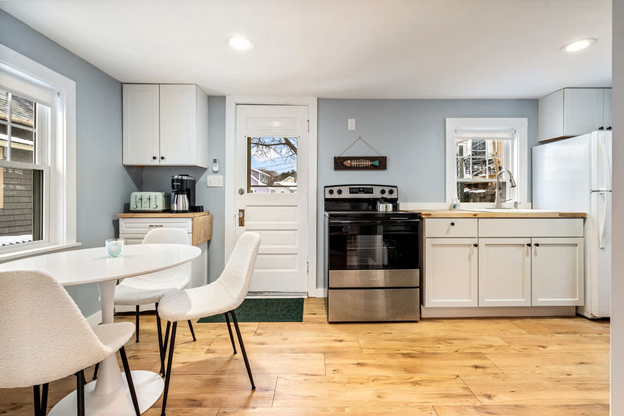The cottage provides a private, cozy space for additional guests. The living room, with its smart TV, comfortable couch, and two chairs, offers a great place to relax in seaside serenity. The eat-in kitchen, complete with a dining table for four and a drip coffee maker, ensures that guests have everything they need to start their mornings off right. Like the main house, the bedrooms are equipped with room-darkening shades for peaceful rest after a day of adventure.