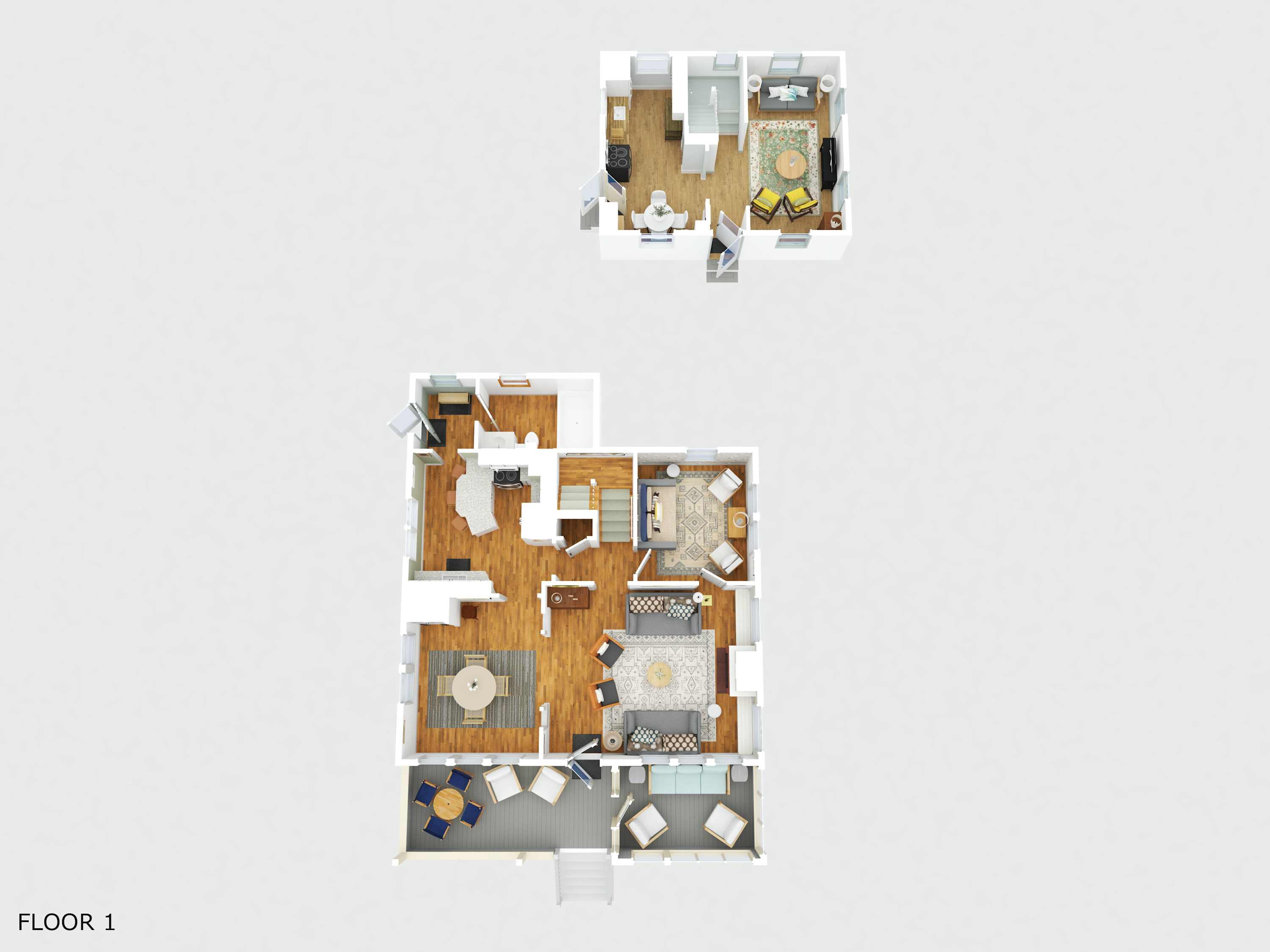 The main house is designed for both relaxation and connection. The inviting living room, complete with two plush couches, two chairs, and a collection of board games, is the perfect spot to unwind after a day in the sun. The fully-equipped kitchen, featuring a stone countertops and counter seating for three, makes meal prep a breeze, while the dining room comfortably seats eight—ideal for enjoying fresh seafood dinners together. Each bedroom is outfitted with room-darkening shades, ensuring a restful night’s sleep. Step onto the front porch, where seating for four invites you to sip your morning coffee fresh from the kitchen or enjoy an evening drink as the sun sets. Plus, the convenient mudroom helps keep the sand outside where it belongs.