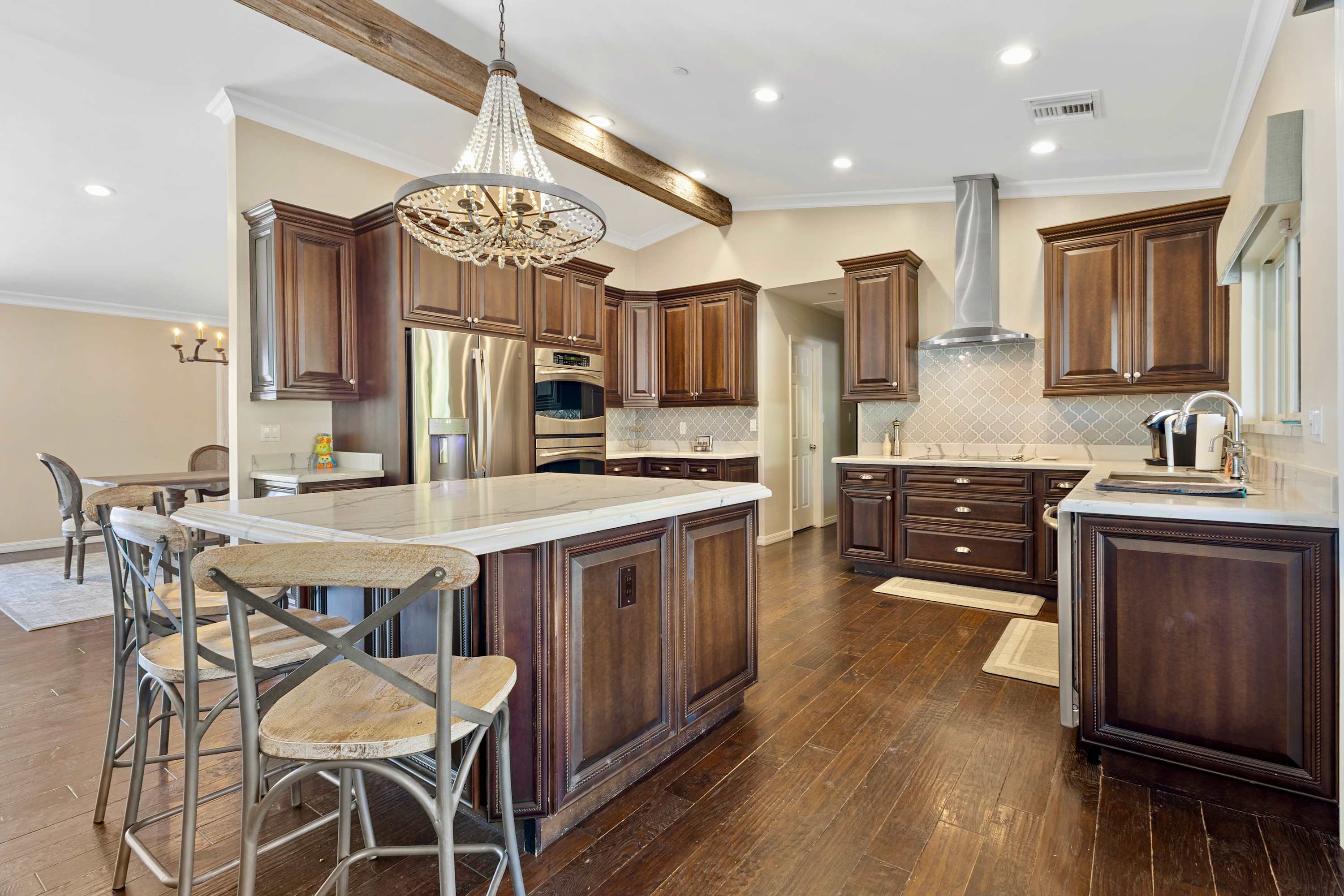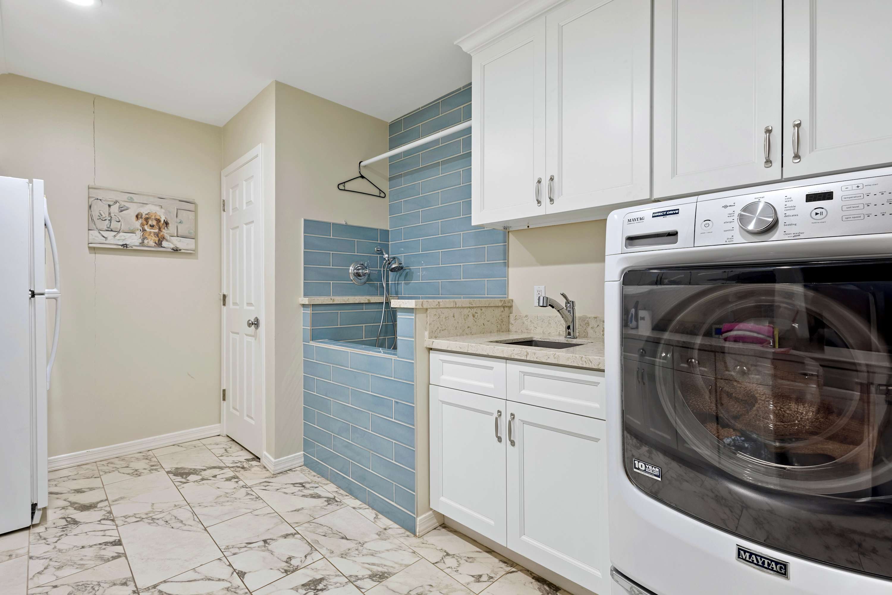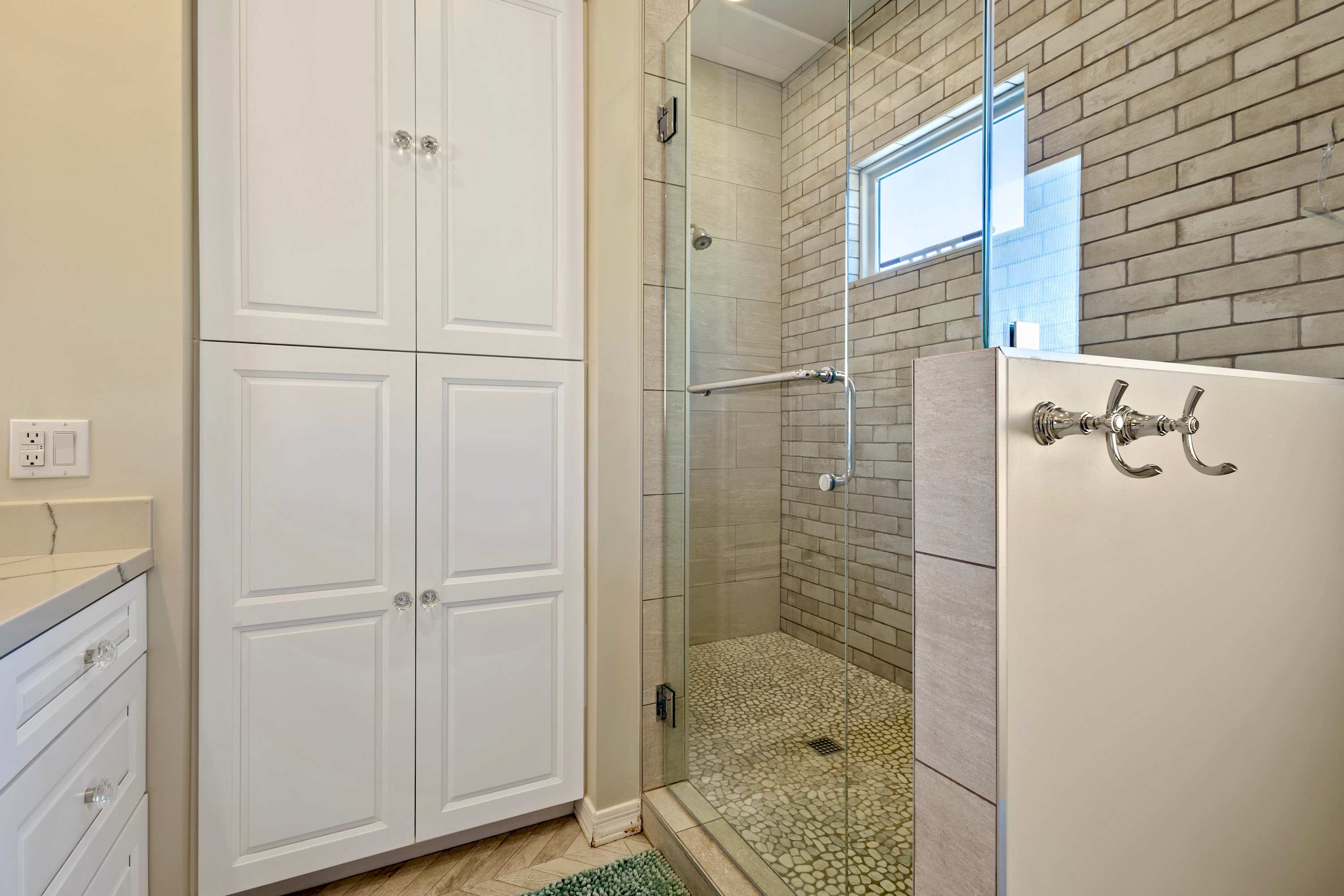 The modern kitchen is a chef’s dream, equipped with stainless steel appliances, rich dark wood cabinetry, and expansive stone countertops. Start your mornings with a fresh brew from the Keurig while chatting at the counter seating for three. With ample space for meal prep and all the amenities you need, cooking here is a pleasure. Enjoy casual breakfasts at the counter or gather for memorable dinners in the dining area, creating a home-away-from-home experience that enhances your vacation.