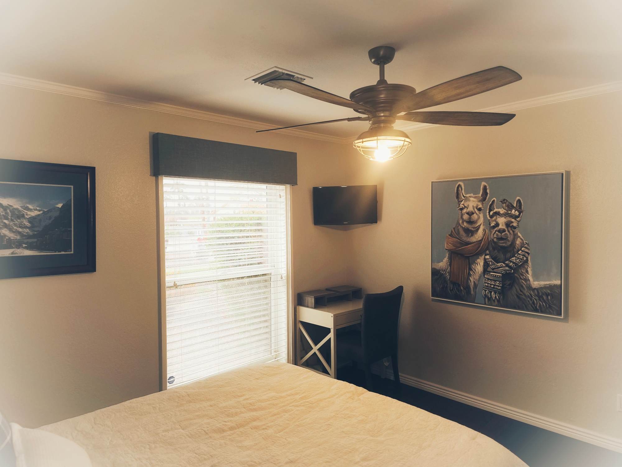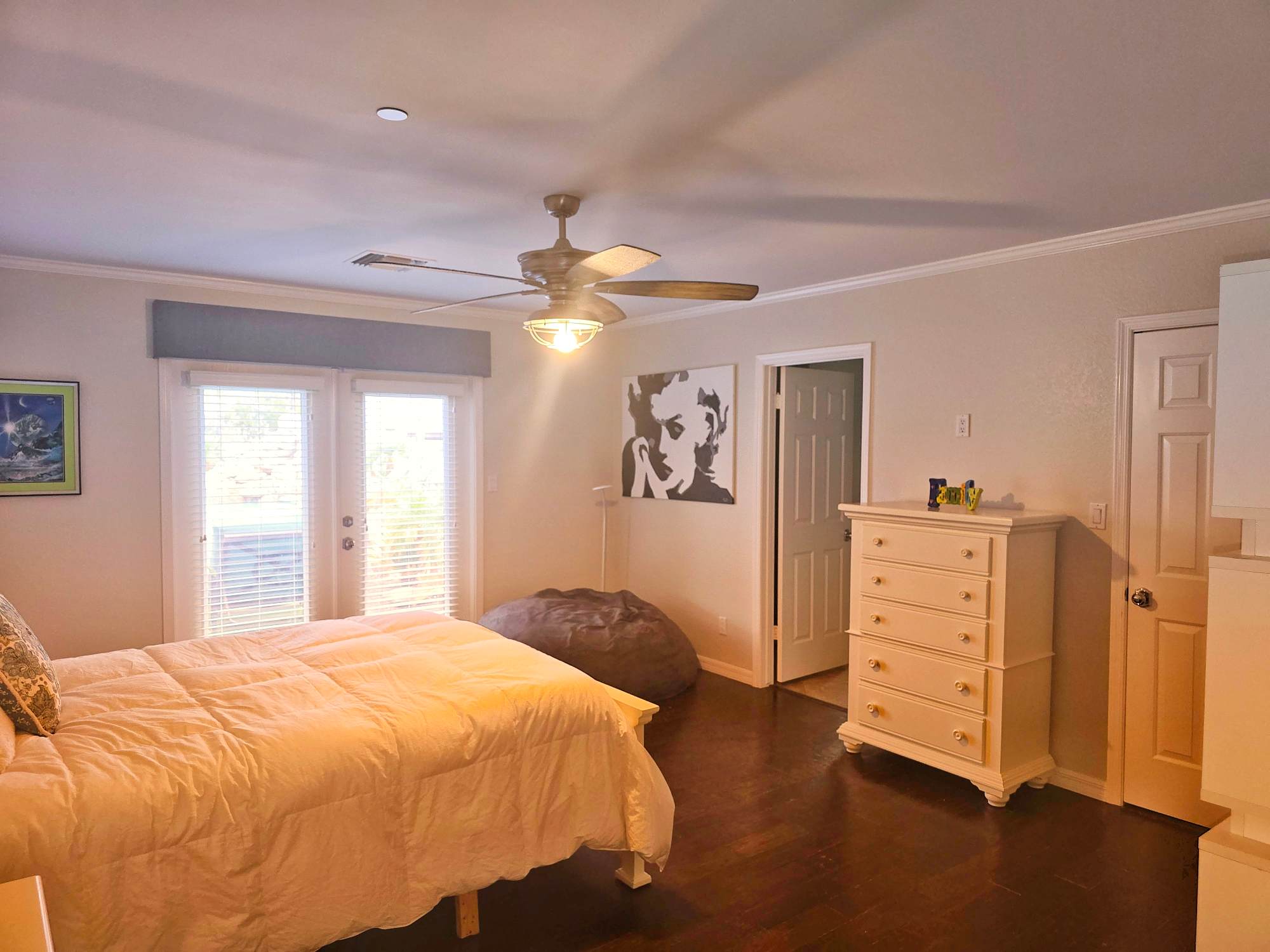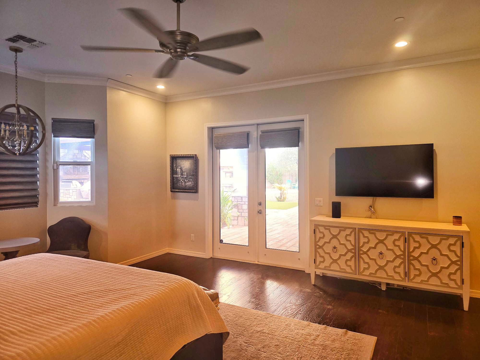 Bedroom #2 includes a king size bed, a smart TV, patio access, and an ensuite bathroom with a dual vanity and a shower/tub combo.