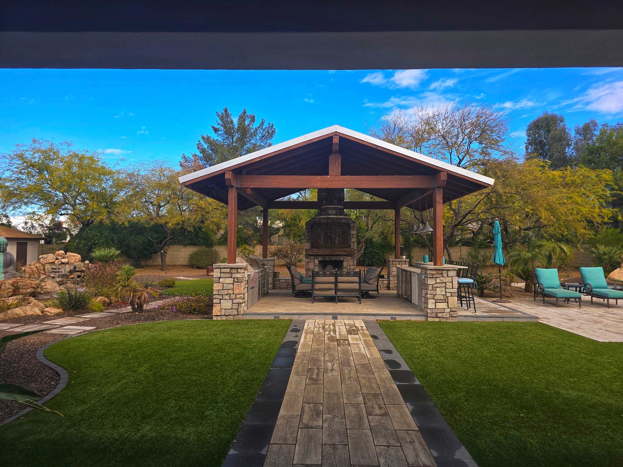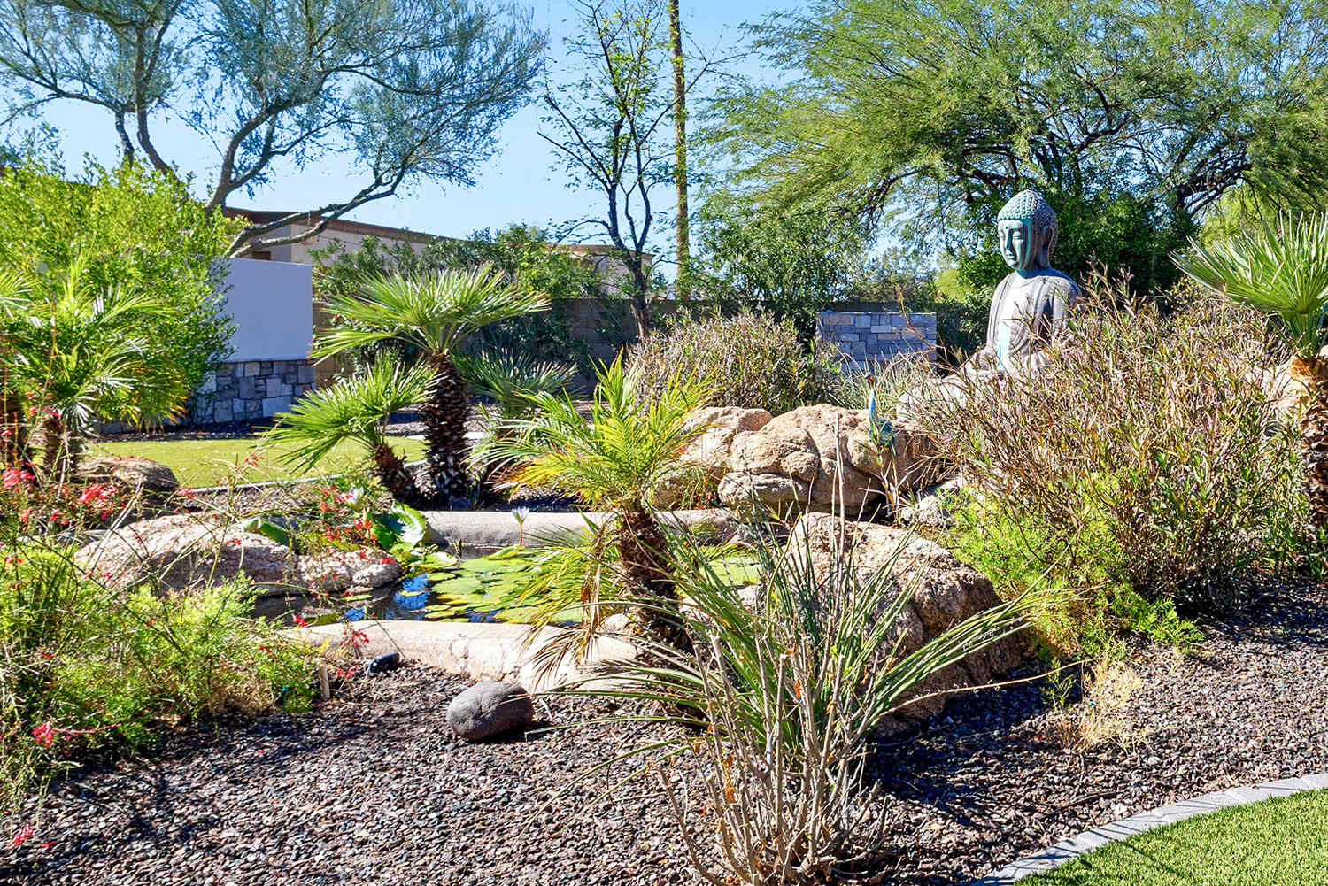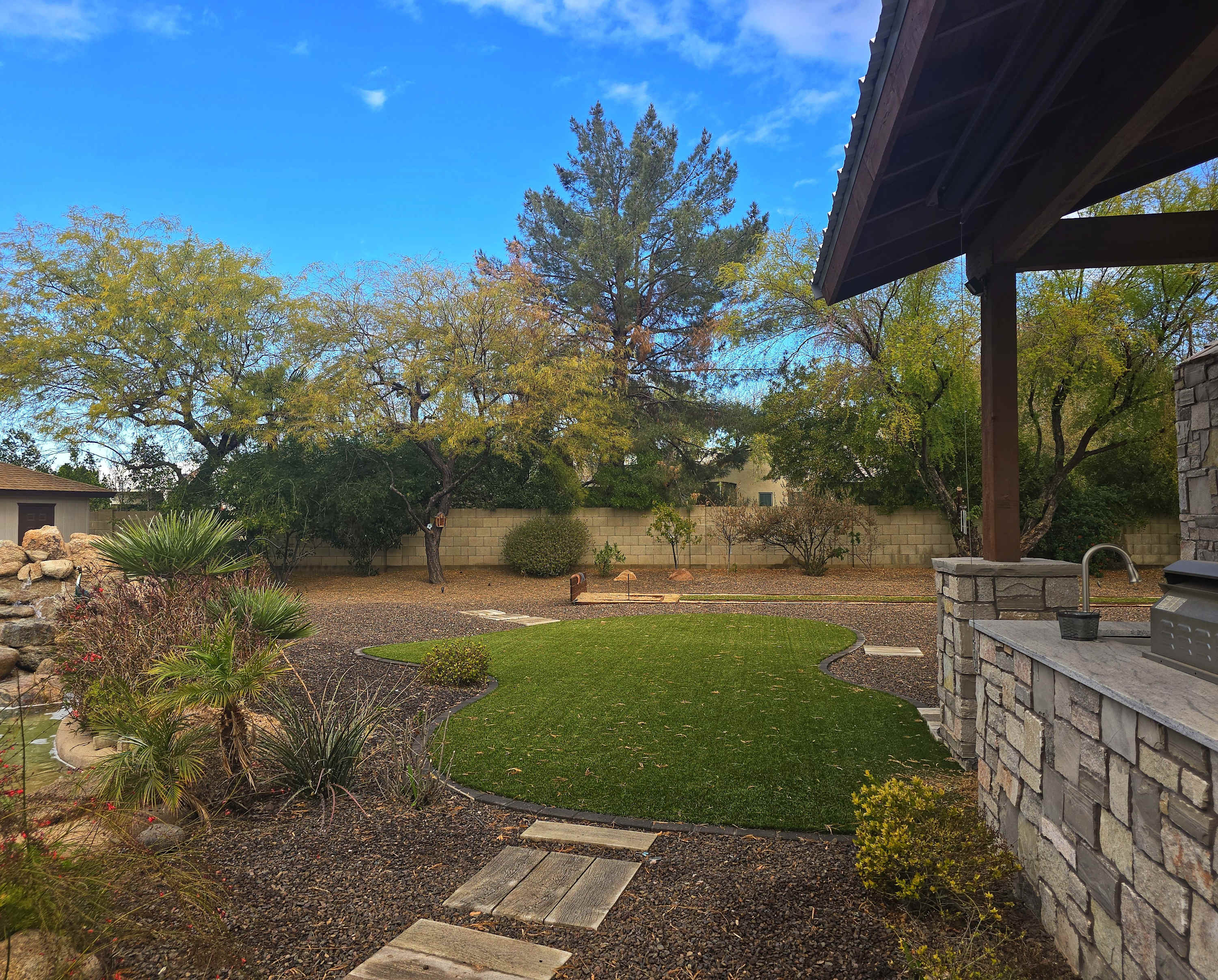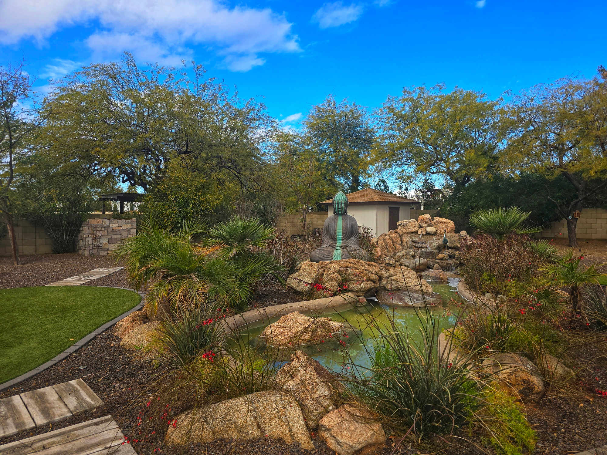 Outside, a private oasis awaits. Lounge by the sparkling inground pool under the warm Arizona sun or find your zen in the serene Buddha garden. The covered bar area, complete with a grill and generous outdoor seating, is perfect for alfresco dining or evening cocktails. Whether you’re soaking up the sun on the comfortable lounge chairs or hosting a barbecue under the stars, this backyard is designed for both relaxation and entertainment. With its luxurious amenities and prime location, this Scottsdale retreat promises an unforgettable vacation experience.
