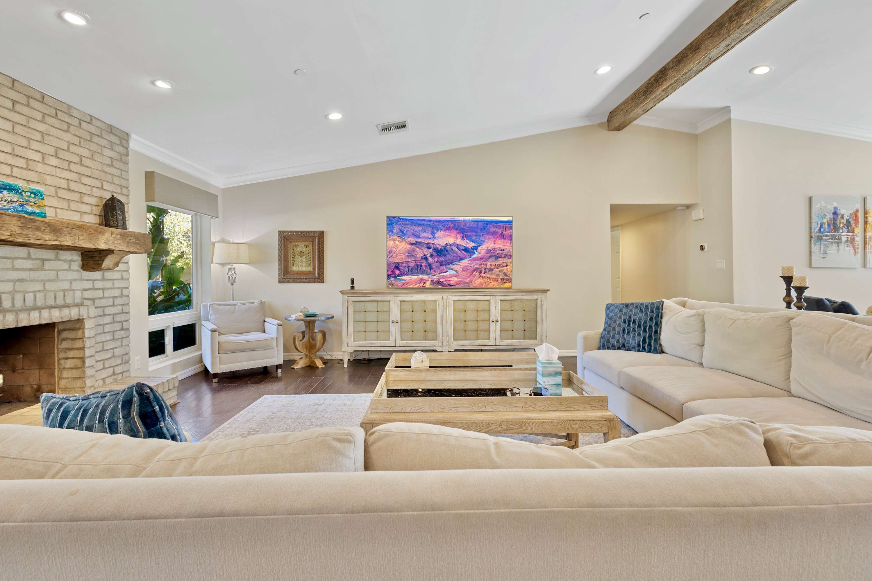 Step into this exquisite home and be welcomed by a spacious living room featuring a massive sectional sofa and a smart TV, perfect for movie nights or relaxing after a day of exploring. The open-concept design flows into an intimate seating area with four cozy armchairs, creating a warm and inviting space for conversation or unwinding with a good book. Whether you’re traveling with family or friends, this layout allows everyone to gather comfortably while still offering spaces for quiet relaxation.