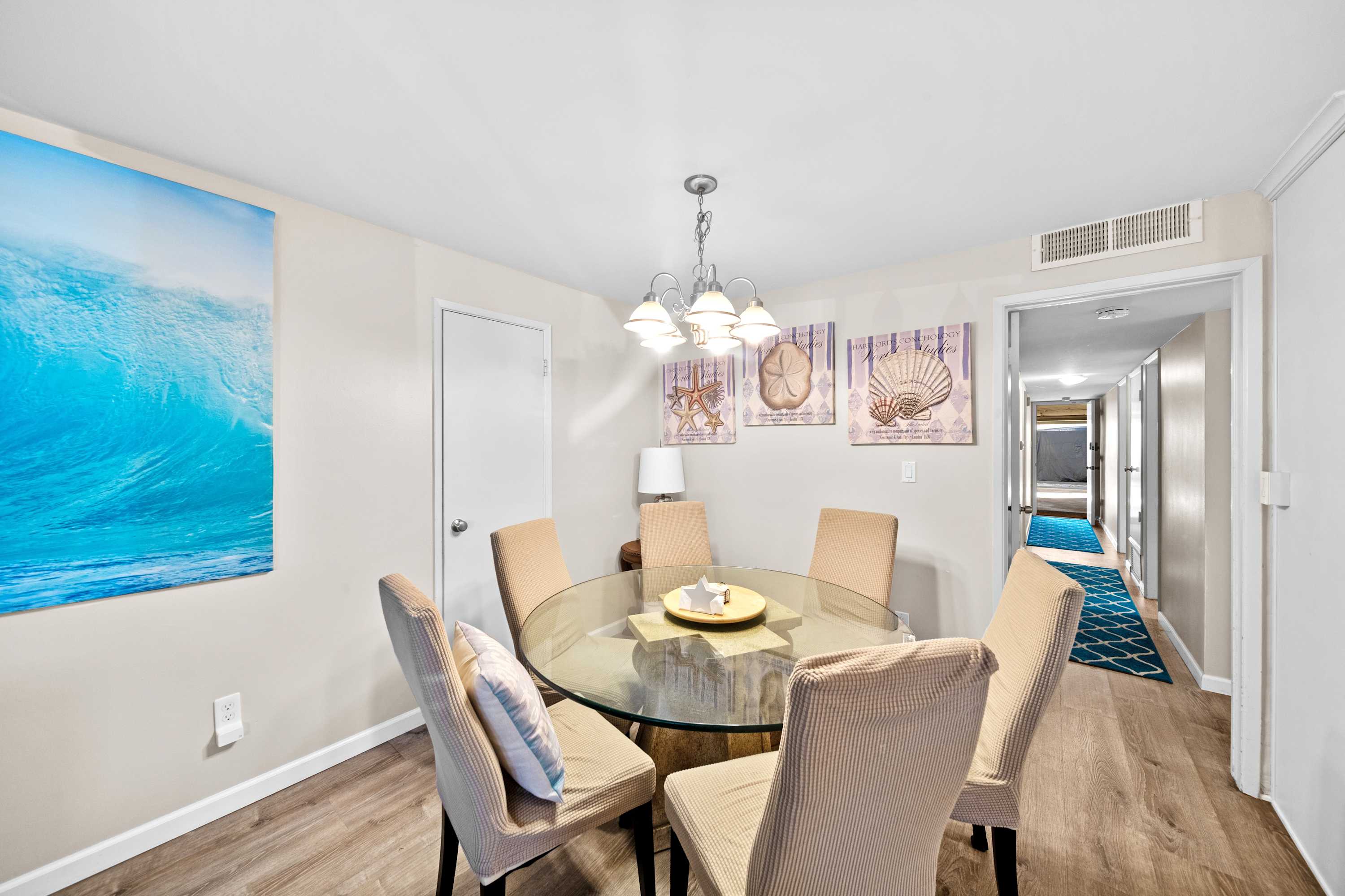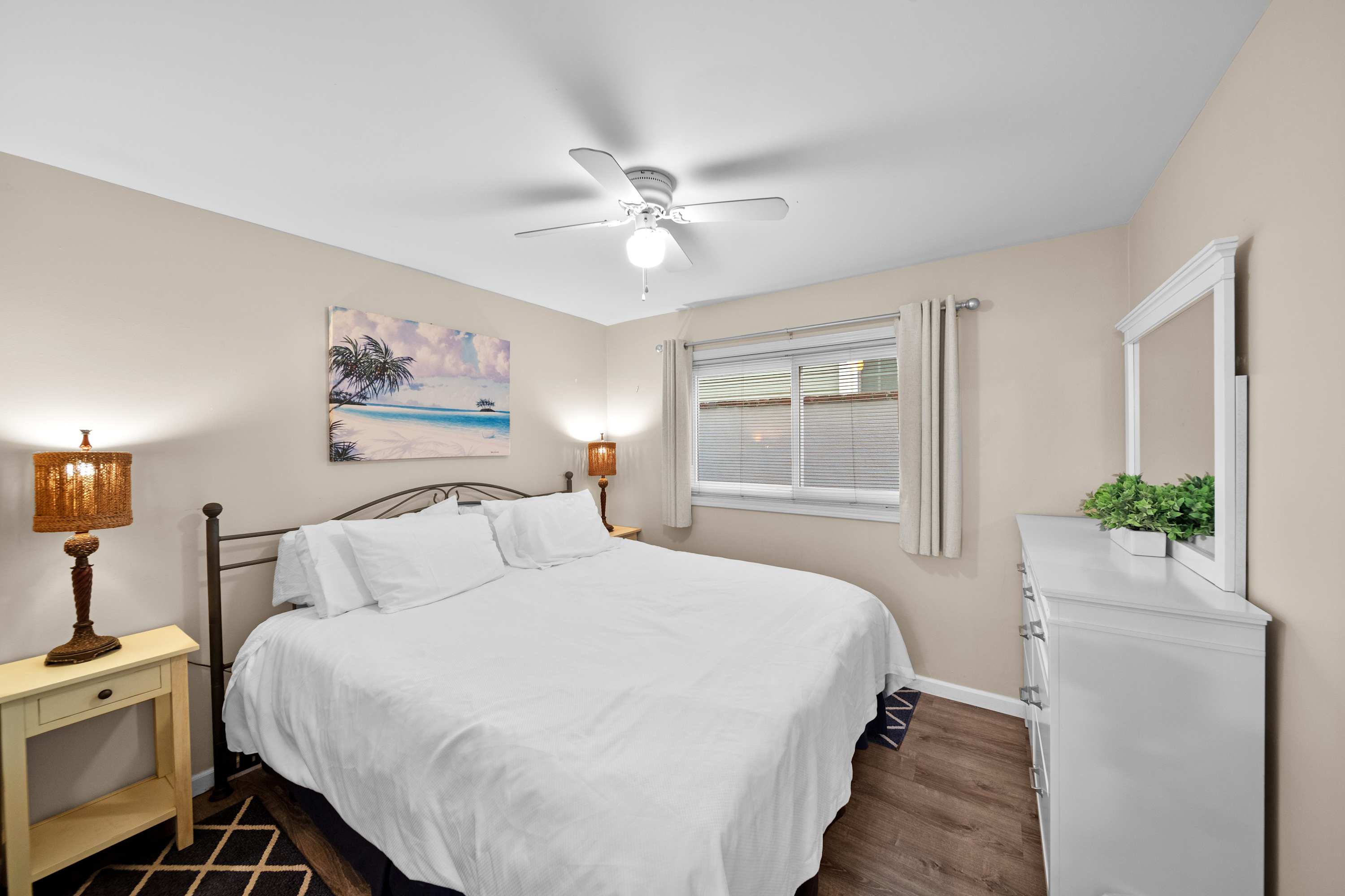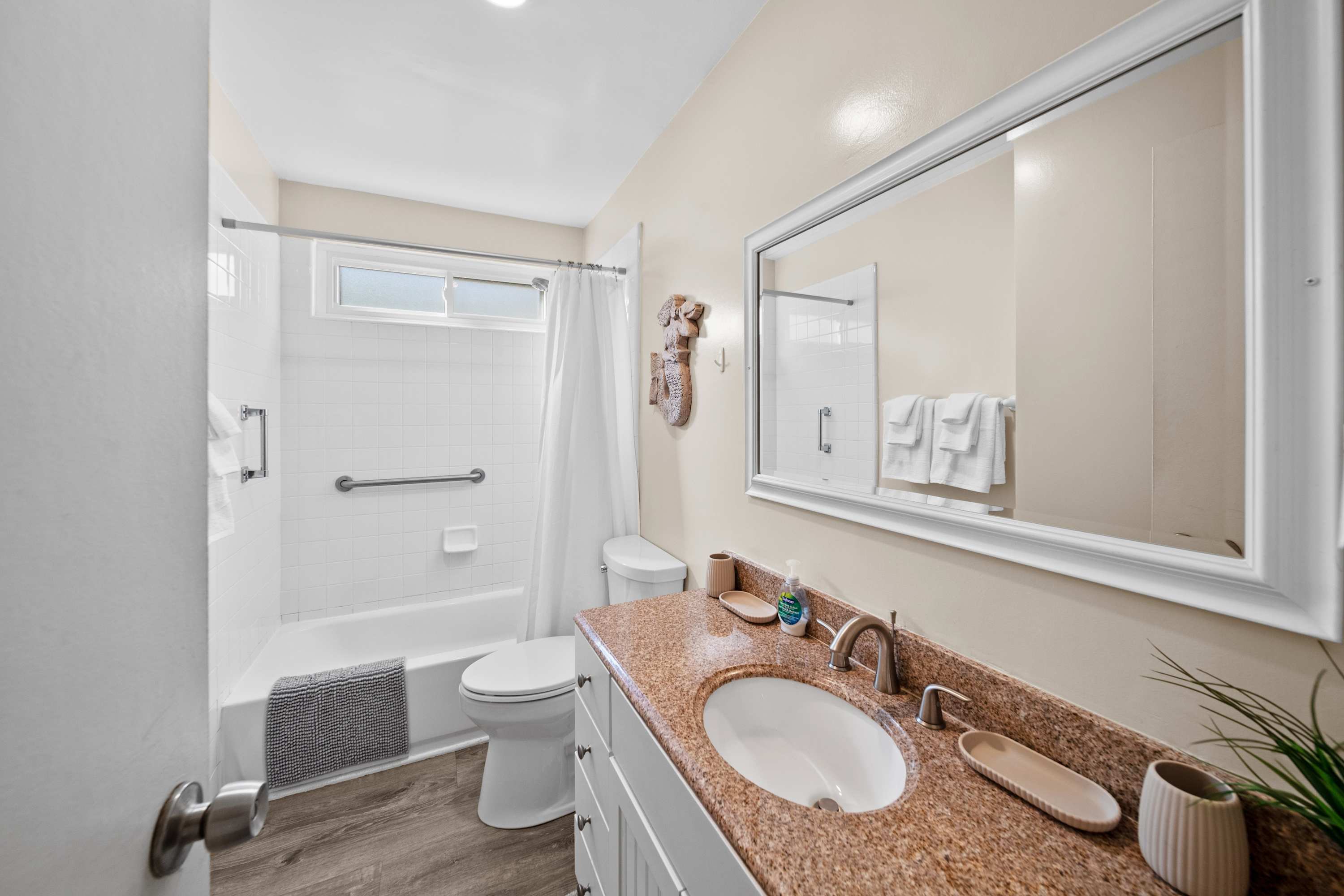 Inside, this beautifully designed home welcomes you with warmth and style of a beach cottage. The spacious living room invites you to unwind with a cozy couch, loveseat, cable TV, and a gas fireplace—ideal for relaxing after a day of exploring. The modern kitchen is fully equipped with stainless steel appliances, white cabinets, and granite countertops, making meal prep a breeze. Enjoy casual bites at the counter seating for two or gather around the dining table for six, creating a sublime setting for family dinners or game nights.