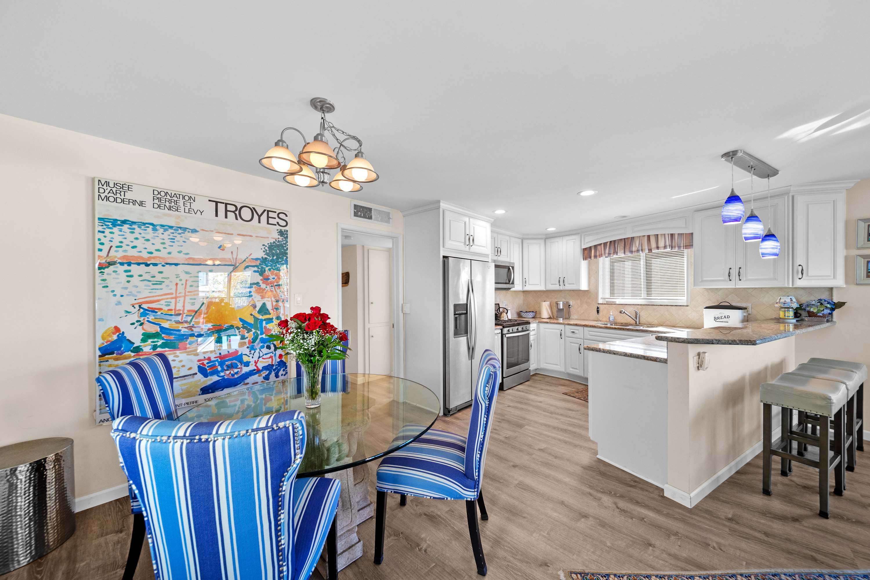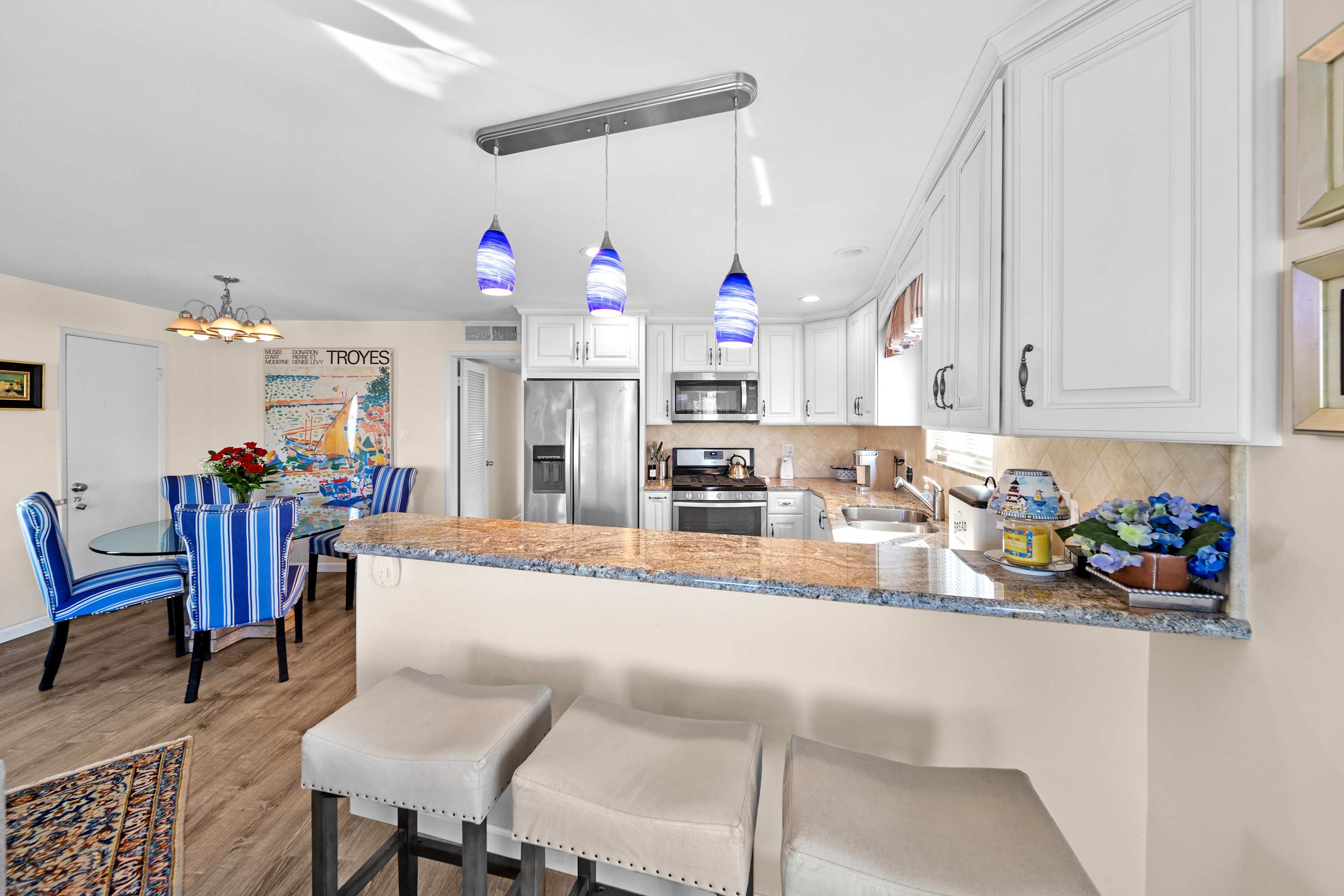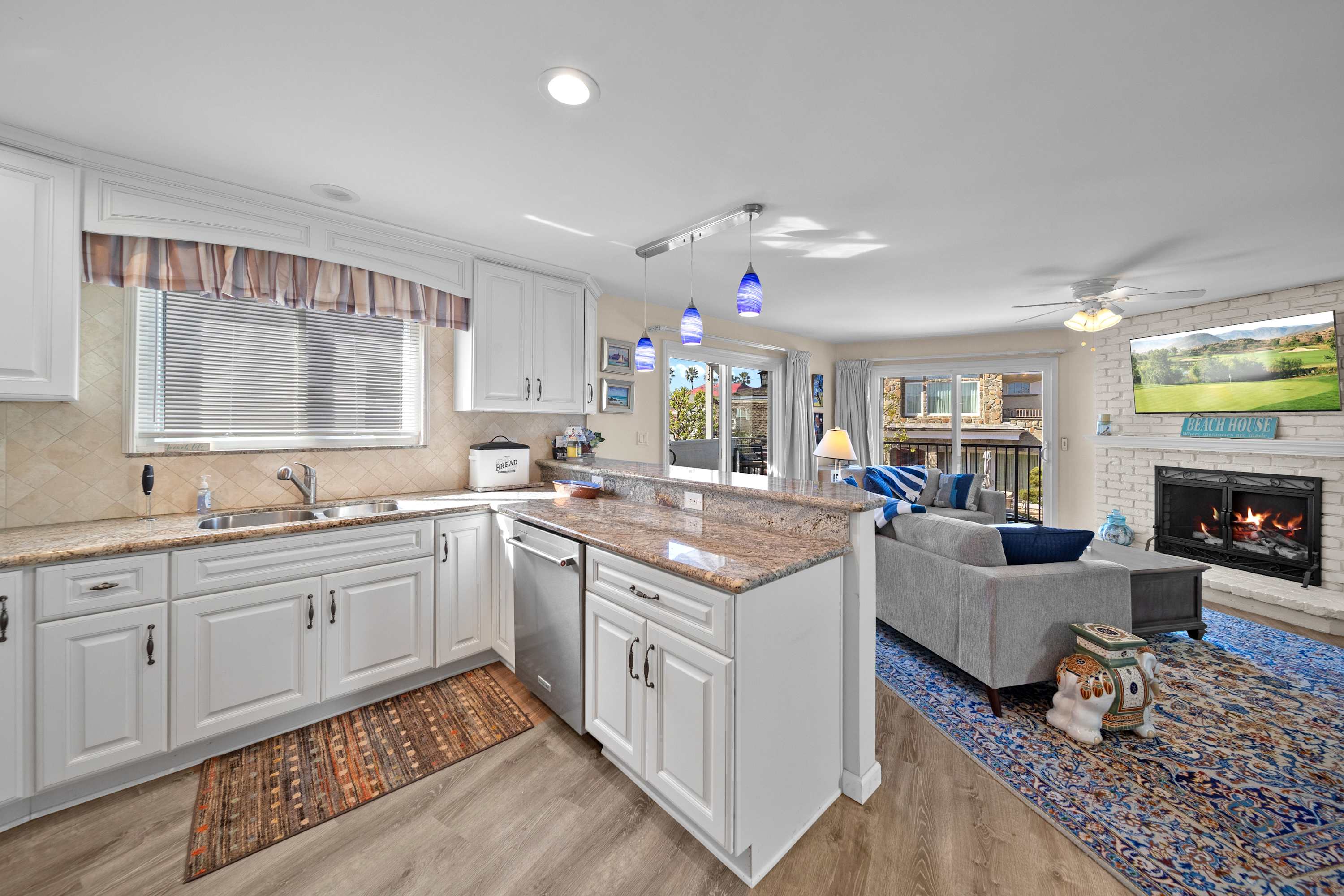 Inside, this inviting upper unit home exudes warmth and coastal elegance. The spacious living room is designed for comfort, featuring a plush couch, loveseat, cable TV, and a cozy gas fireplace—perfect for unwinding after a day of island exploration. Prepare your meals in the modern kitchen, both stylish and functional, boasting stainless steel appliances, white cabinetry, and gleaming granite countertops. Enjoy a casual breakfast at the counter seating for three, or gather at the dining table for four to share a meal and plan your next adventure.