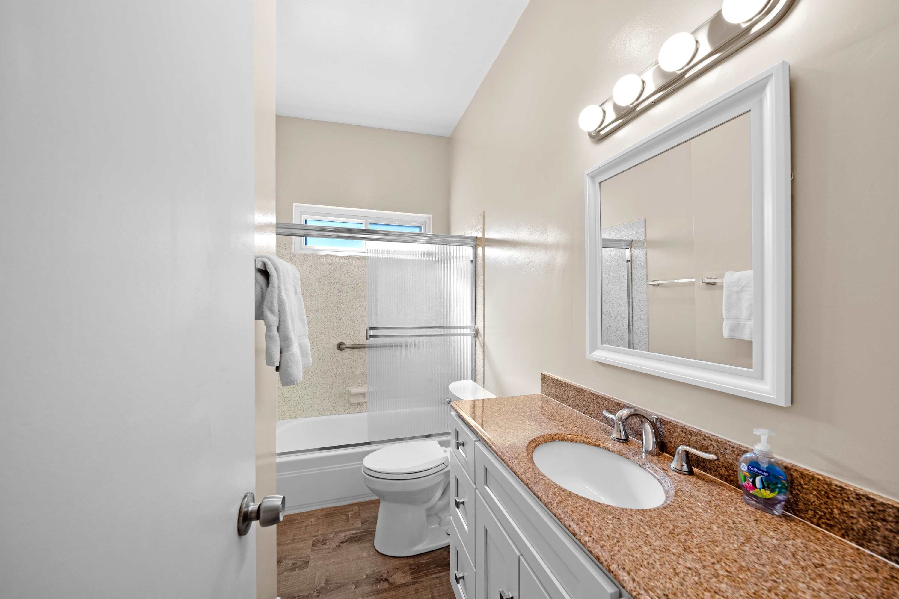 The home also includes 2 full bathrooms, both with a single vanity and shower/tub combo.