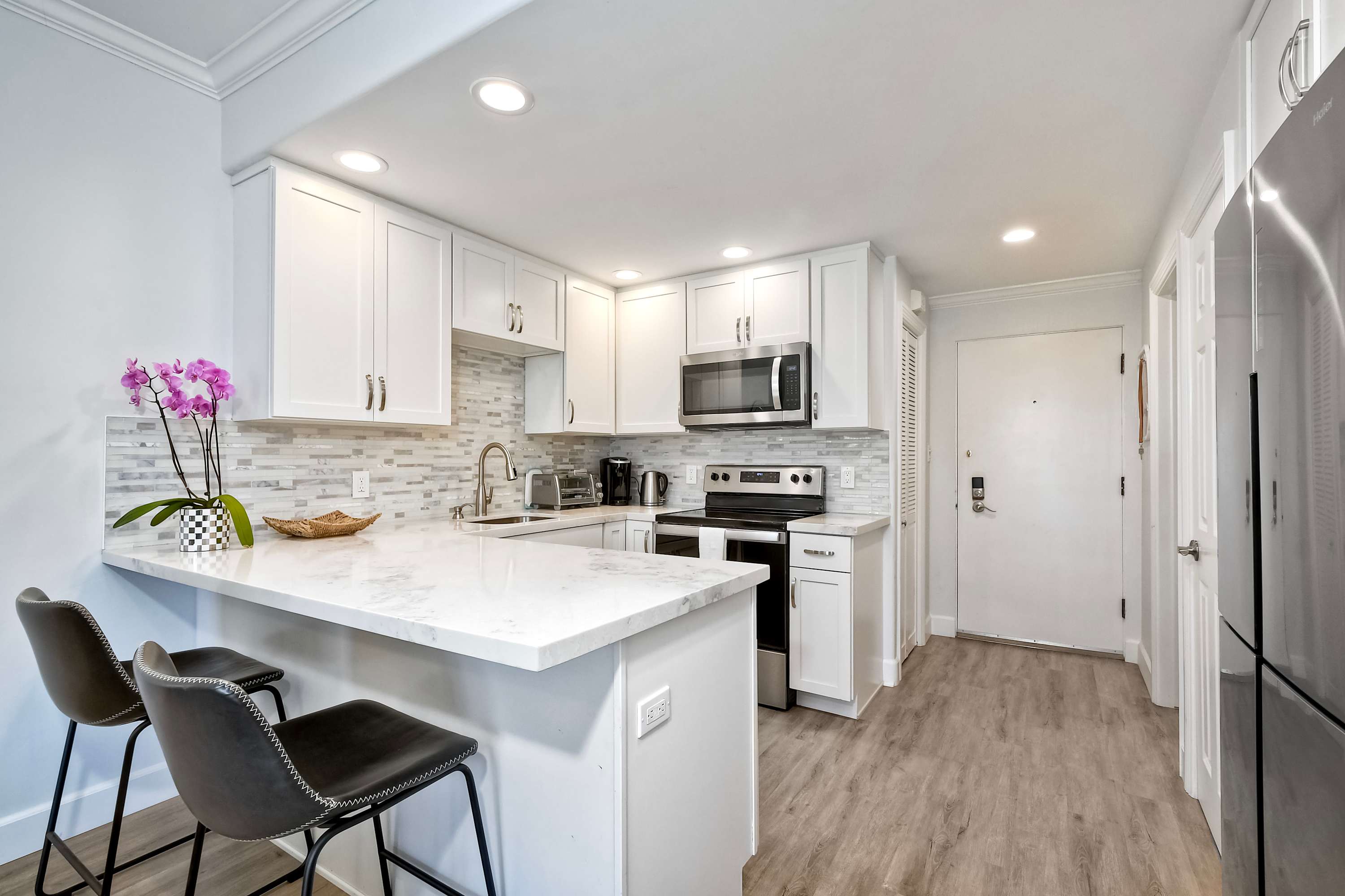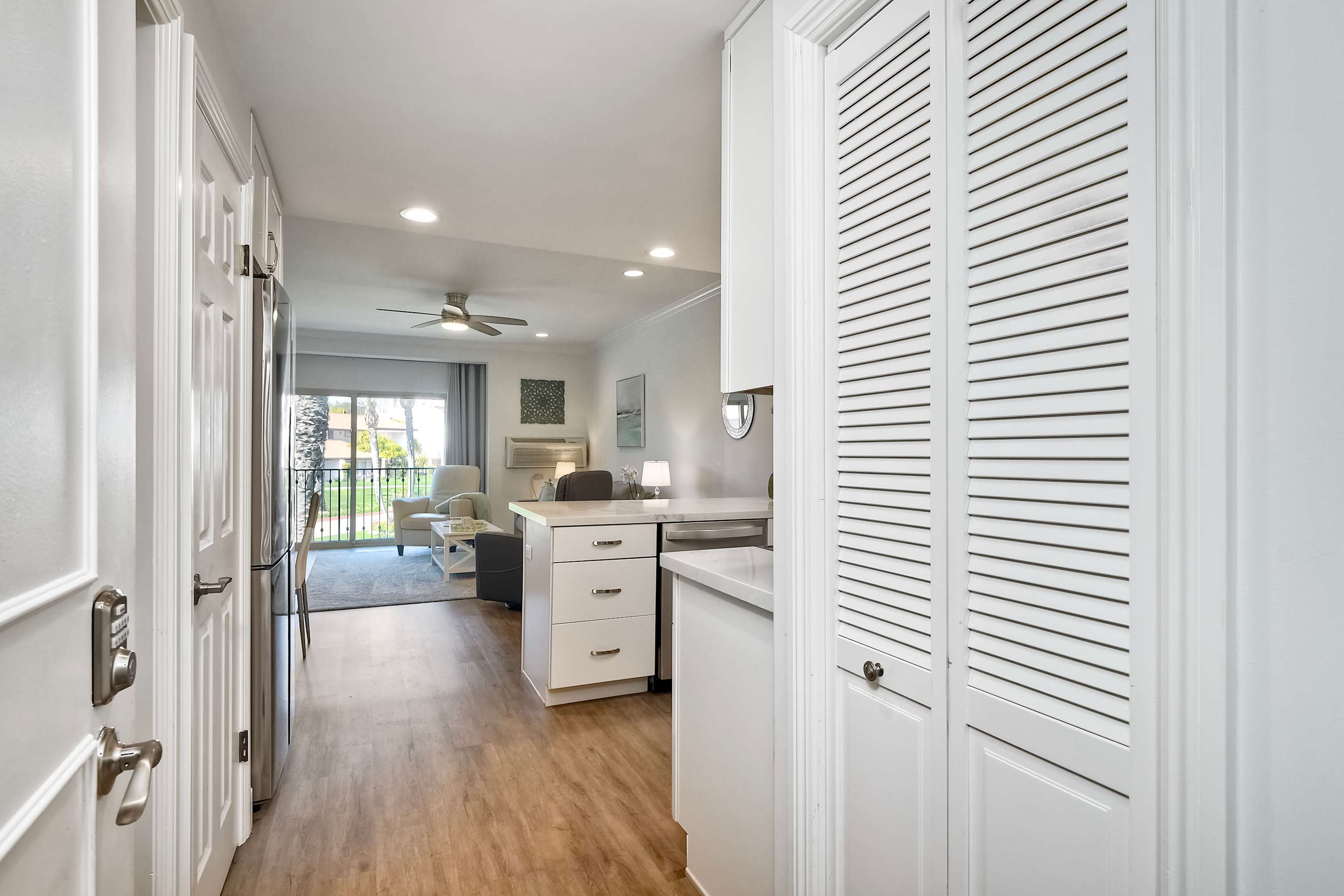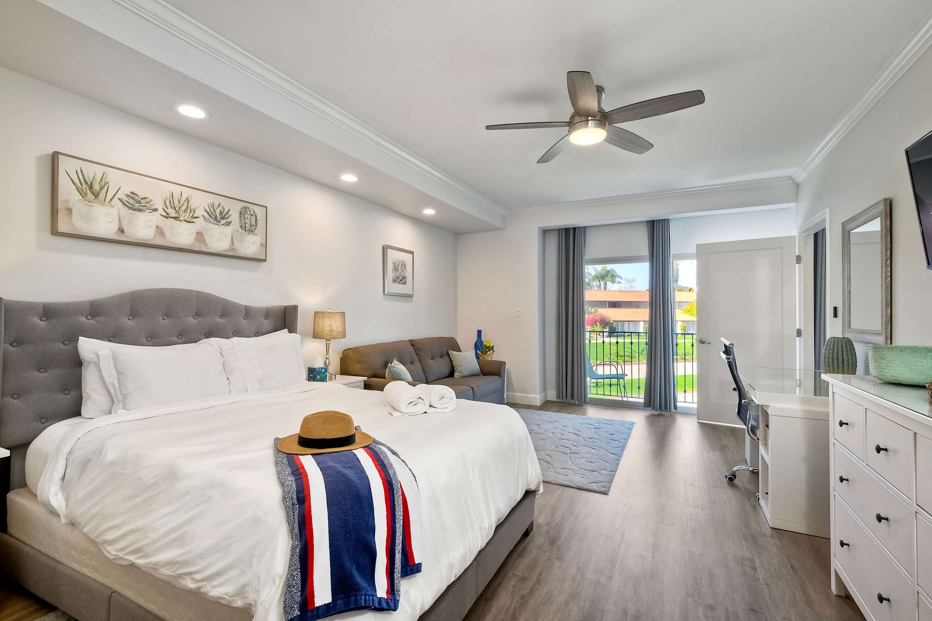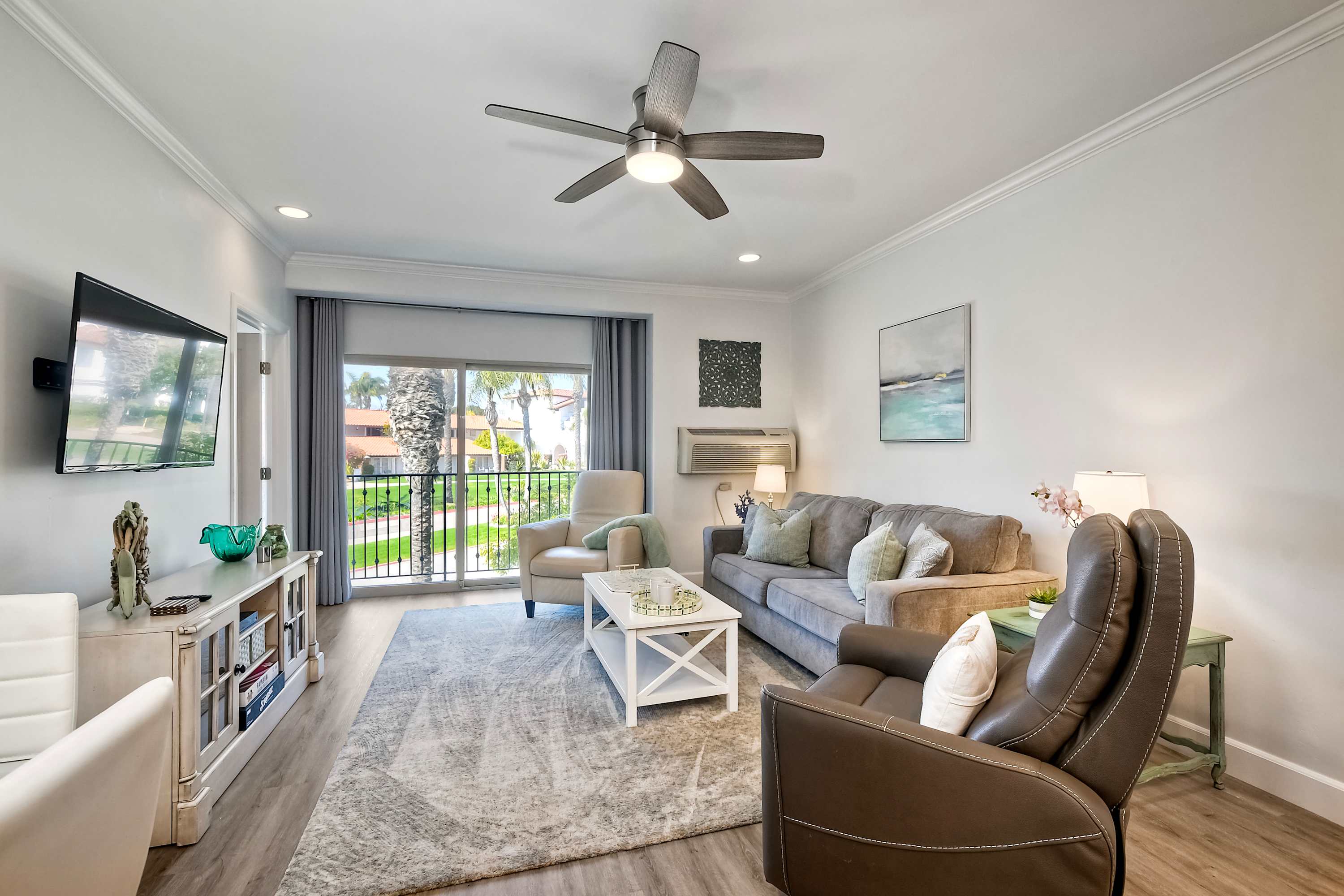 Step inside La Costa Gem where California beach vibes meet modern elegance. The living room invites you to relax with a comfortable sofa, stylish armchairs, and a smart TV for cozy movie nights. The fully equipped kitchen features sleek stainless steel appliances, modern white cabinets, and stone countertops, making it easy to prepare meals or morning coffee with the convenient Keurig. Dine at the table for four or enjoy casual seating at the kitchen counter for two. The bedroom offers a peaceful retreat, complete with a dedicated workspace for those who need to check in on work while enjoying their stay. After a day enjoying endless activities, pour yourself a glass of wine and enjoy the California breeze from your balcony.
