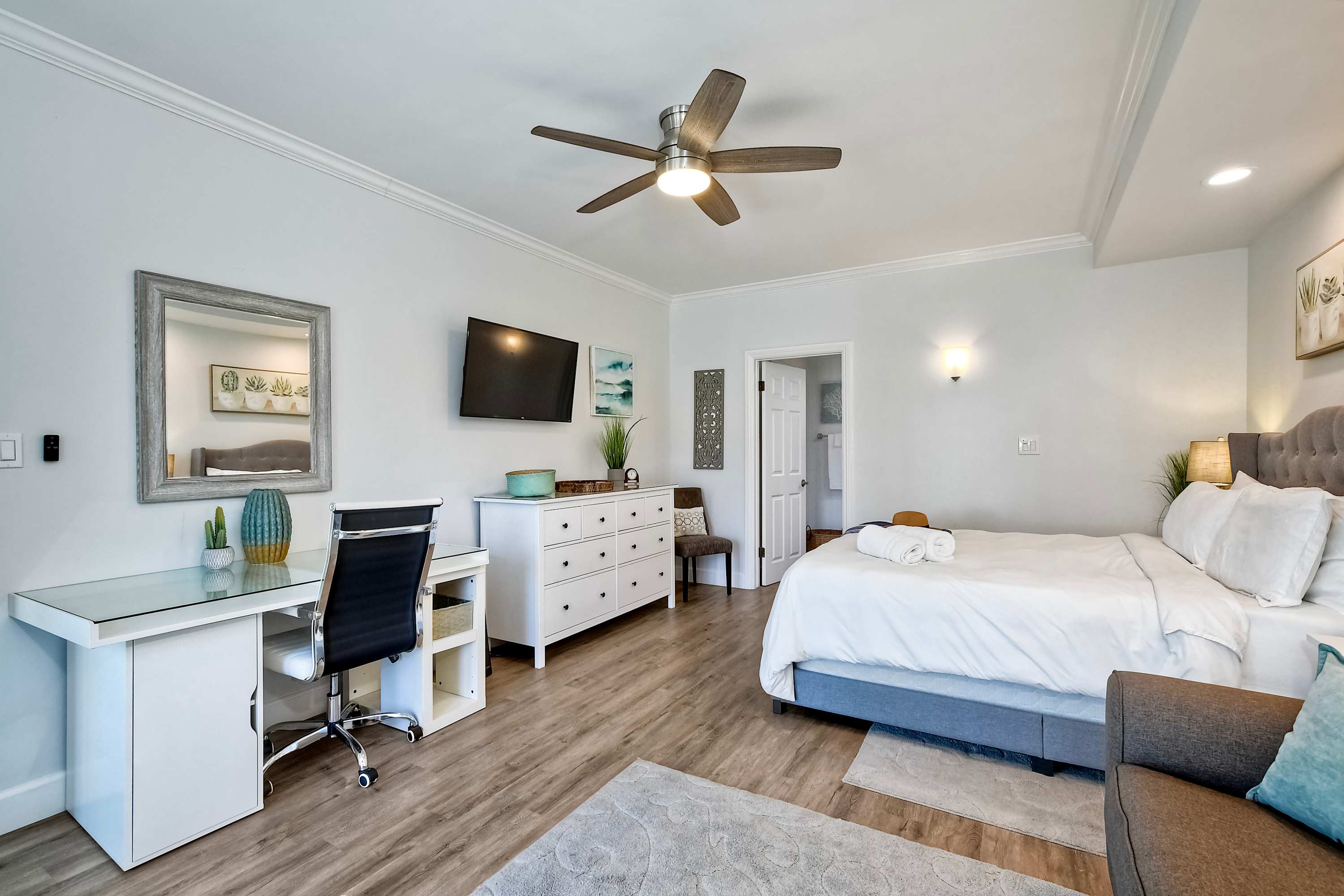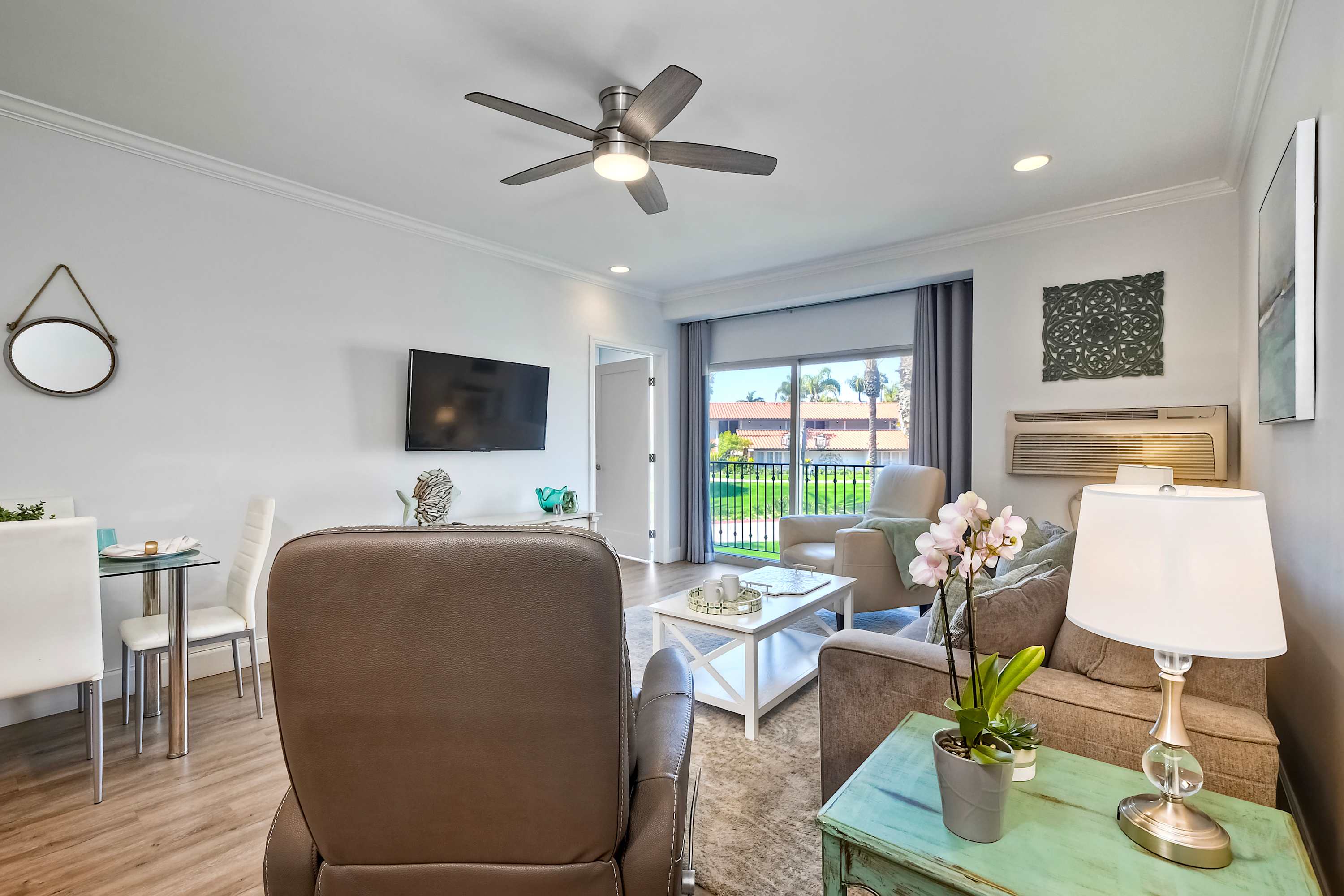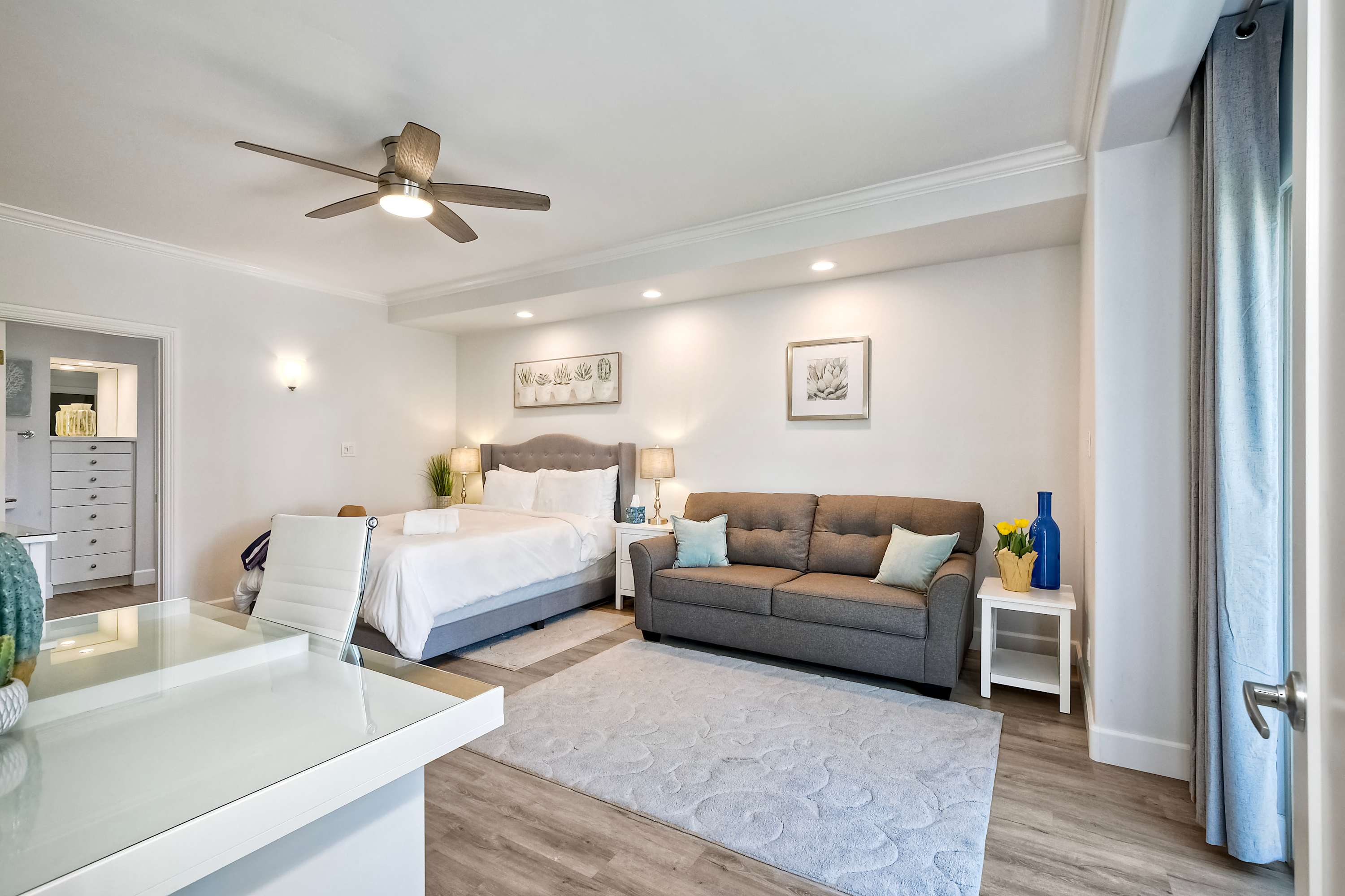 Step inside La Costa Gem where California beach vibes meet modern elegance. The living room invites you to relax with a comfortable sofa, stylish armchairs, and a smart TV for cozy movie nights. The fully equipped kitchen features sleek stainless steel appliances, modern white cabinets, and stone countertops, making it easy to prepare meals or morning coffee with the convenient Keurig. Dine at the table for four or enjoy casual seating at the kitchen counter for two. The bedroom offers a peaceful retreat, complete with a dedicated workspace for those who need to check in on work while enjoying their stay. After a day enjoying endless activities, pour yourself a glass of wine and enjoy the California breeze from your balcony.