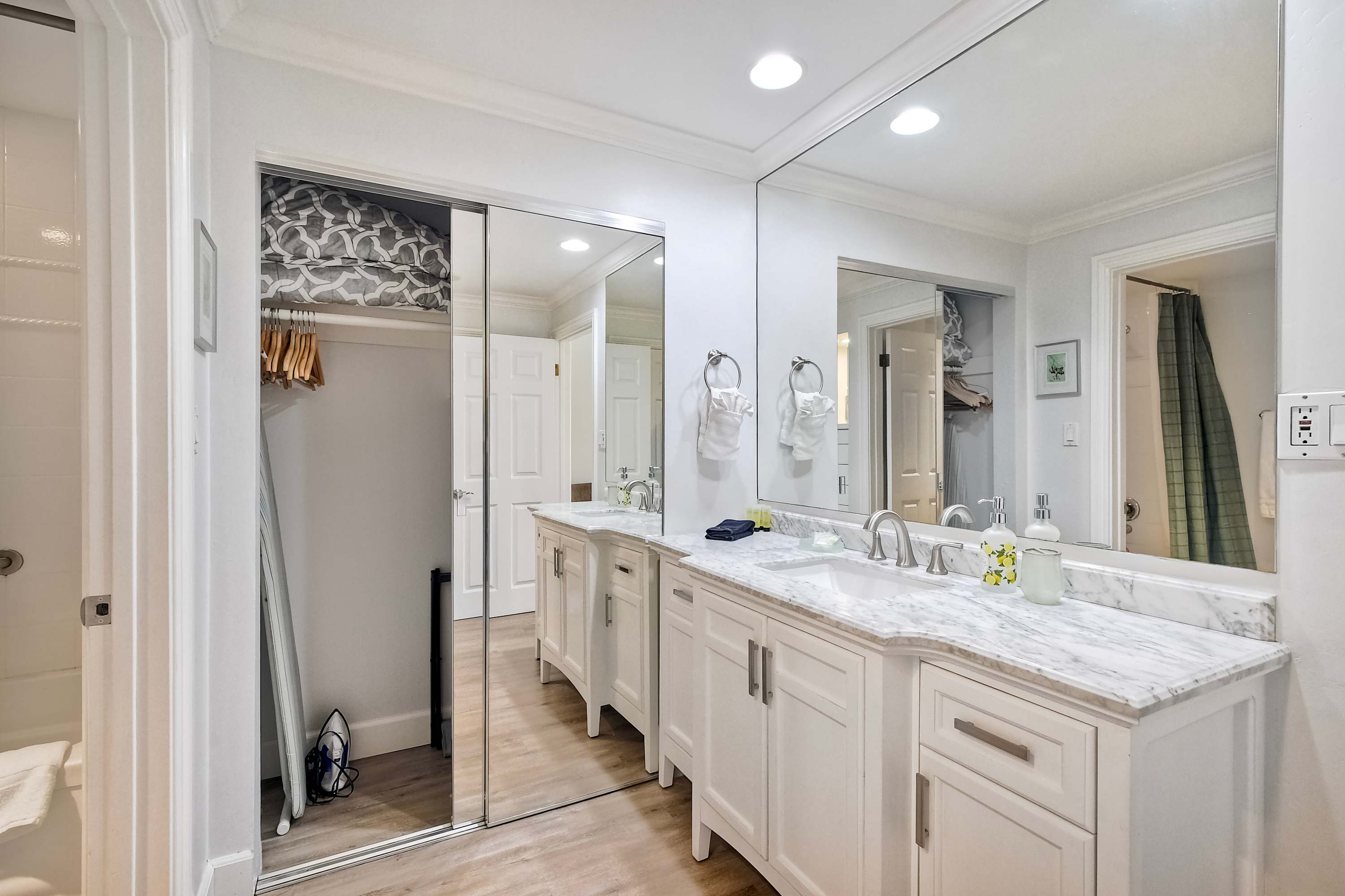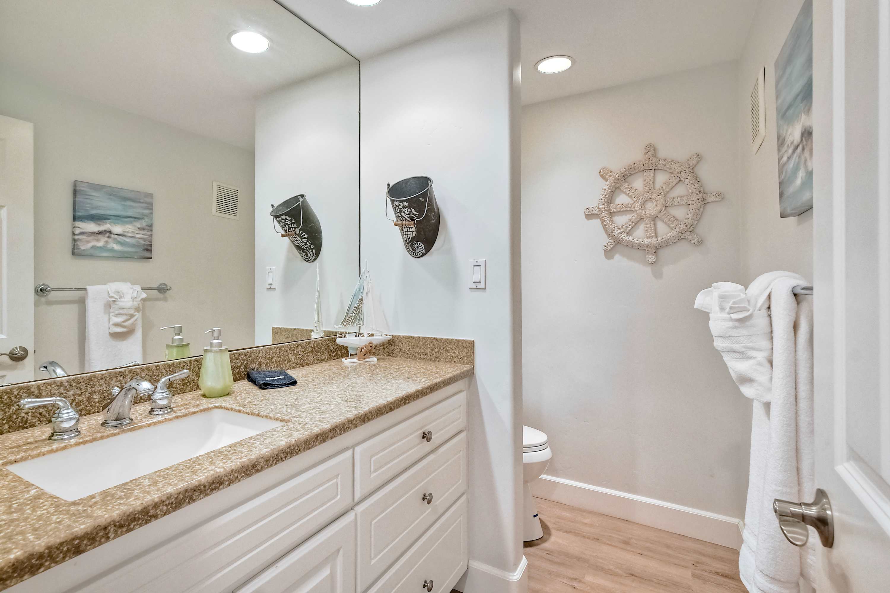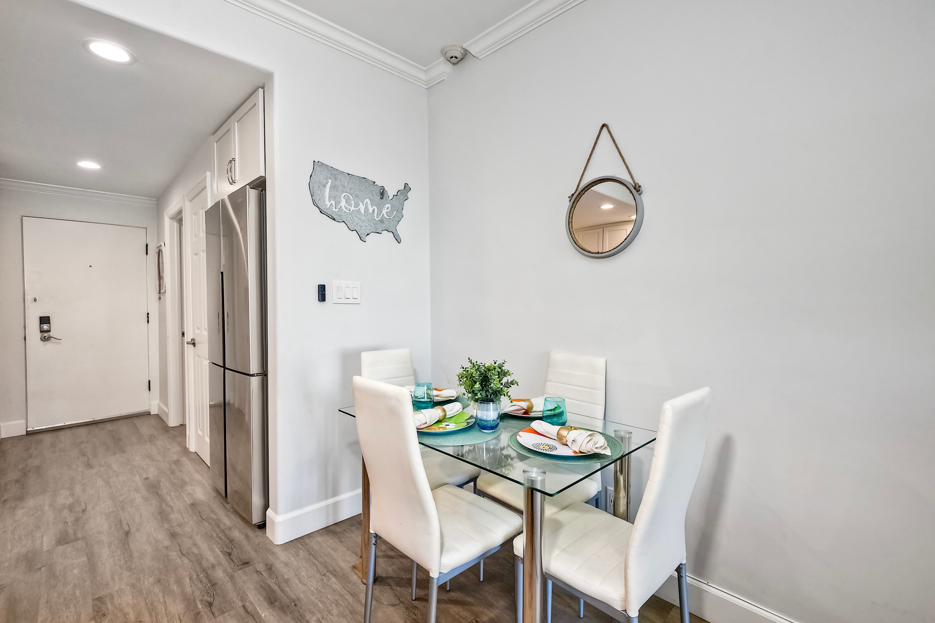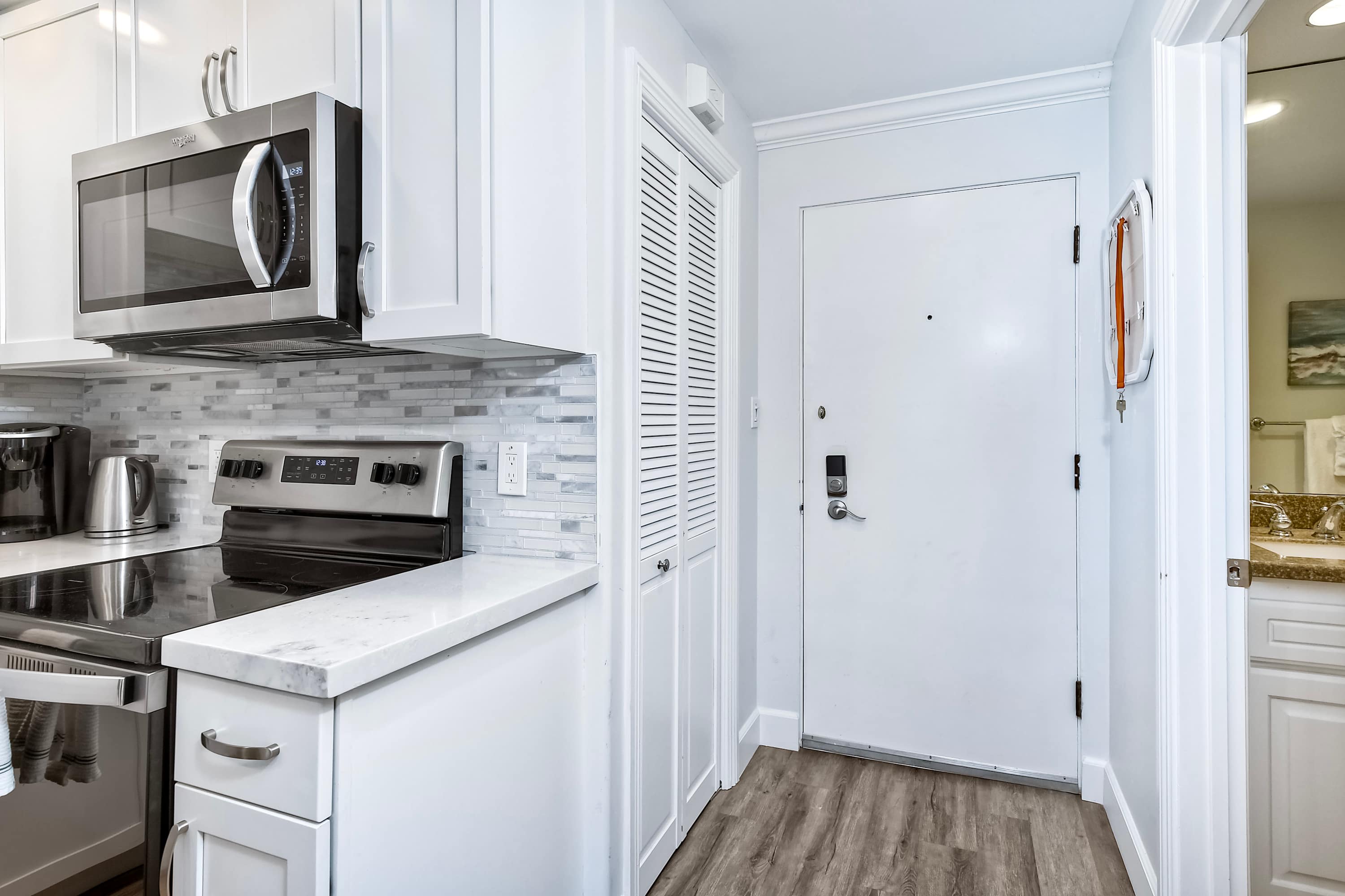 Step inside La Costa Gem where California beach vibes meet modern elegance. The living room invites you to relax with a comfortable sofa, stylish armchairs, and a smart TV for cozy movie nights. The fully equipped kitchen features sleek stainless steel appliances, modern white cabinets, and stone countertops, making it easy to prepare meals or morning coffee with the convenient Keurig. Dine at the table for four or enjoy casual seating at the kitchen counter for two. The bedroom offers a peaceful retreat, complete with a dedicated workspace for those who need to check in on work while enjoying their stay. After a day enjoying endless activities, pour yourself a glass of wine and enjoy the California breeze from your balcony.