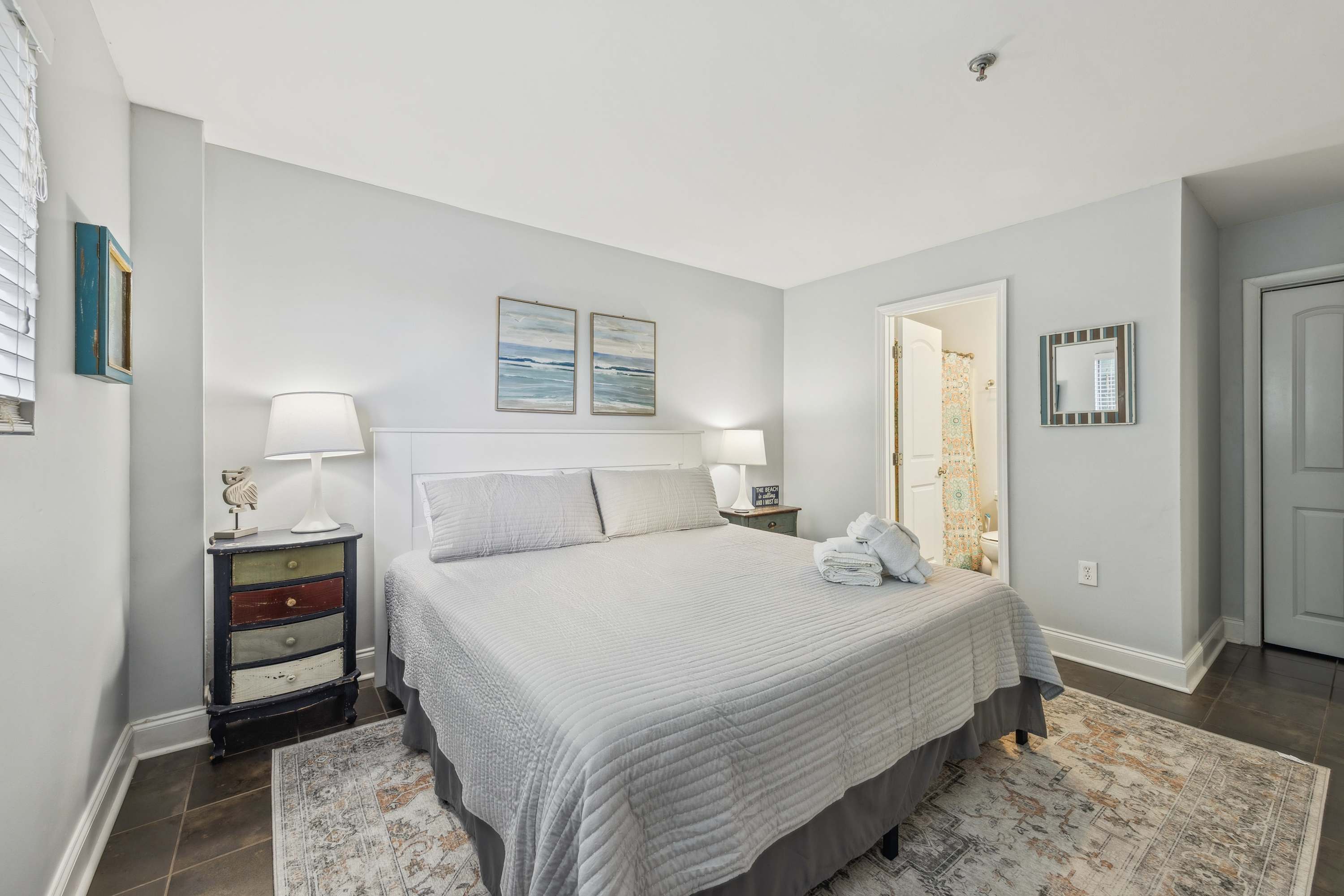 • Bedroom 1: King bed, Smart TV, ensuite bathroom with a single vanity and shower/tub combo. Sleeps 2.