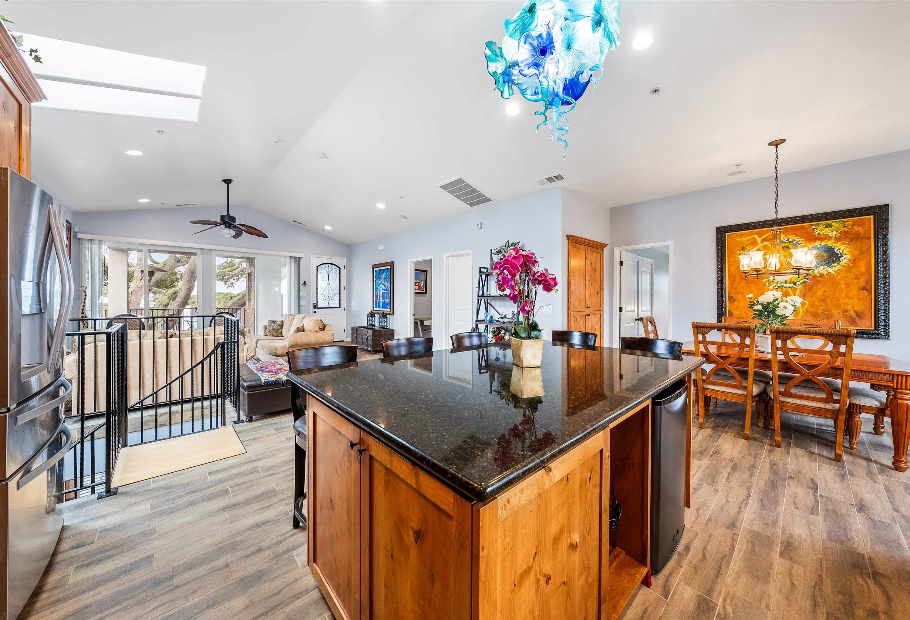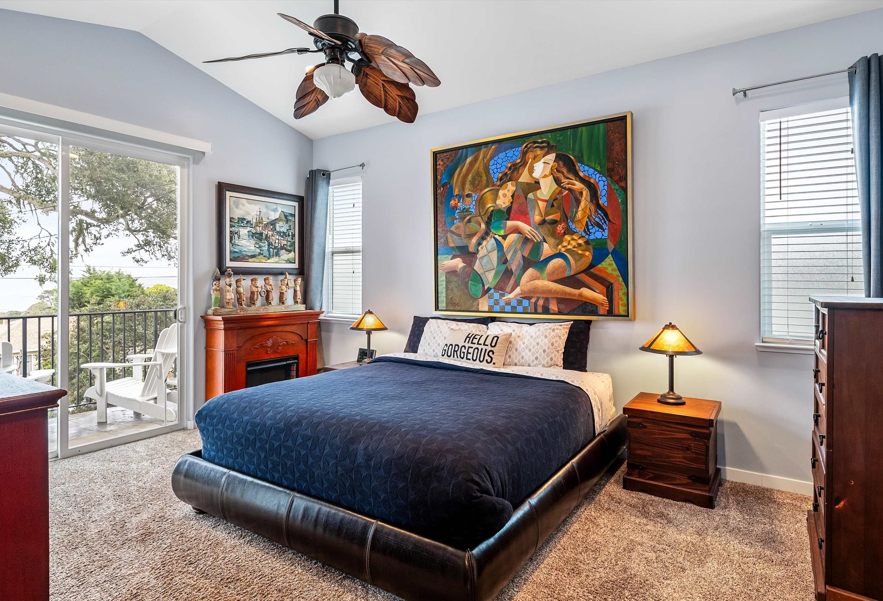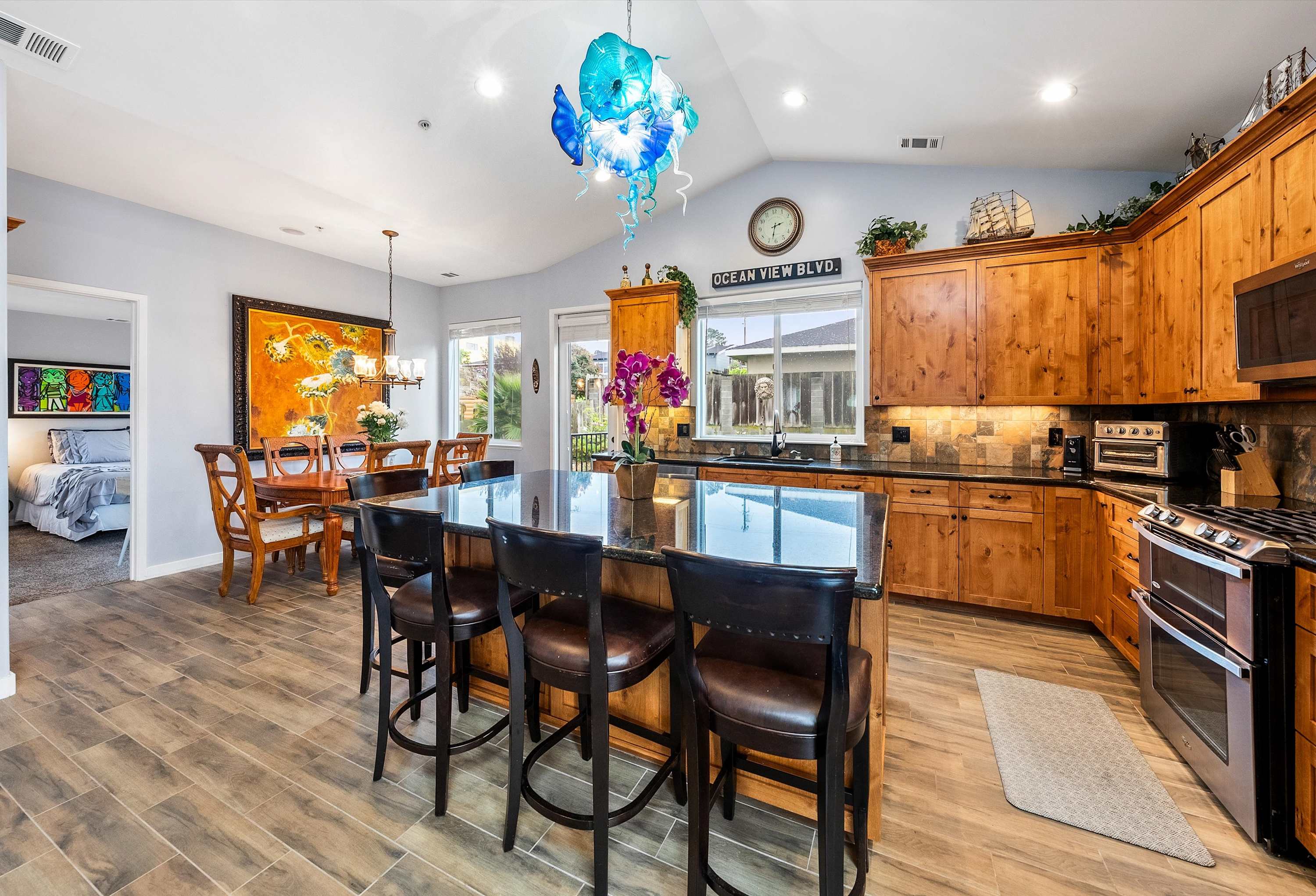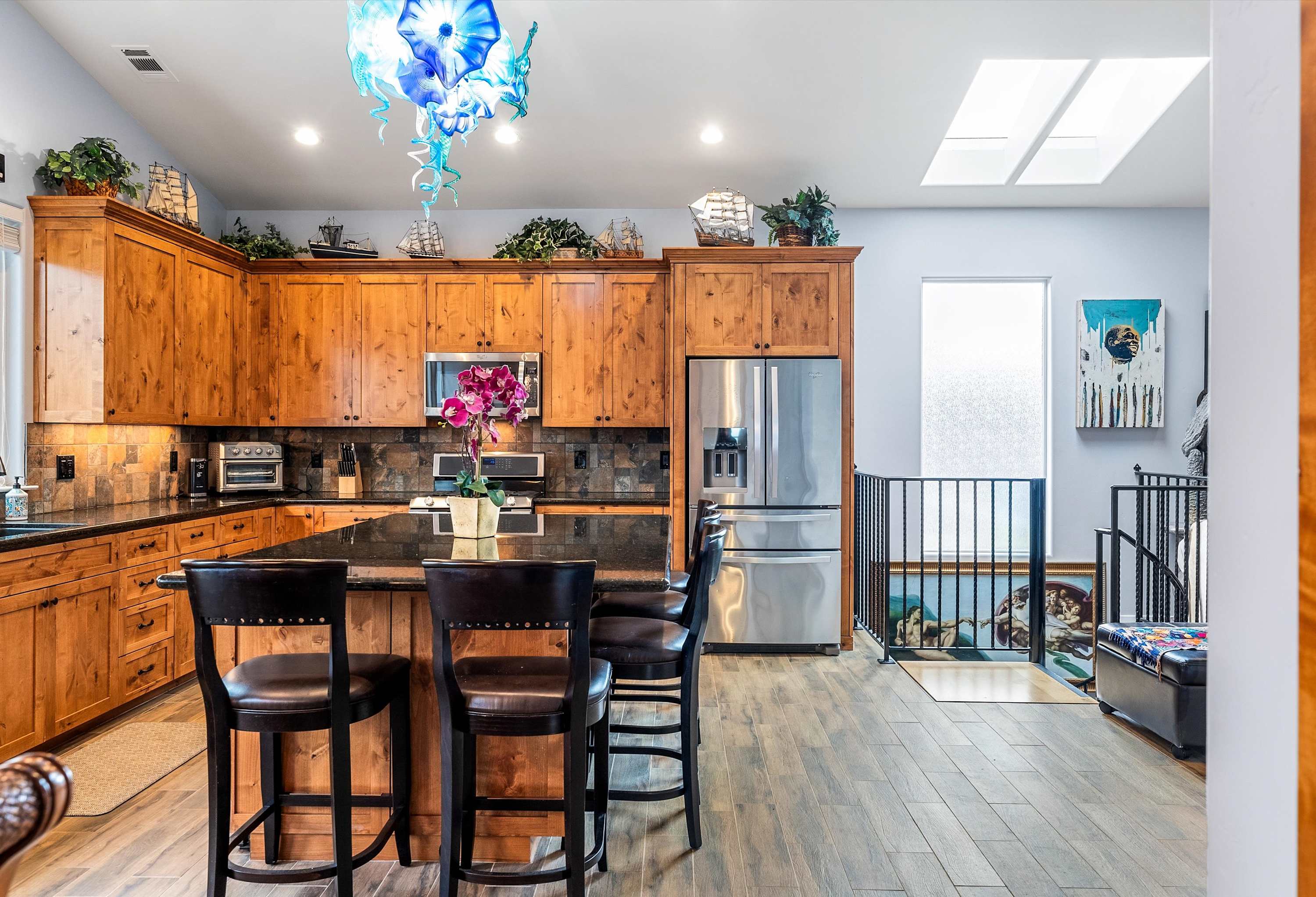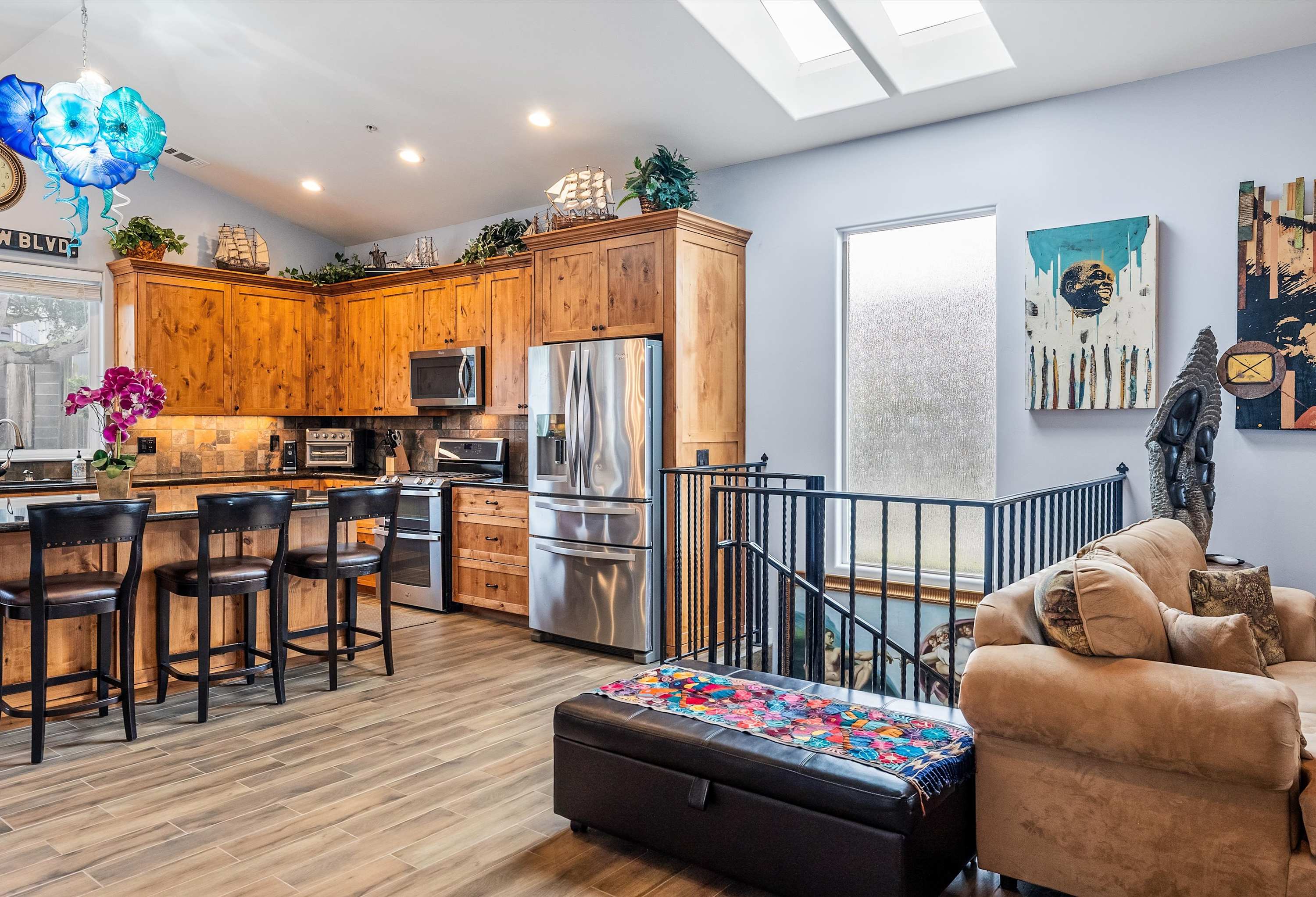 Step inside, and you’ll immediately feel welcomed by the warm and inviting living room. Two cozy chairs, a love seat, and a plush couch surround a fireplace, creating the perfect spot to unwind together while streaming a family favorite on the smart TV. Sliding glass doors lead to the deck with comfortable seating and a grill — ideal for enjoying alfresco meals while taking in the coastal breeze. The fully equipped kitchen boasts rustic wood cabinets, sleek stainless steel appliances, and black countertops, offering ample space for meal preparation. Gather at the island with seating for five to enjoy your morning coffee from the drip coffee maker, or sit down for a family dinner at the dining table for six.