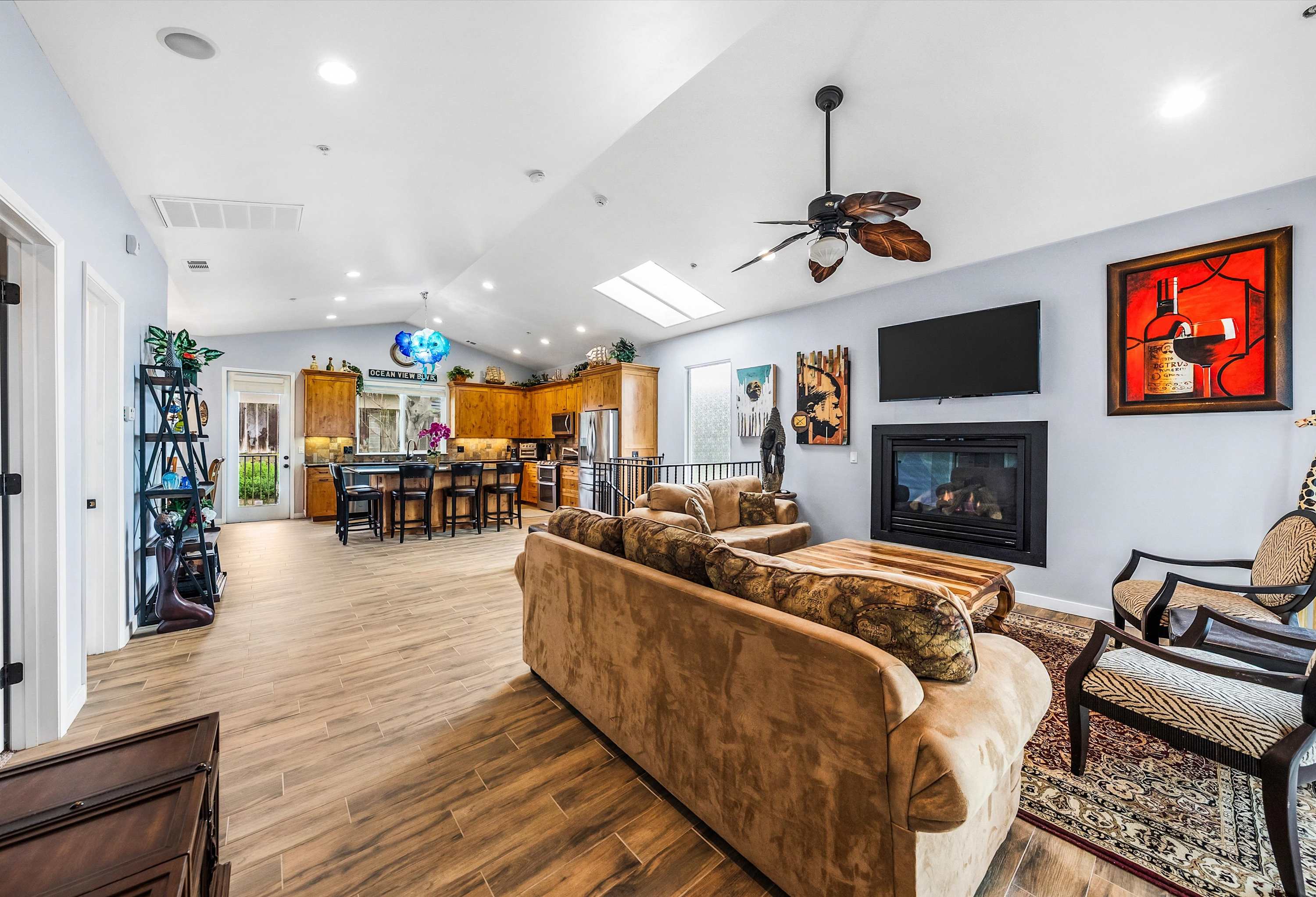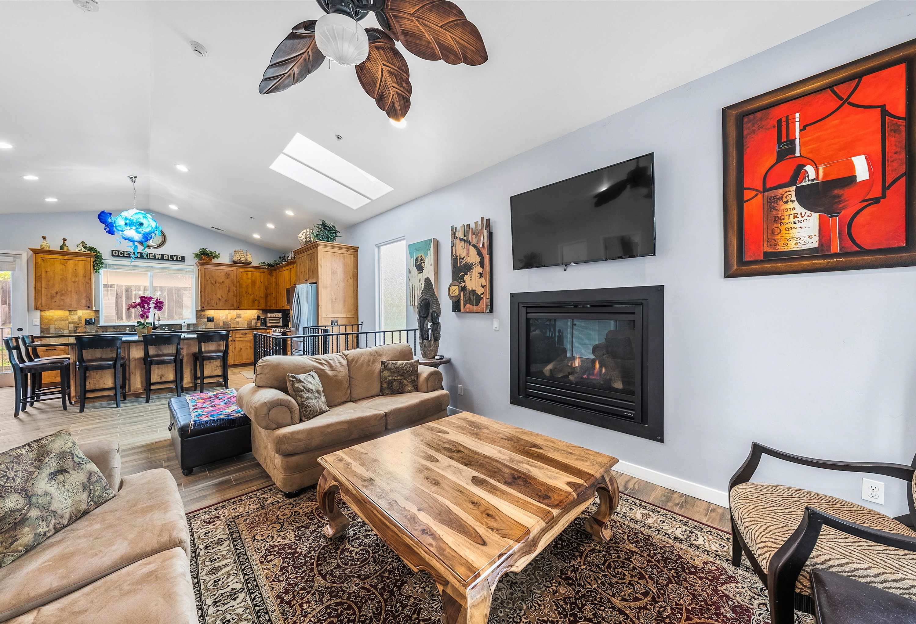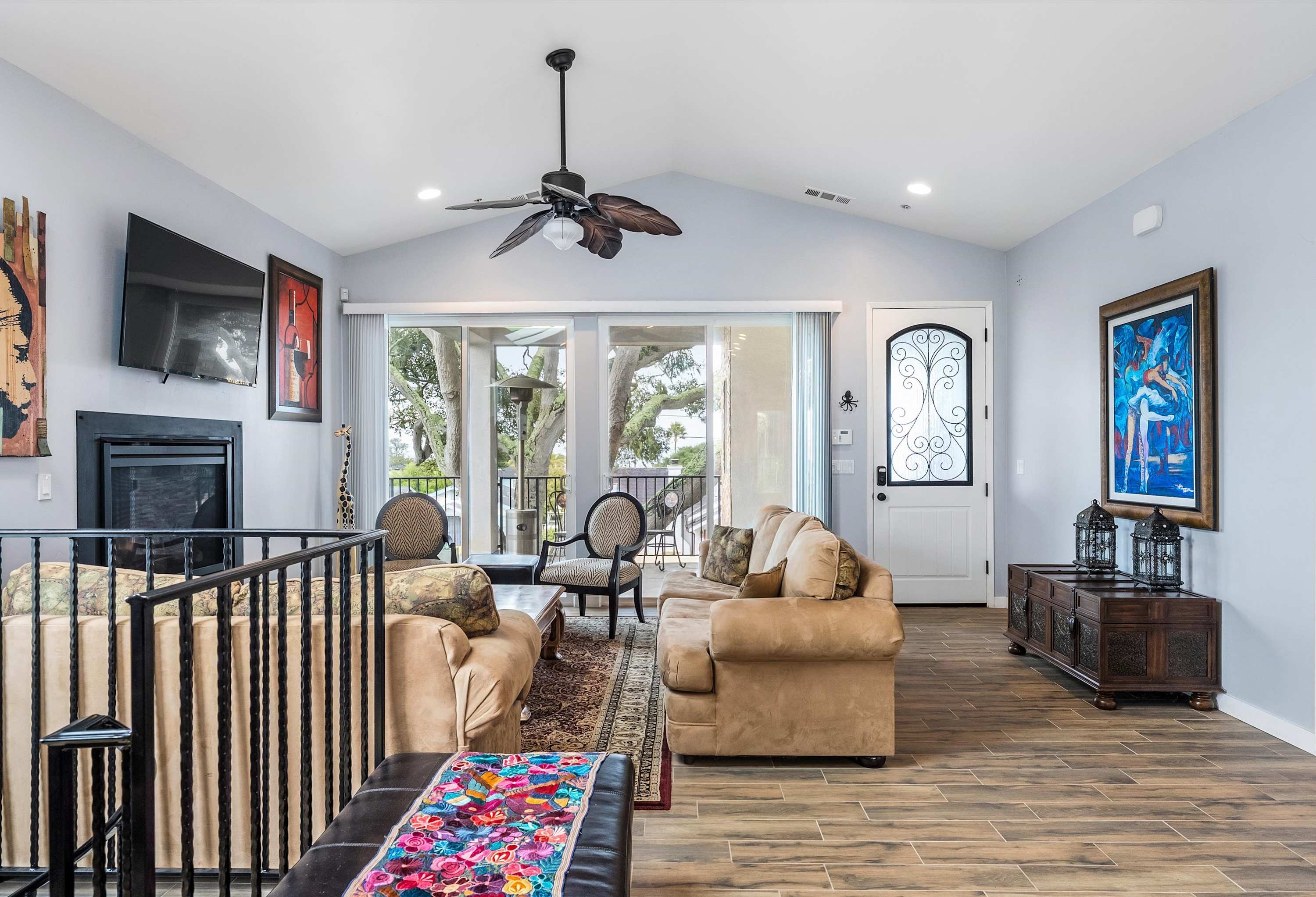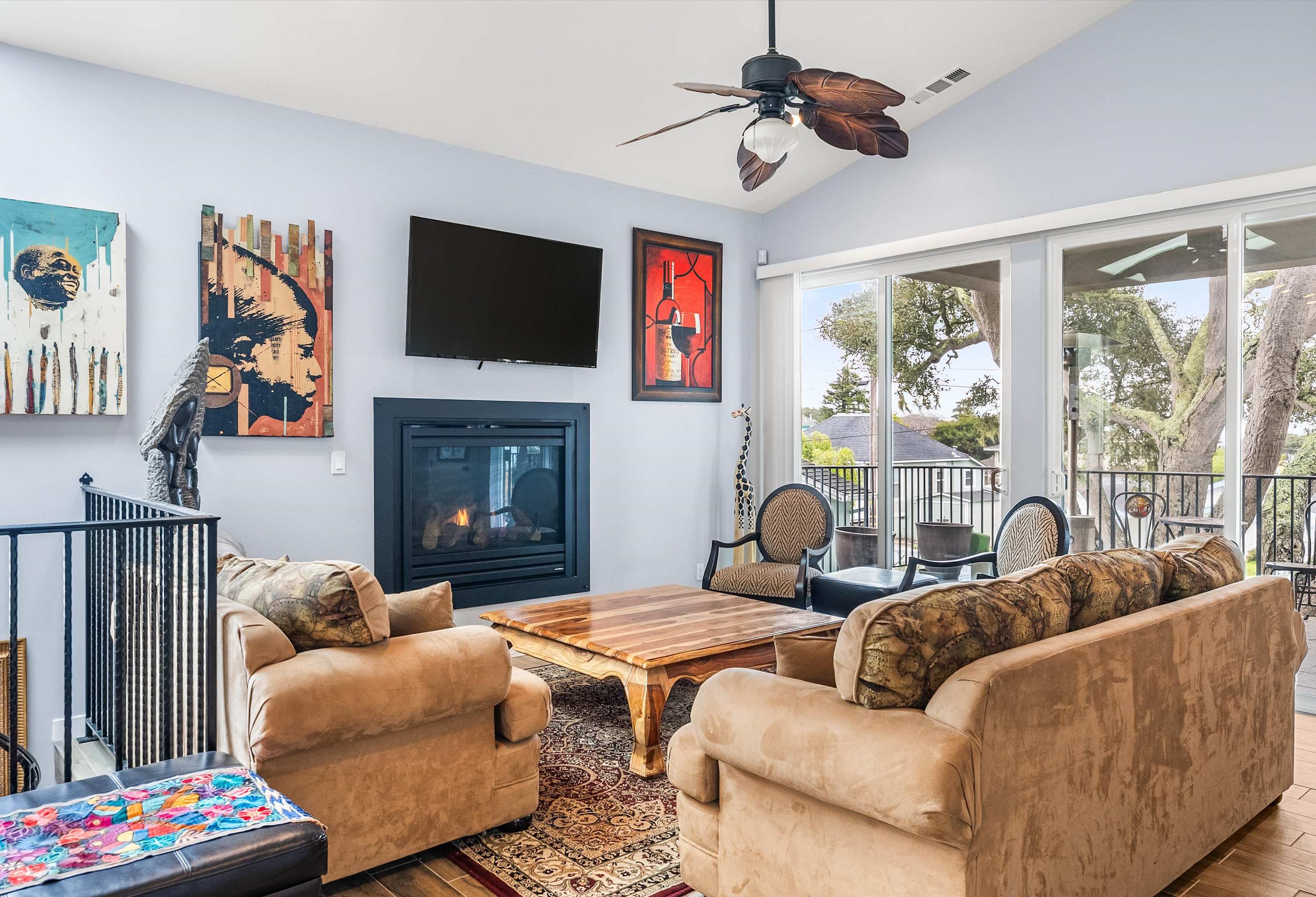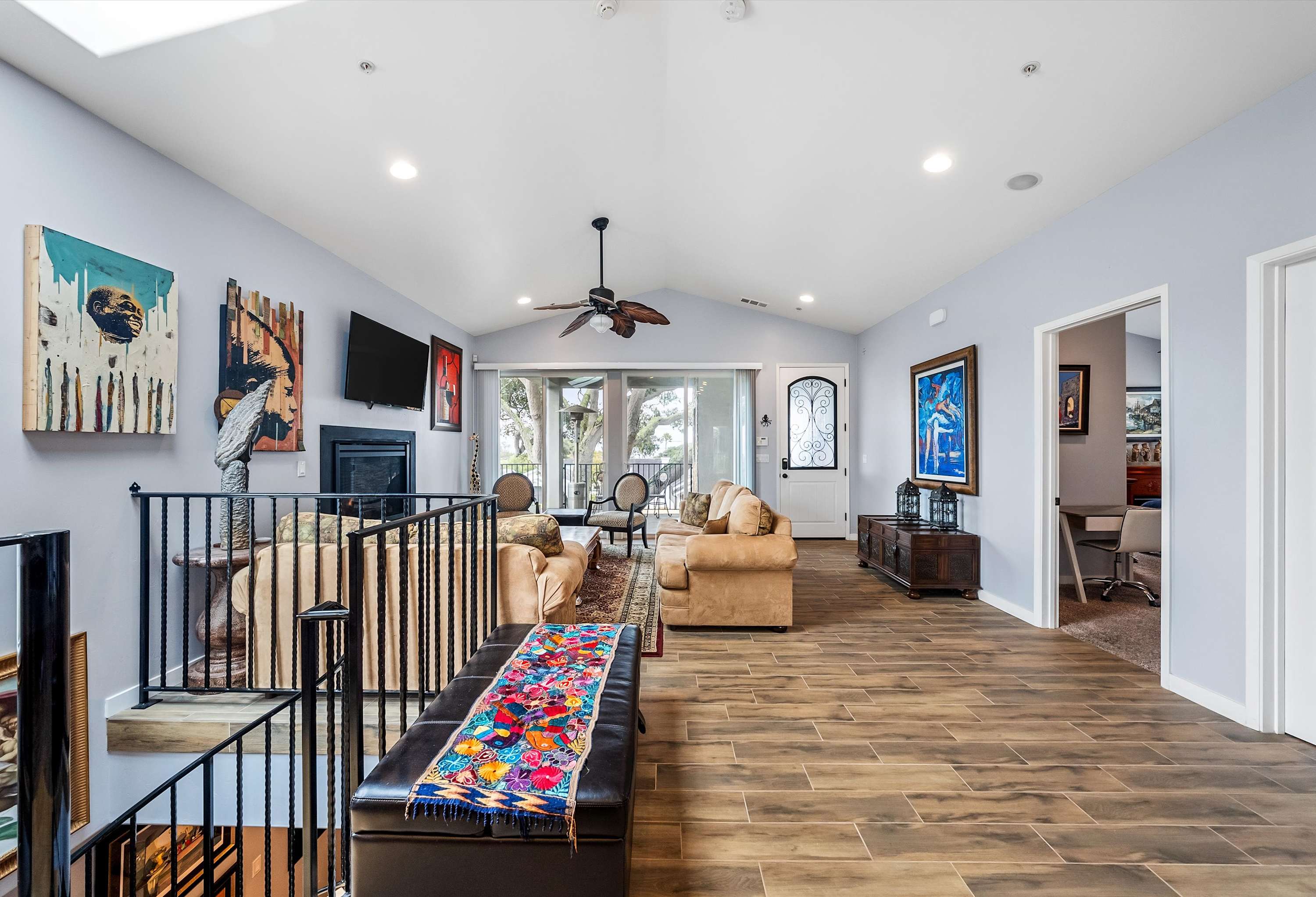 Step inside, and you’ll immediately feel welcomed by the warm and inviting living room. Two cozy chairs, a love seat, and a plush couch surround a fireplace, creating the perfect spot to unwind together while streaming a family favorite on the smart TV. Sliding glass doors lead to the deck with comfortable seating and a grill — ideal for enjoying alfresco meals while taking in the coastal breeze. The fully equipped kitchen boasts rustic wood cabinets, sleek stainless steel appliances, and black countertops, offering ample space for meal preparation. Gather at the island with seating for five to enjoy your morning coffee from the drip coffee maker, or sit down for a family dinner at the dining table for six.