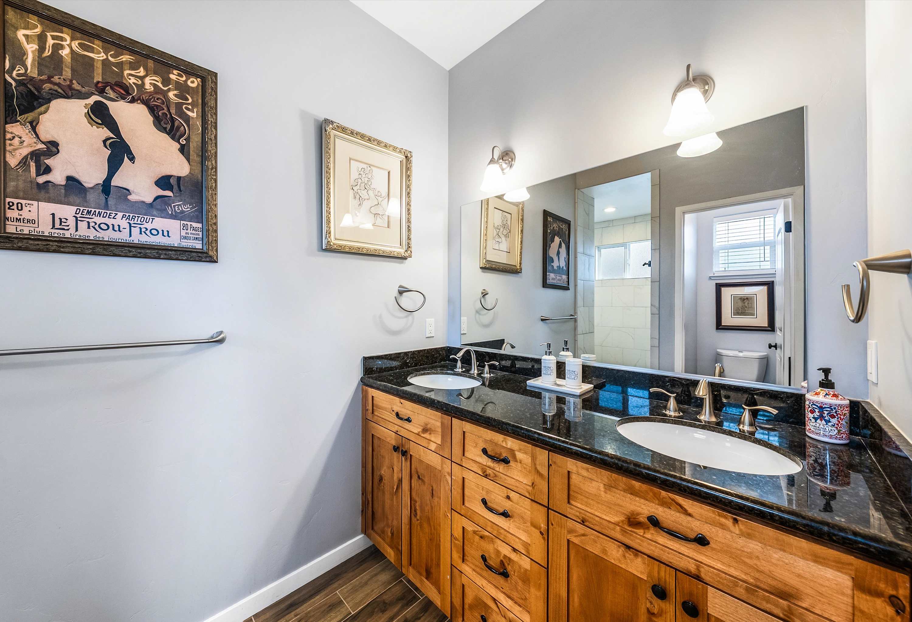 The home also includes a half bathroom and an additional full guest bathroom with a single vanity and a shower/tub combo.