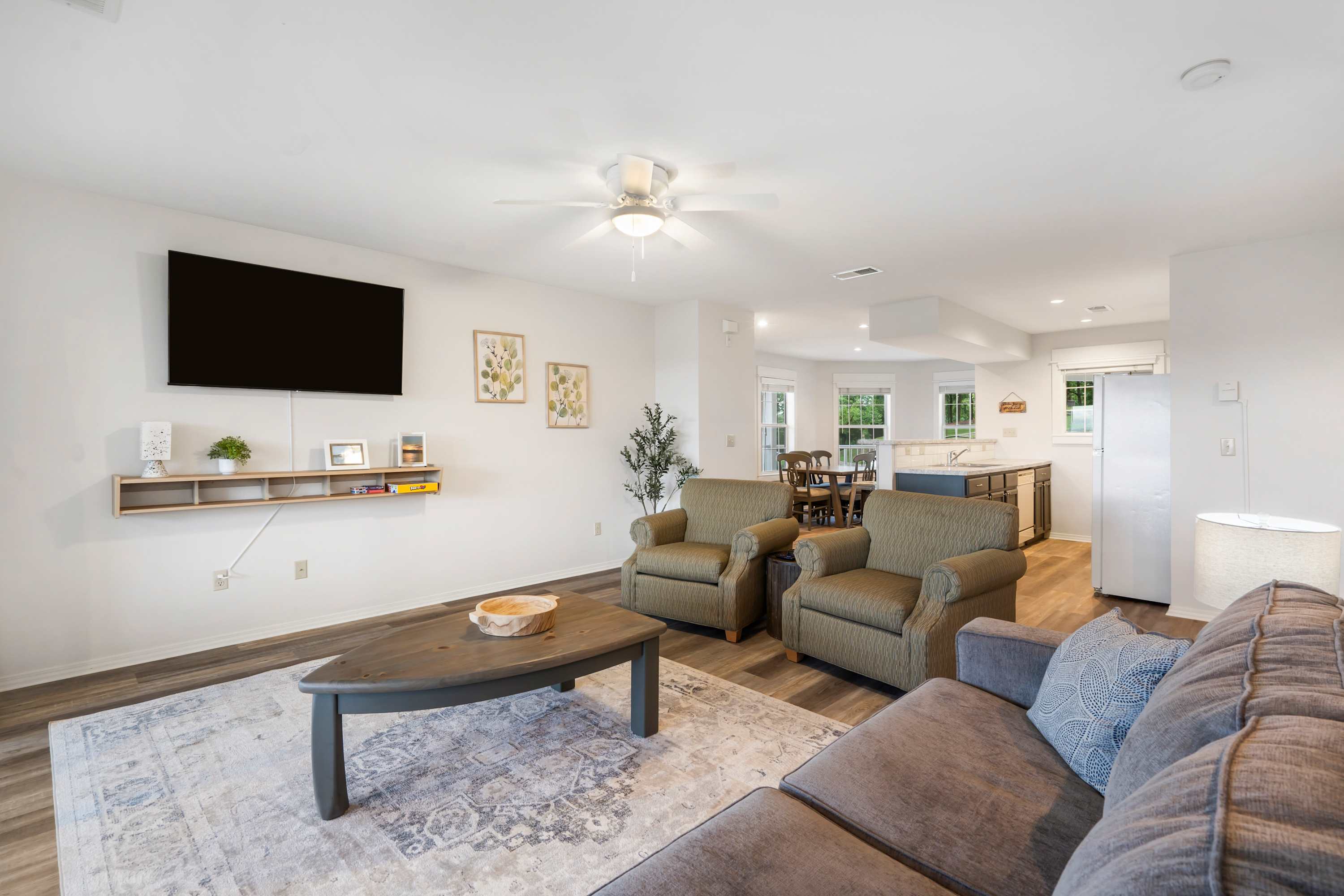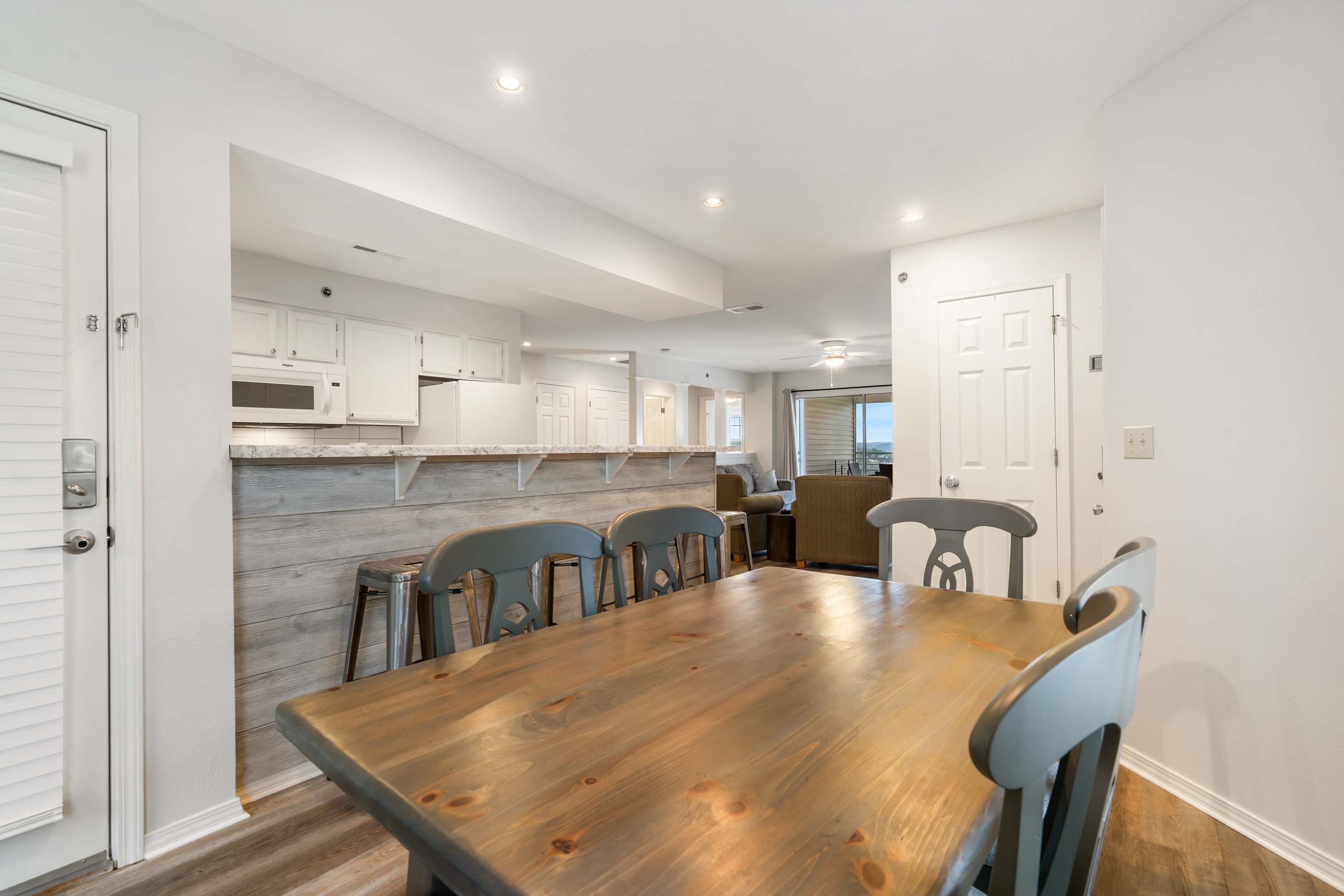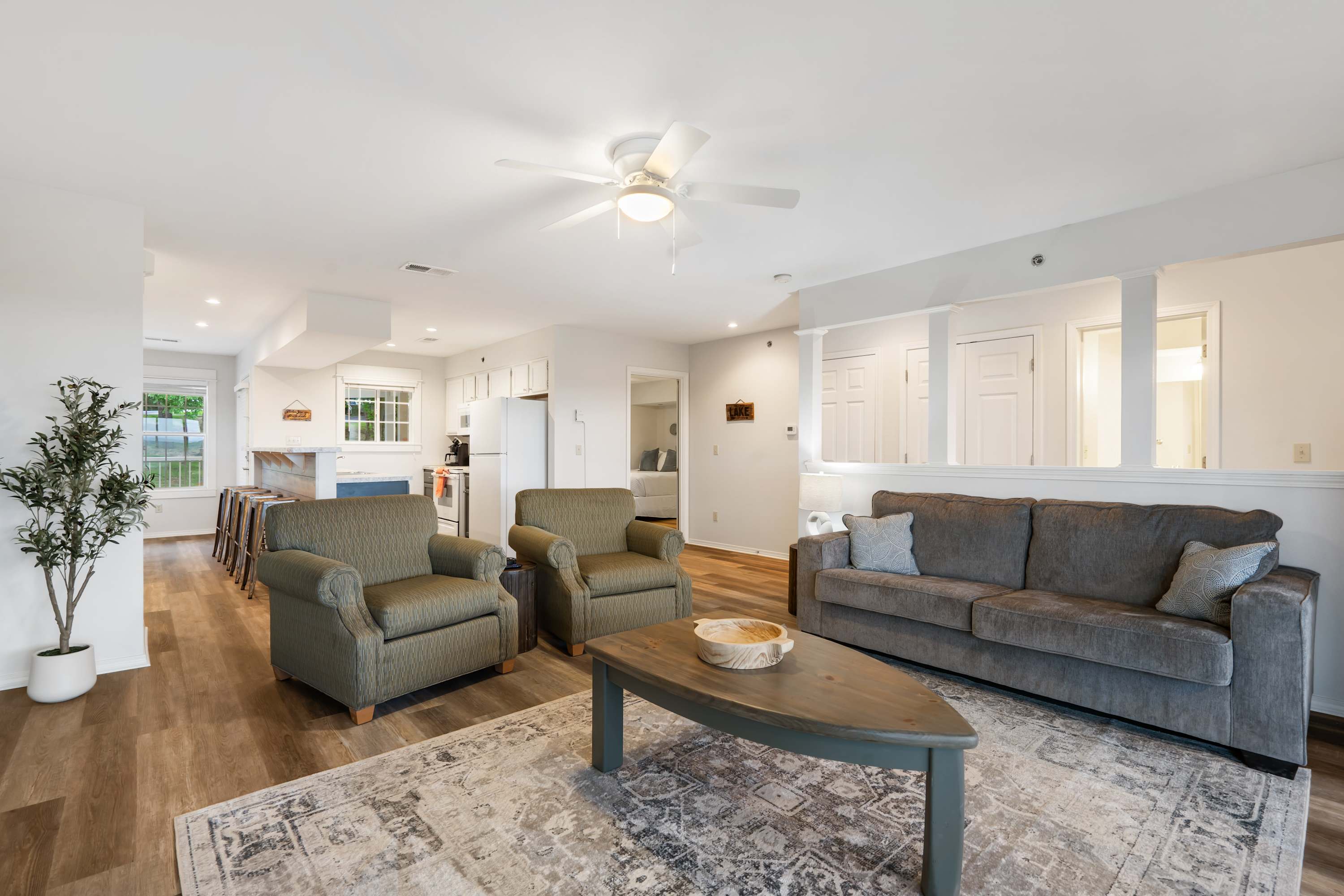 Inside, Ozark Mountain Oasis is designed for both comfort and convenience, making it an excellent choice for families and groups. The open-concept kitchen features white appliances, counter seating for four, and a drip/Keurig combo coffee maker, ensuring you can start your mornings with the perfect cup of coffee. The dining table comfortably seats six, providing a great space for meals and conversation. In the living room, you’ll find a cozy sofa, two armchairs, and a smart TV—ideal for movie nights or relaxing after a day on the water.