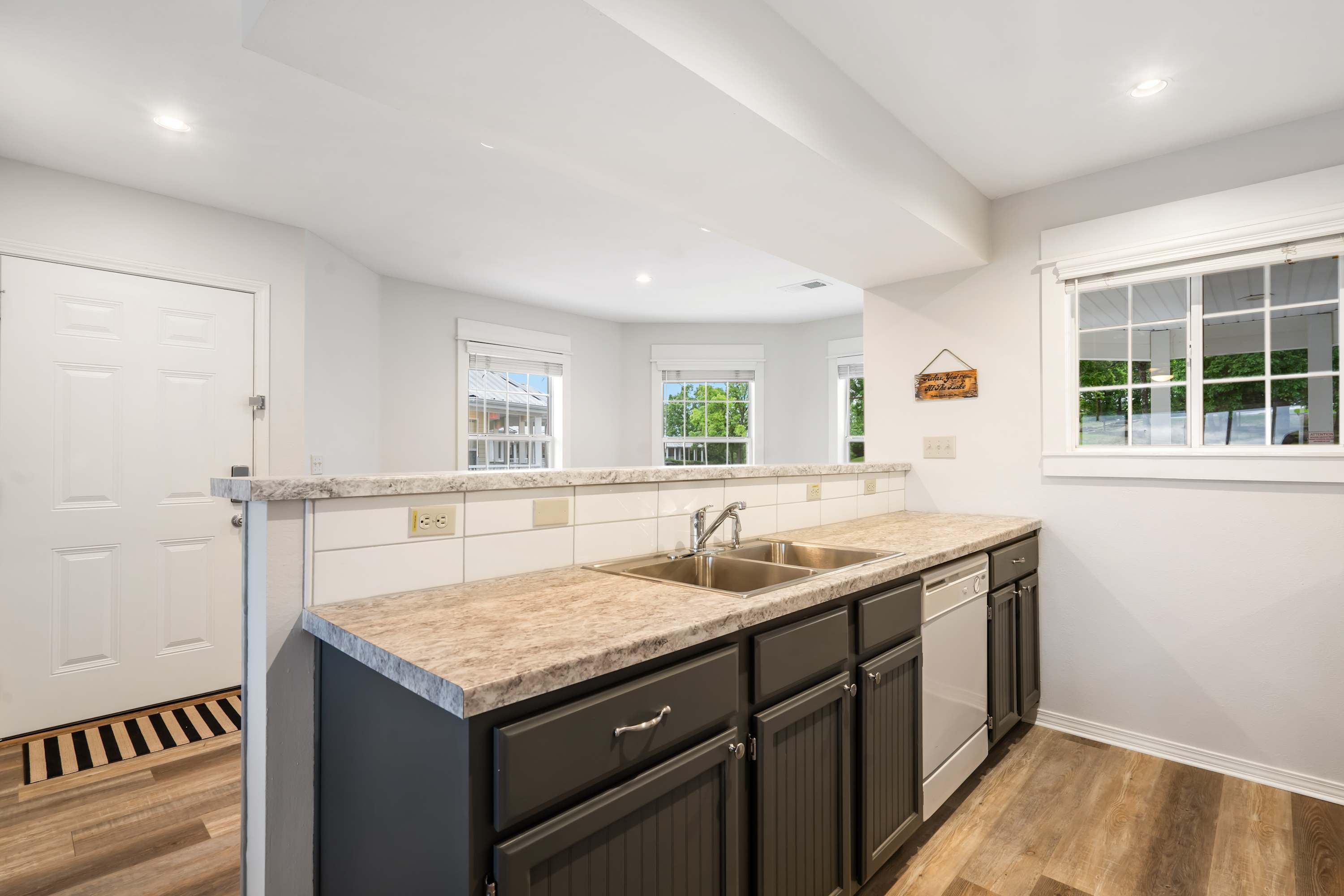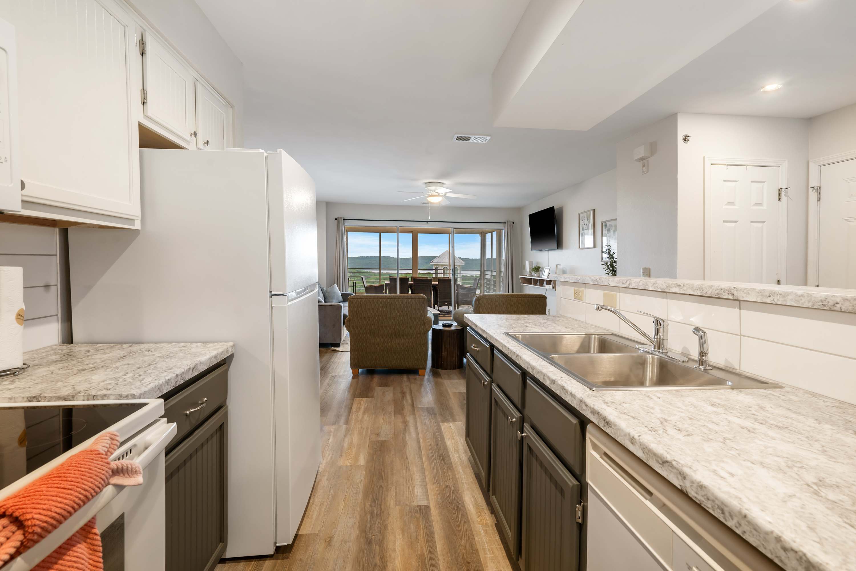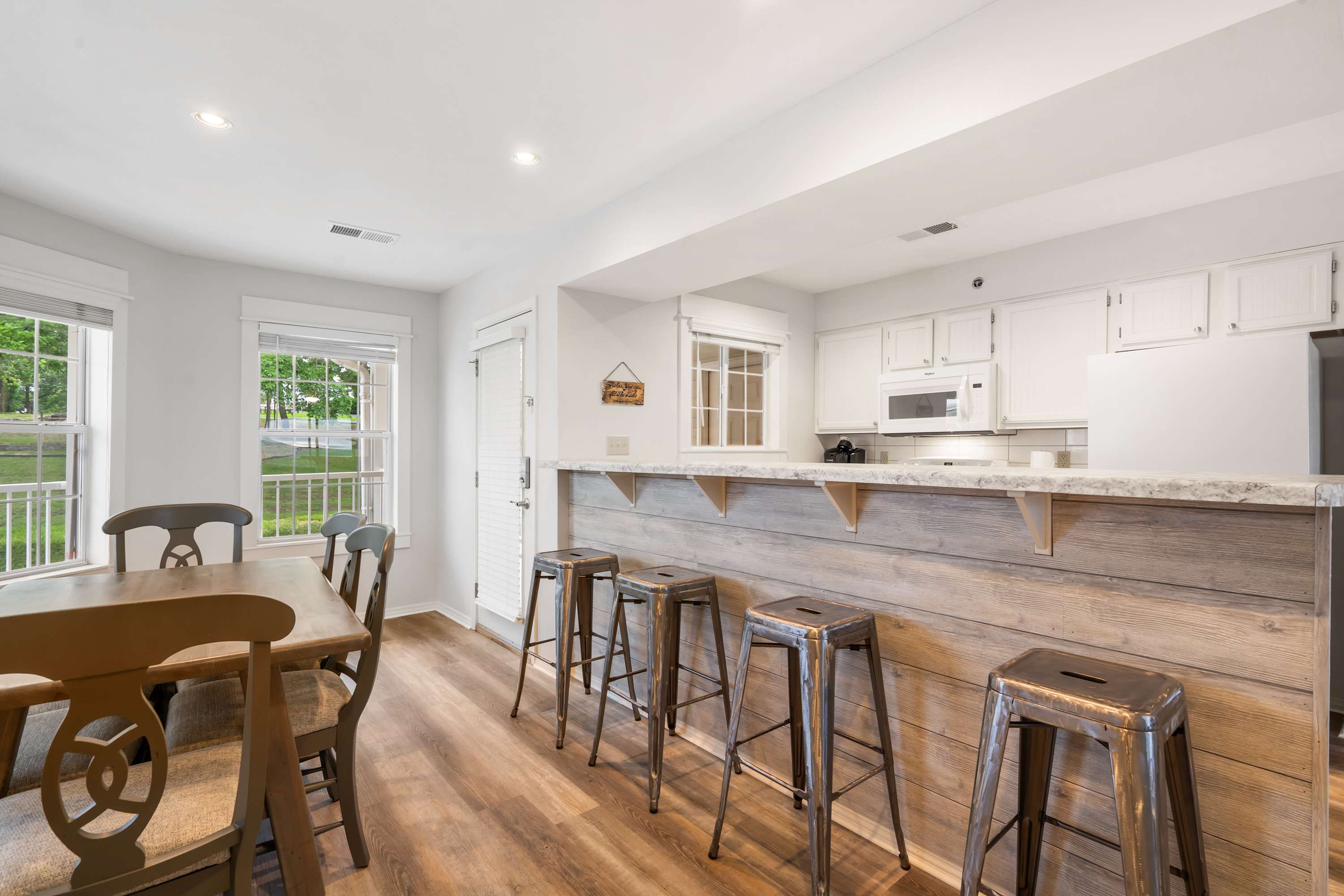 Inside, Ozark Mountain Oasis is designed for both comfort and convenience, making it an excellent choice for families and groups. The open-concept kitchen features white appliances, counter seating for four, and a drip/Keurig combo coffee maker, ensuring you can start your mornings with the perfect cup of coffee. The dining table comfortably seats six, providing a great space for meals and conversation. In the living room, you’ll find a cozy sofa, two armchairs, and a smart TV—ideal for movie nights or relaxing after a day on the water.