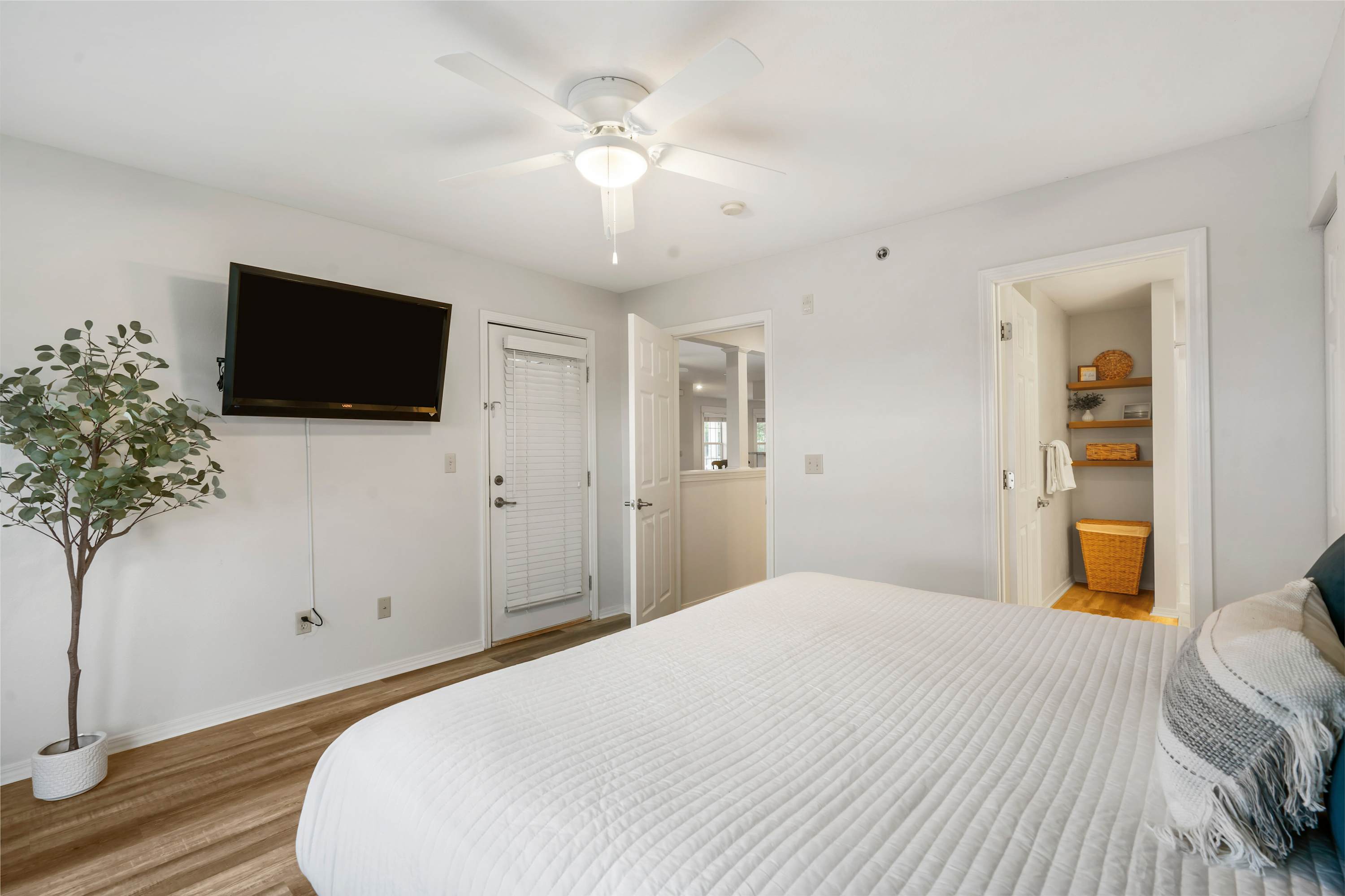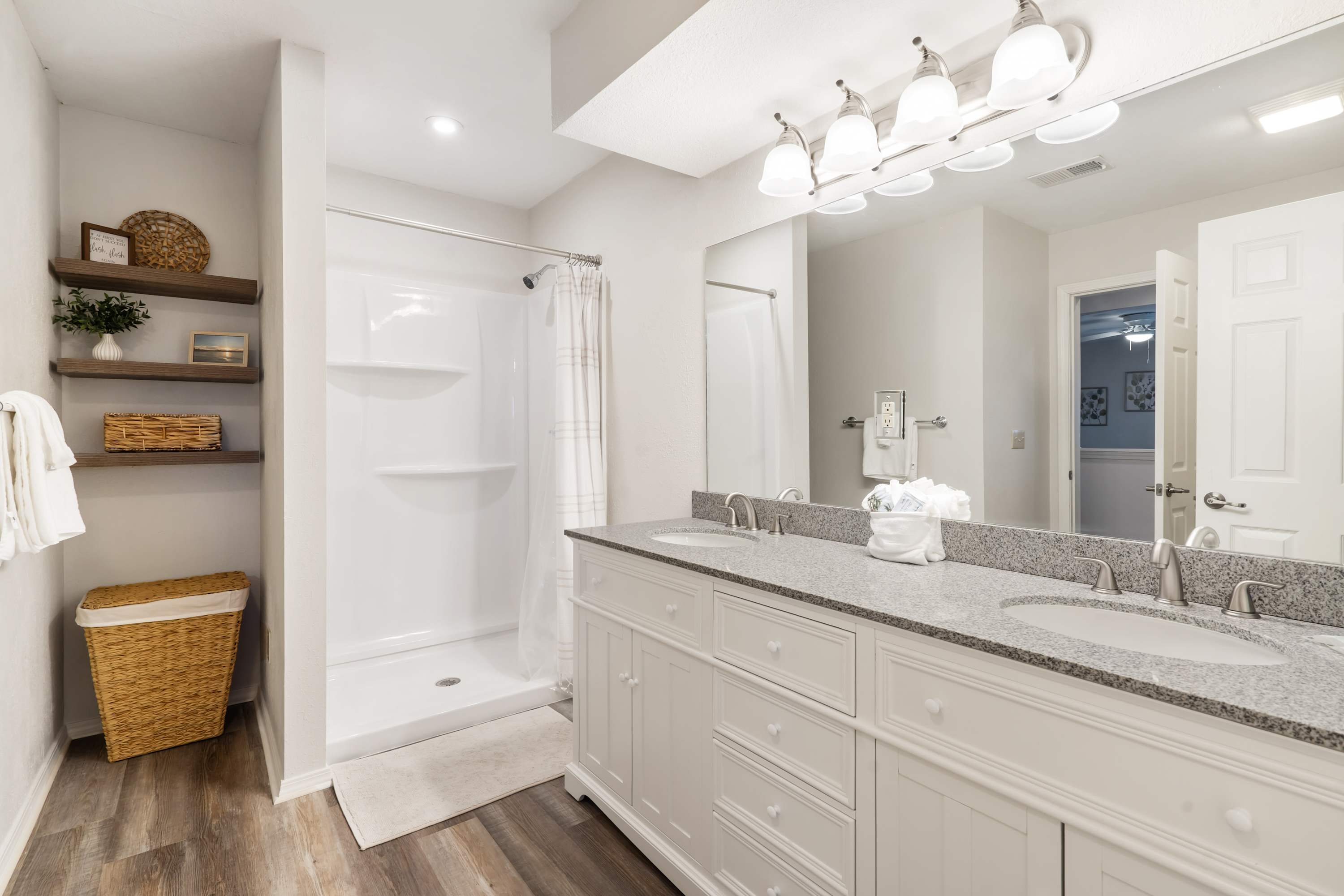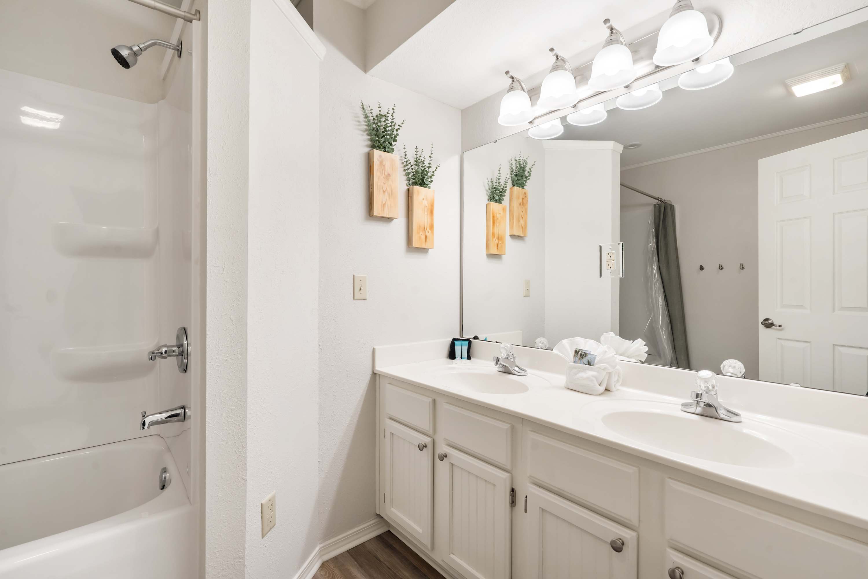 Bedroom #1 includes a king size bed, a twin size bed, a smart TV, and an ensuite bathroom with a dual vanity and a shower/tub combo.
