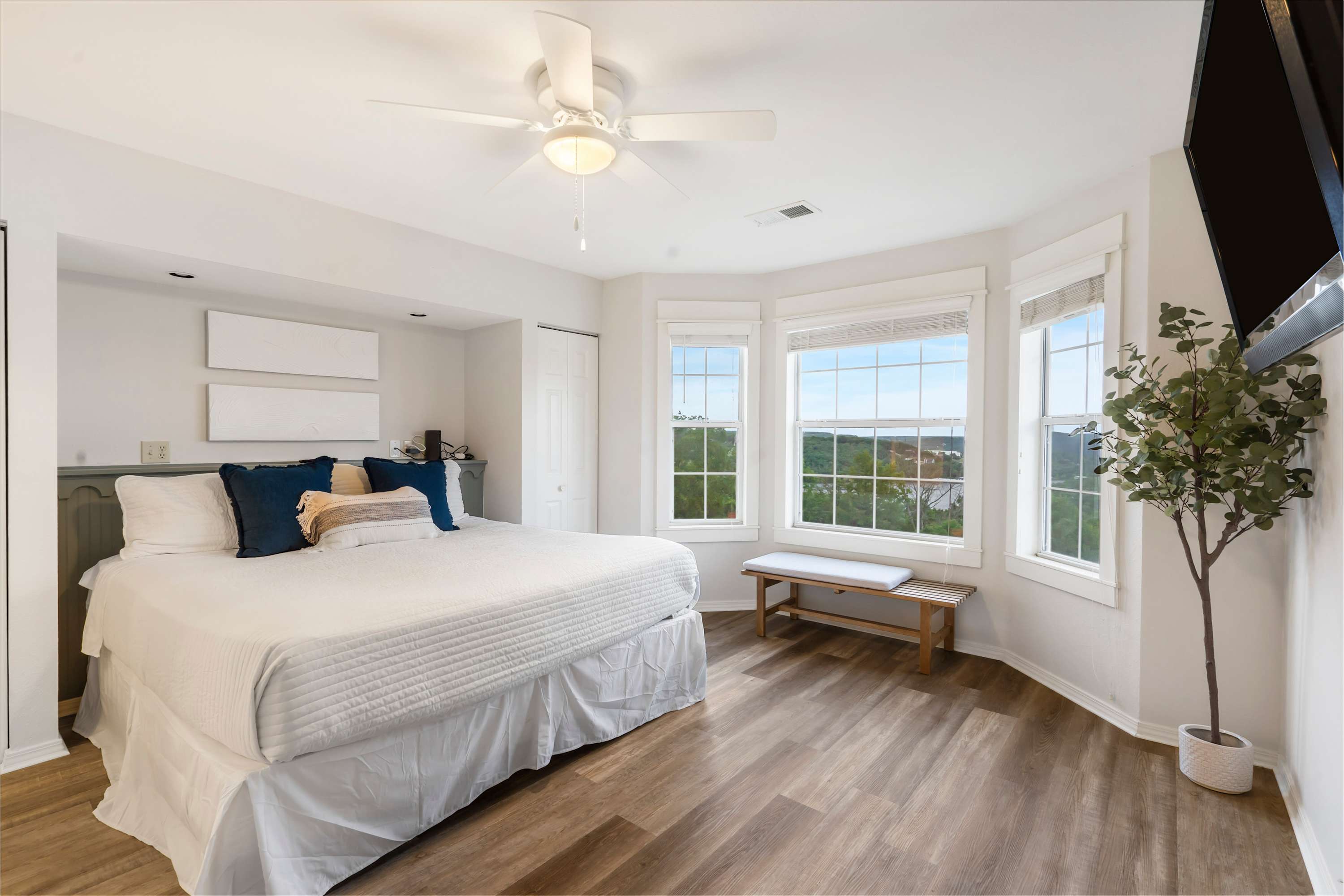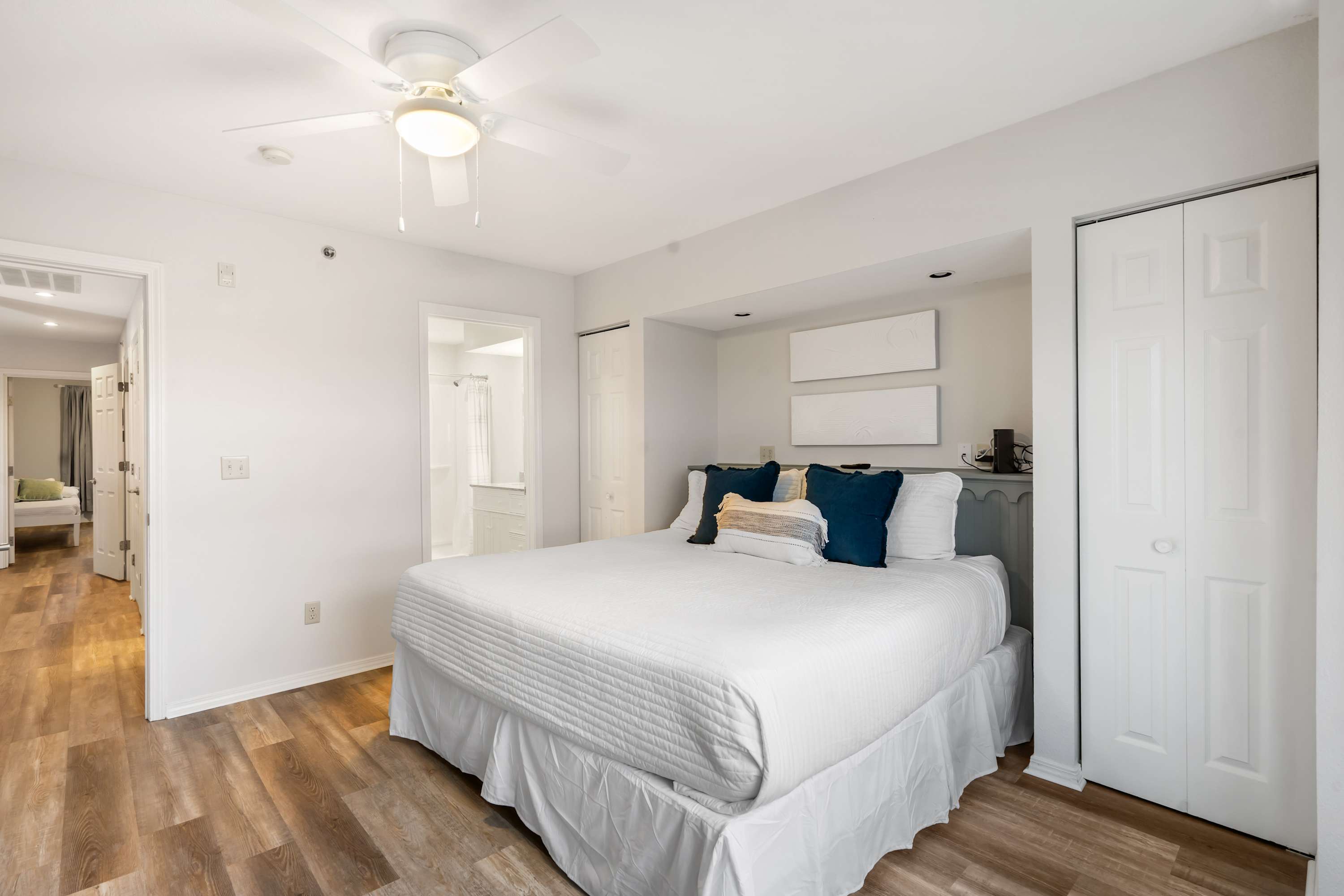 Bedroom #2 includes a king size bed, deck access, and an ensuite bathroom with a dual vanity and a walk-in shower.