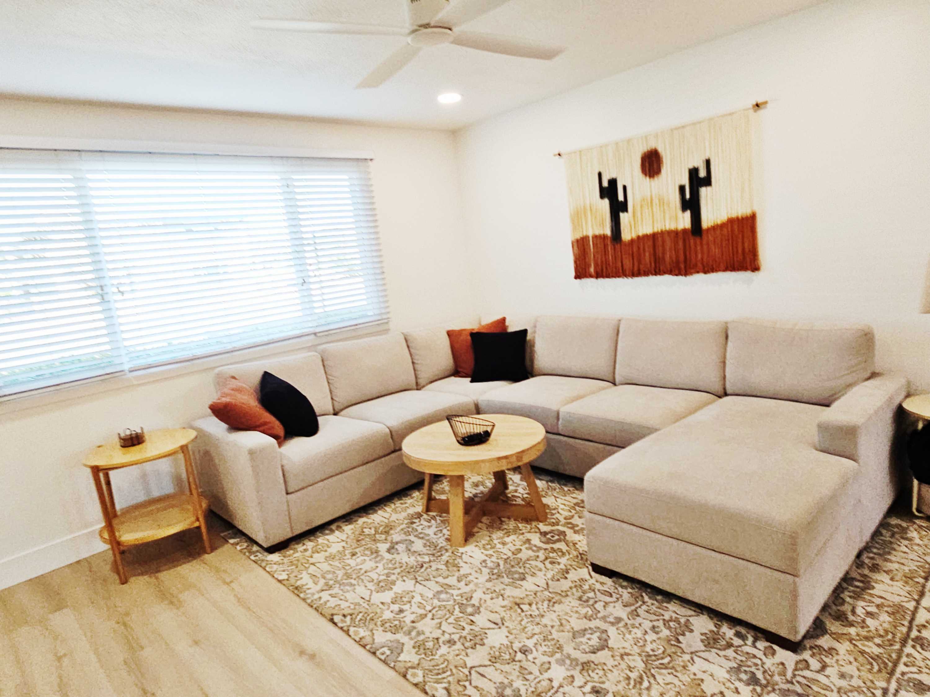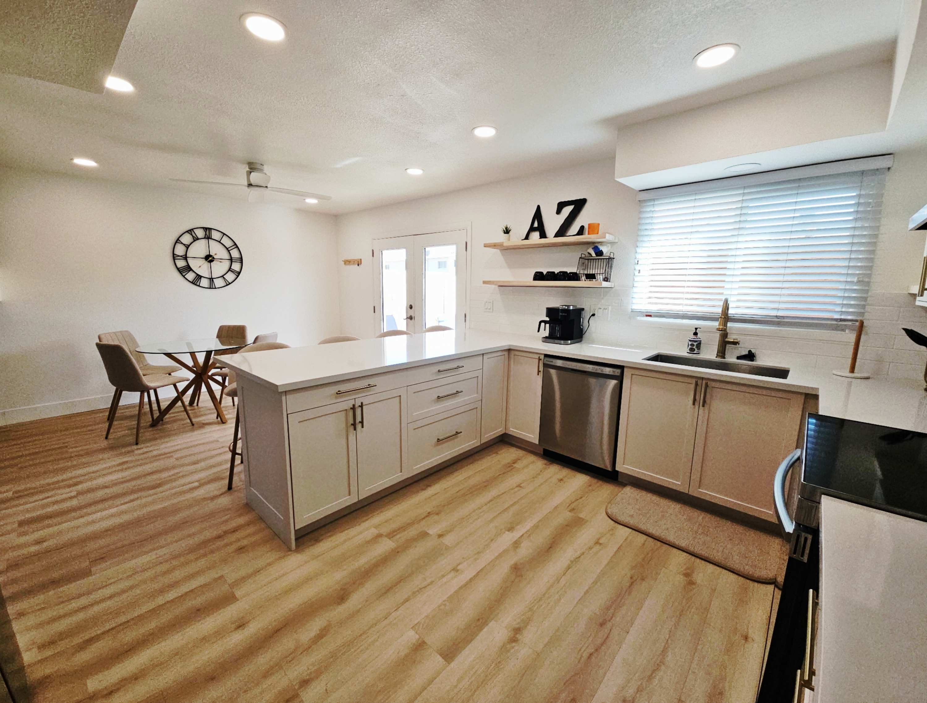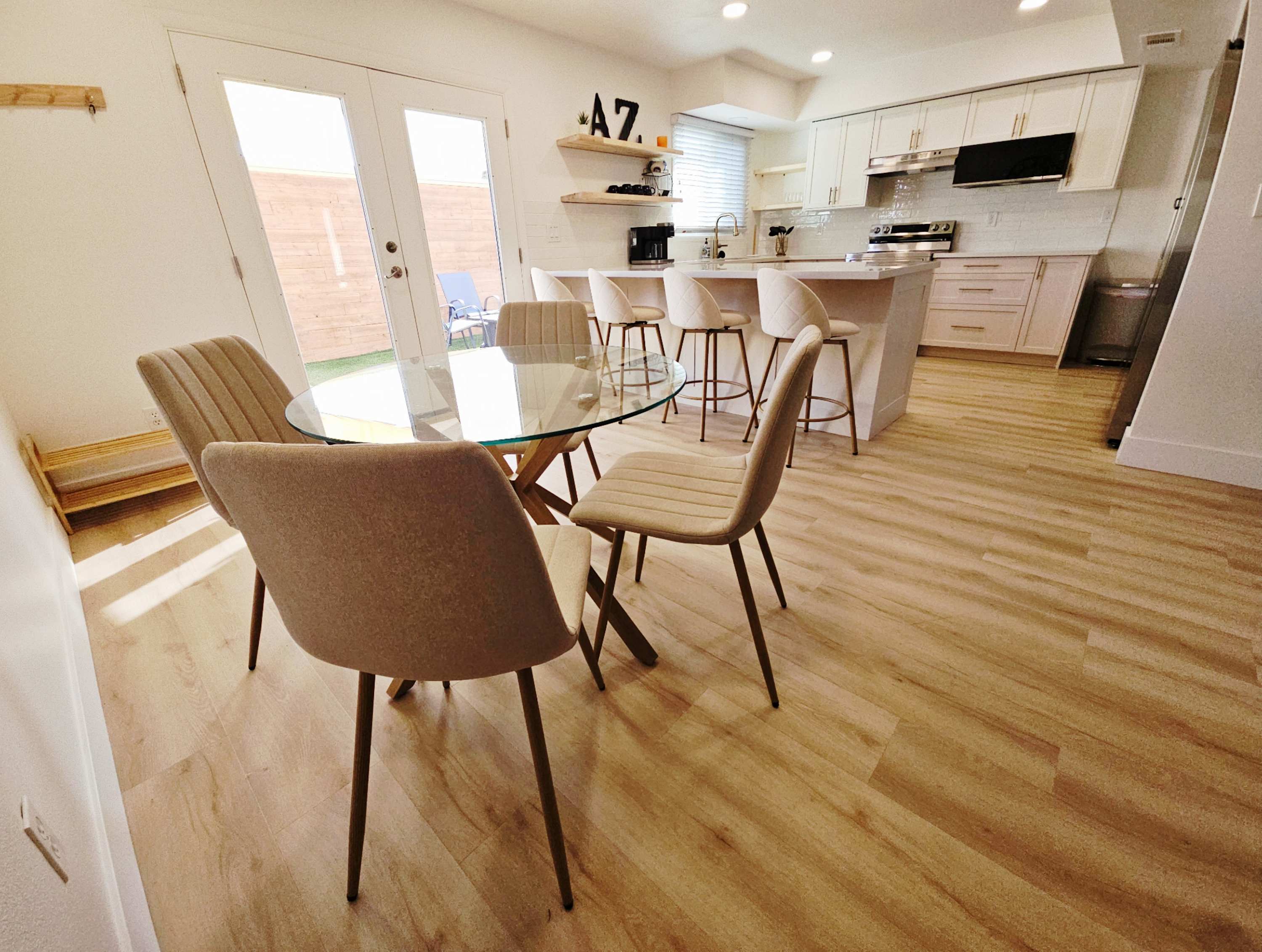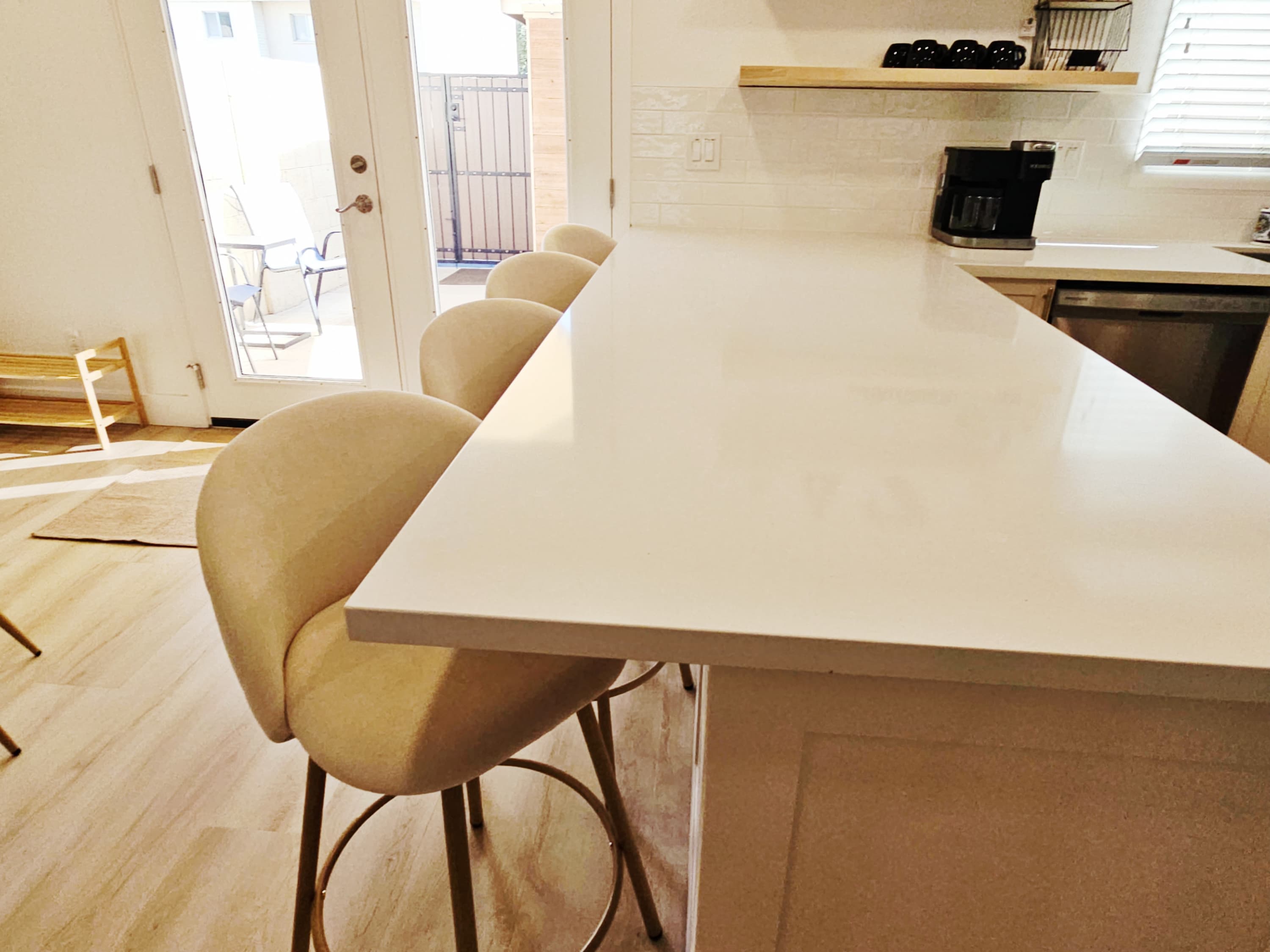 Inside, this stylish and comfortable home is designed to make your stay as enjoyable as possible. The spacious living room features a cozy sectional and a smart TV, making it the perfect place to unwind after a day of exploring. The bright, airy kitchen is fully equipped with stainless steel appliances and a single-cup coffee maker, so you can start your mornings with ease. With a dining table for four and additional counter seating for four more, there’s plenty of space to gather for meals or plan your next adventure.