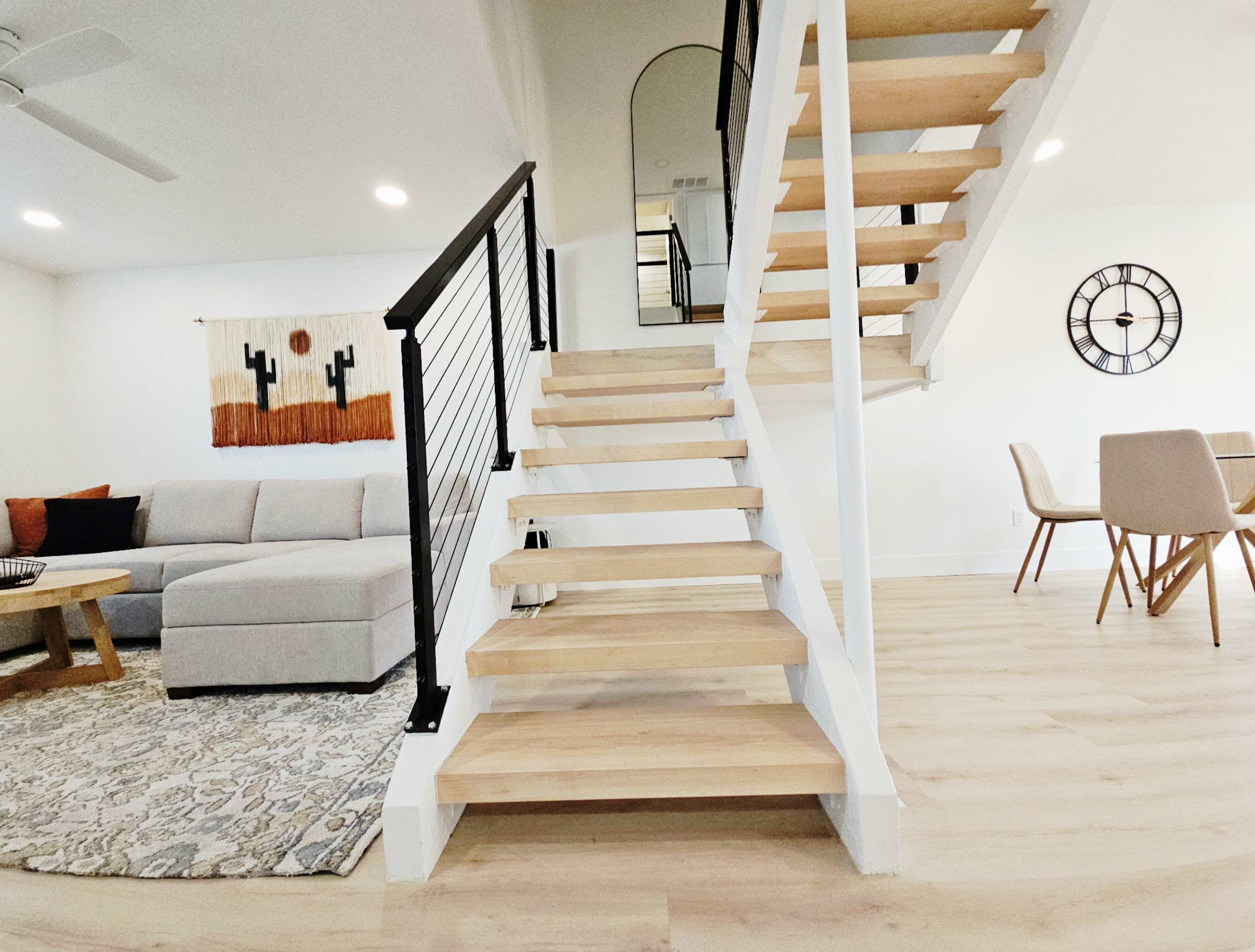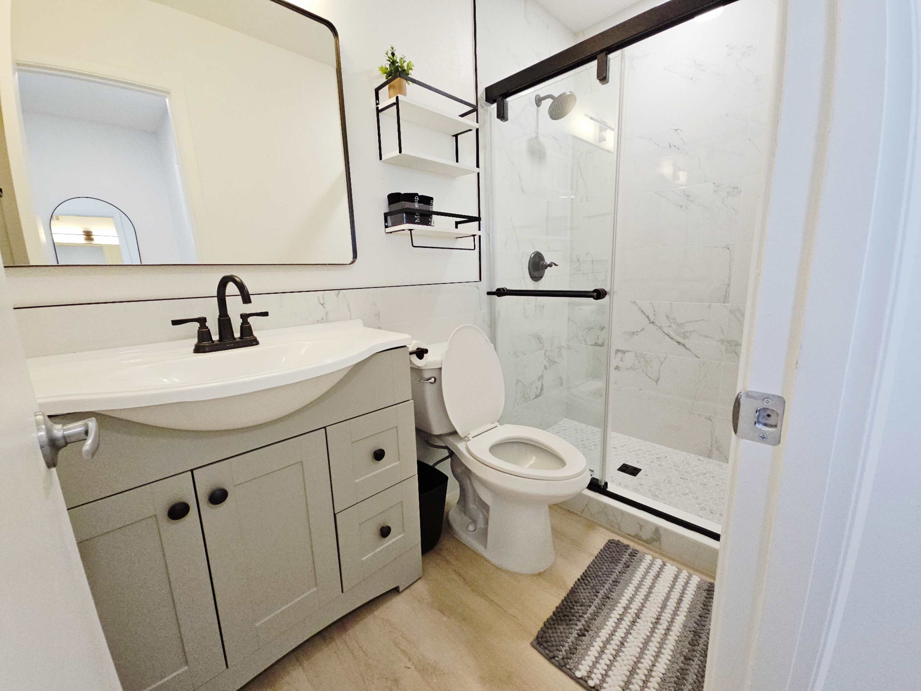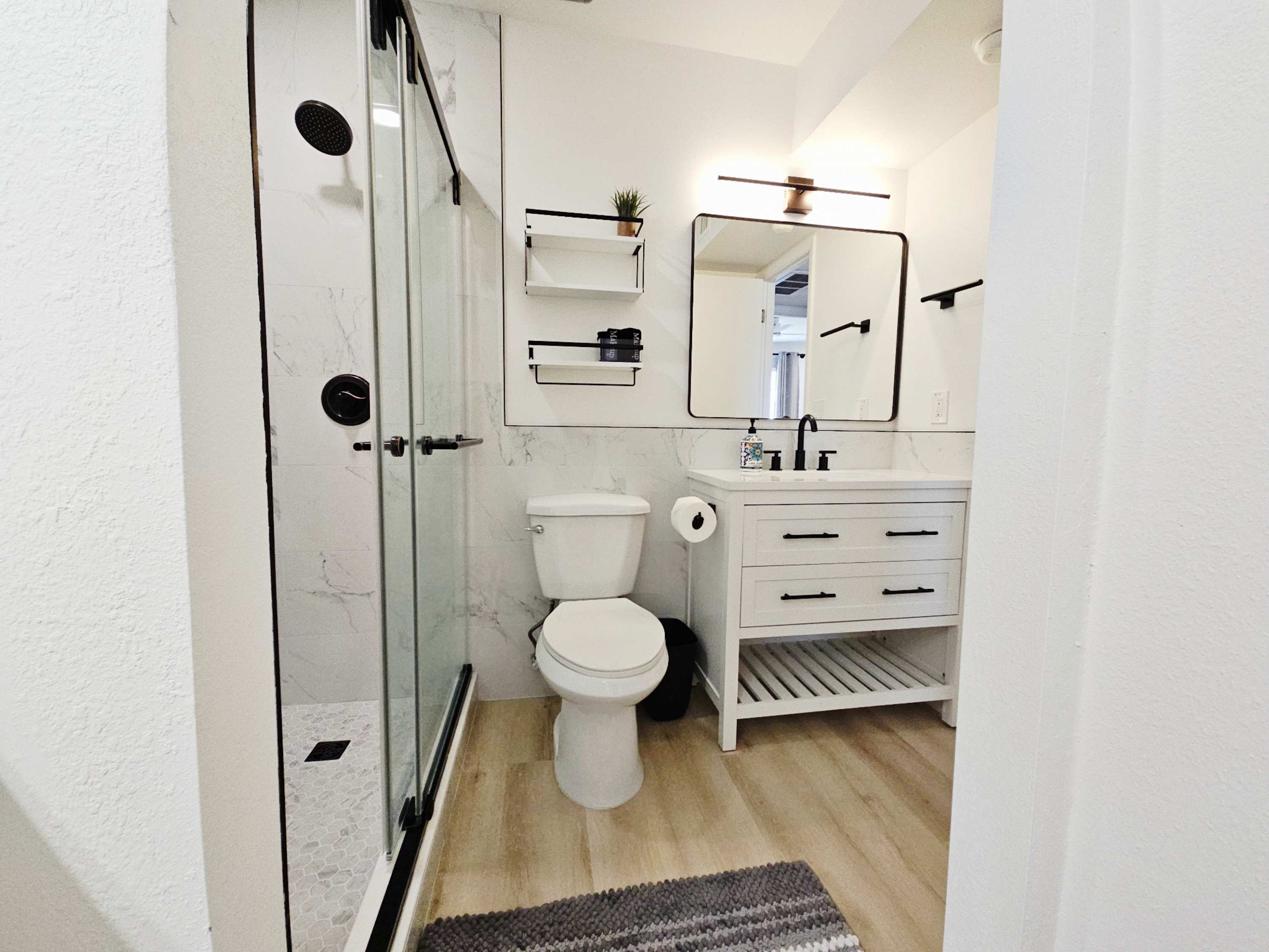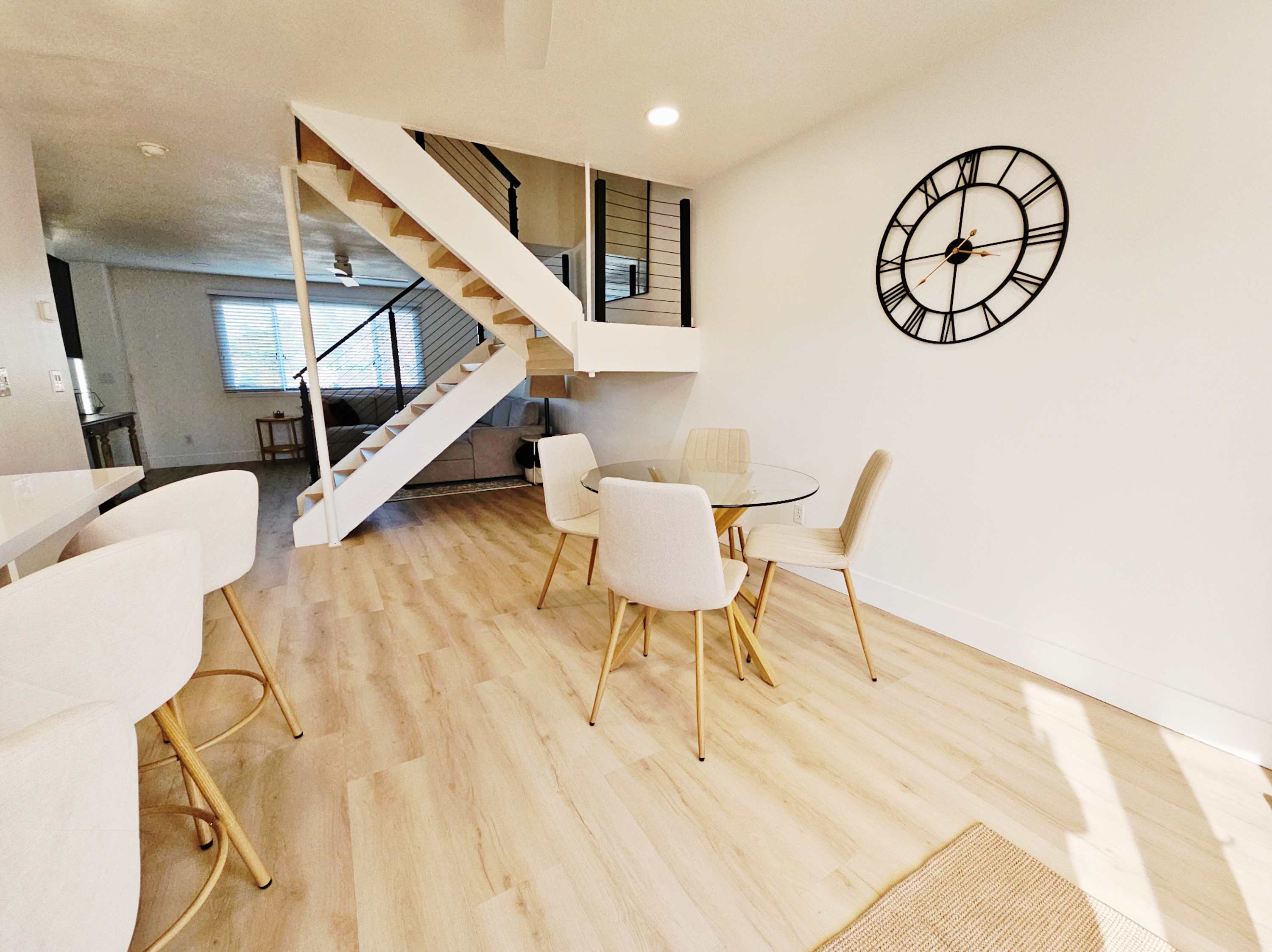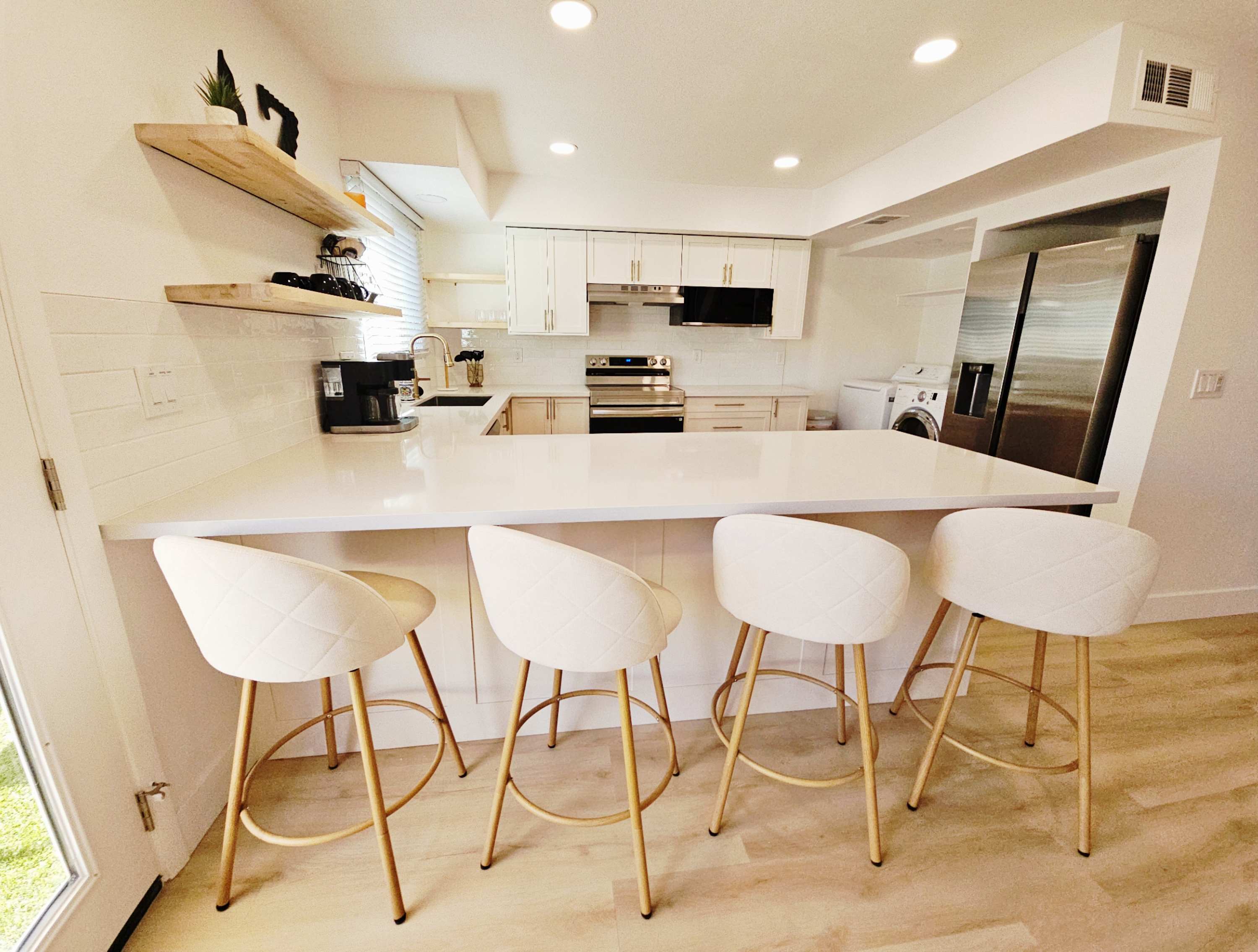 Inside, this stylish and comfortable home is designed to make your stay as enjoyable as possible. The spacious living room features a cozy sectional and a smart TV, making it the perfect place to unwind after a day of exploring. The bright, airy kitchen is fully equipped with stainless steel appliances and a single-cup coffee maker, so you can start your mornings with ease. With a dining table for four and additional counter seating for four more, there’s plenty of space to gather for meals or plan your next adventure.