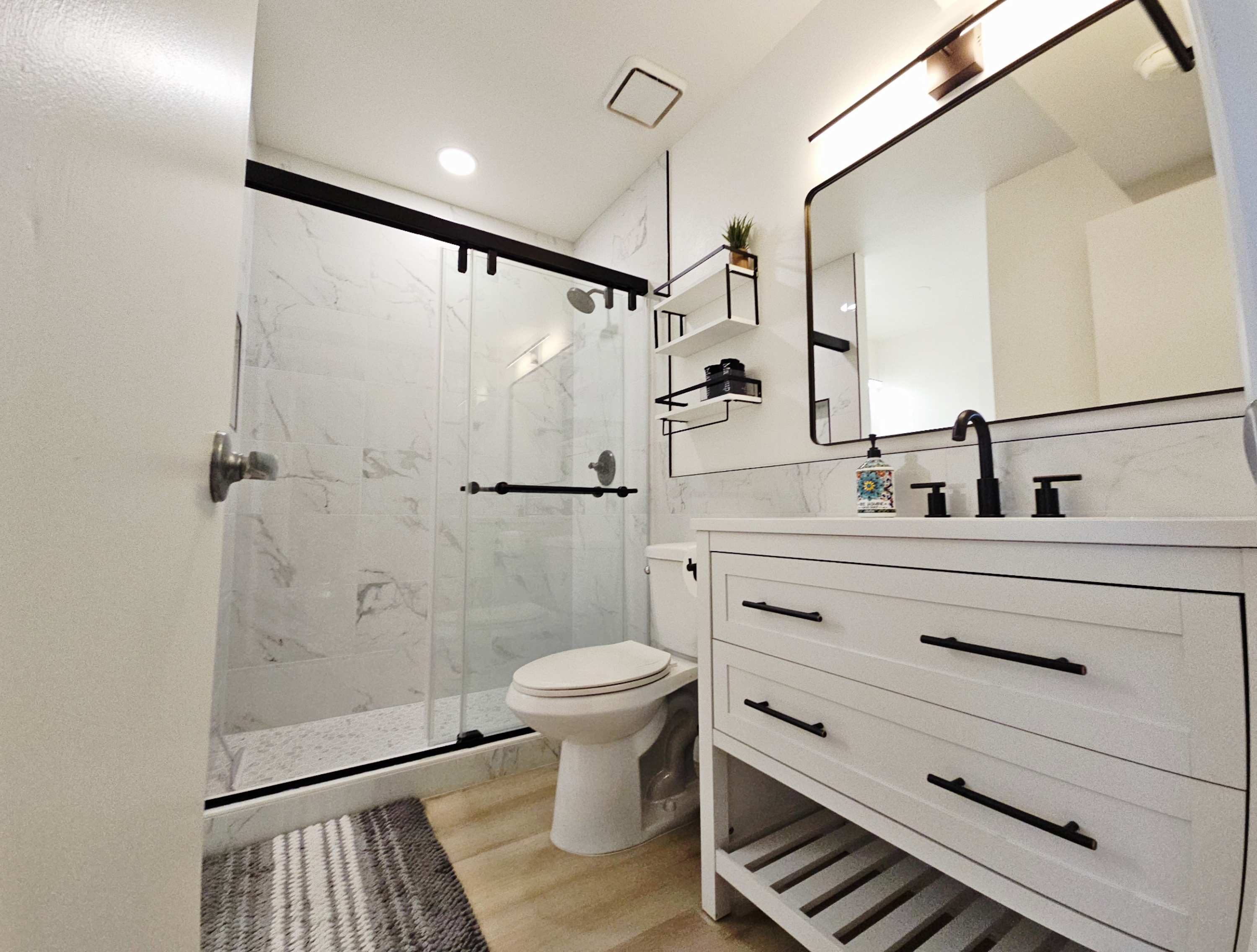 Bedroom #1 includes a king size bed, a smart TV, and an ensuite bathroom with a single vanity and a walk-in shower.