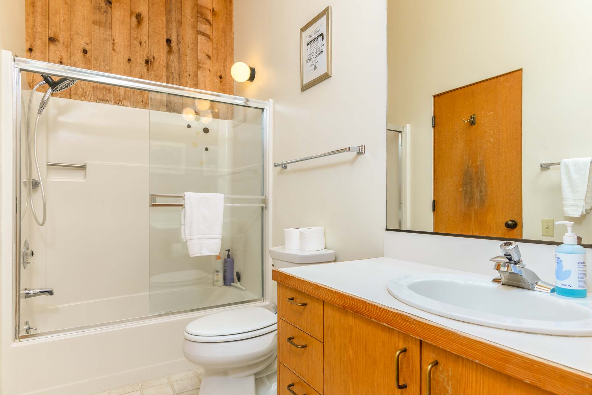 • Bedroom 1: Queen bed; sleeps 2. Ensuite bathroom with single vanity and walk-in shower.