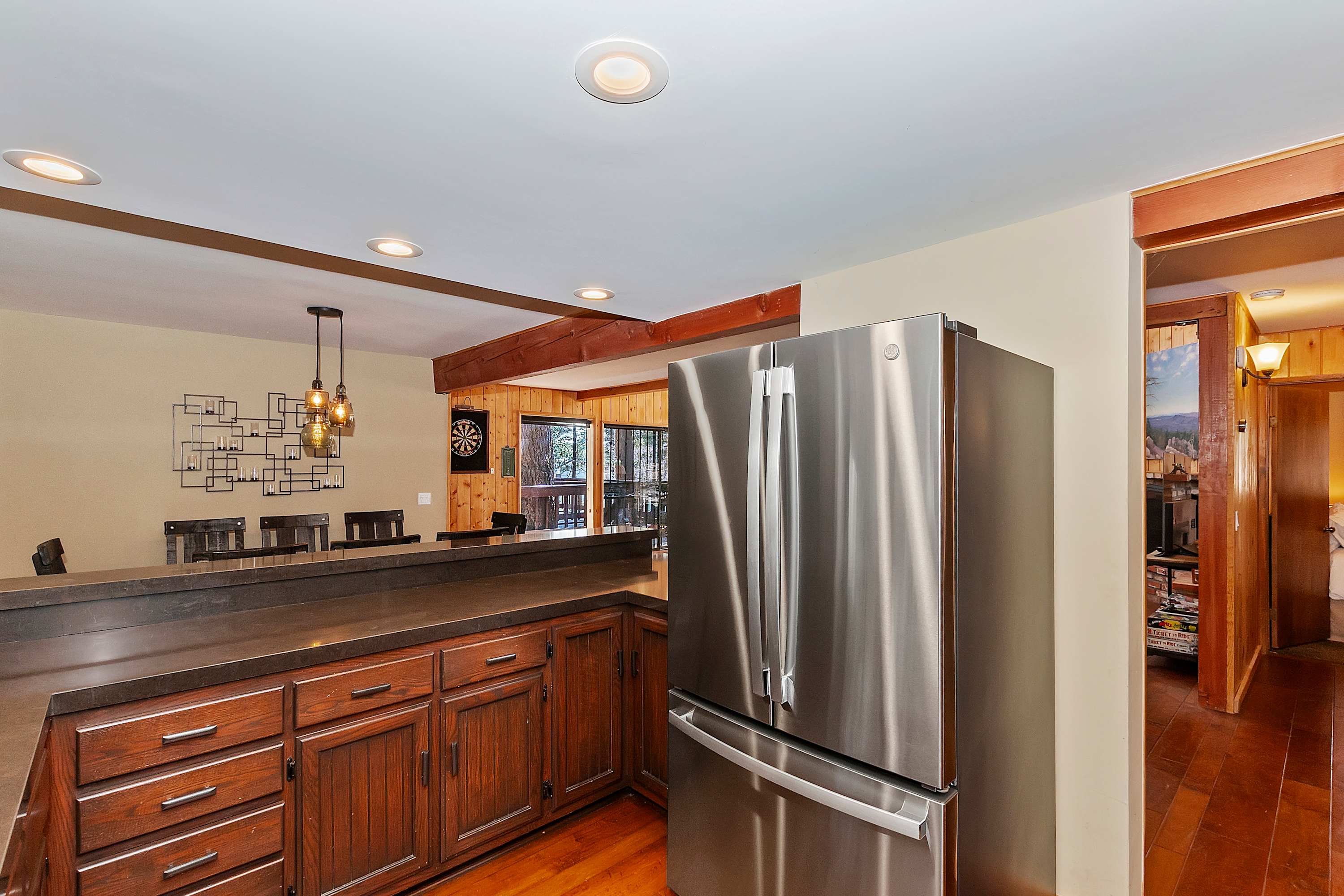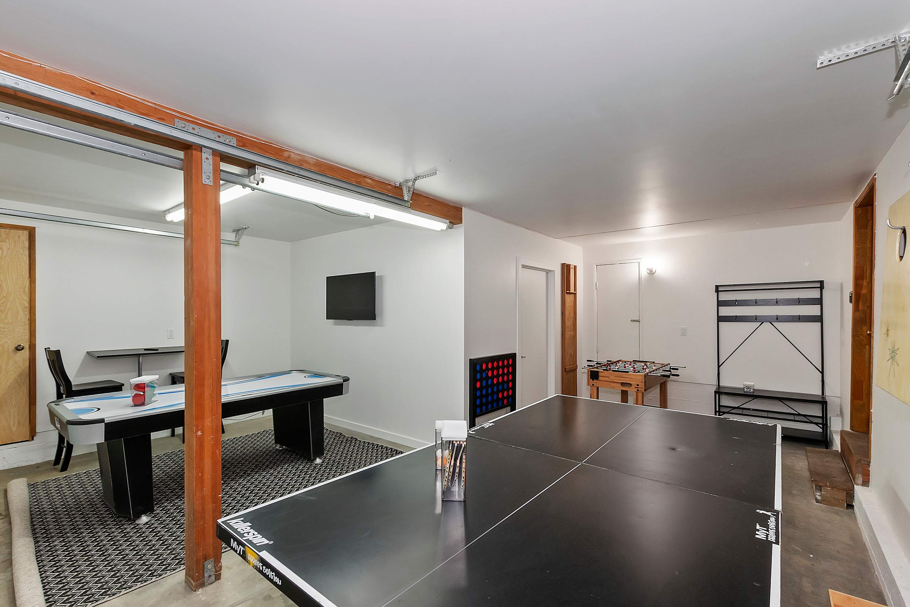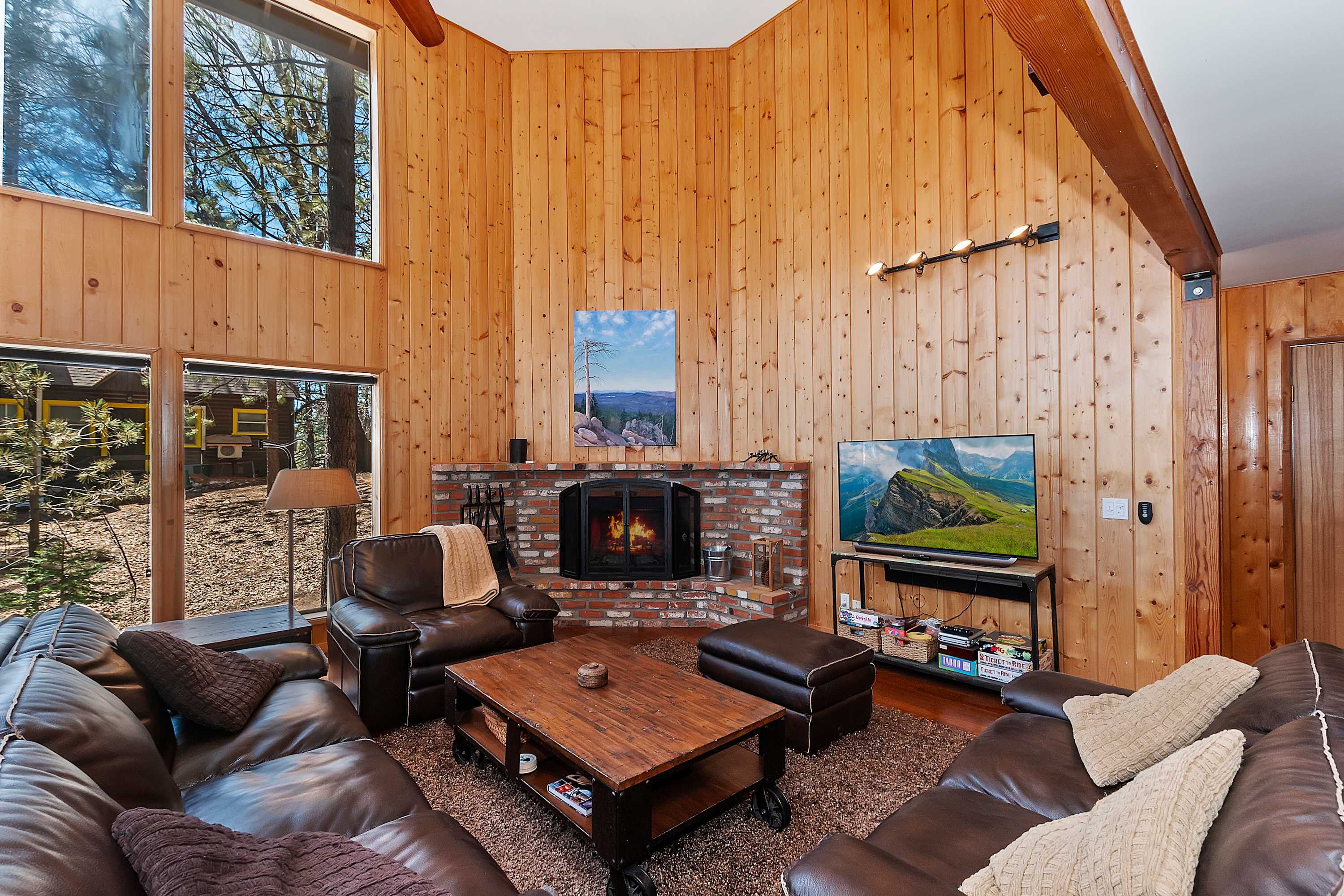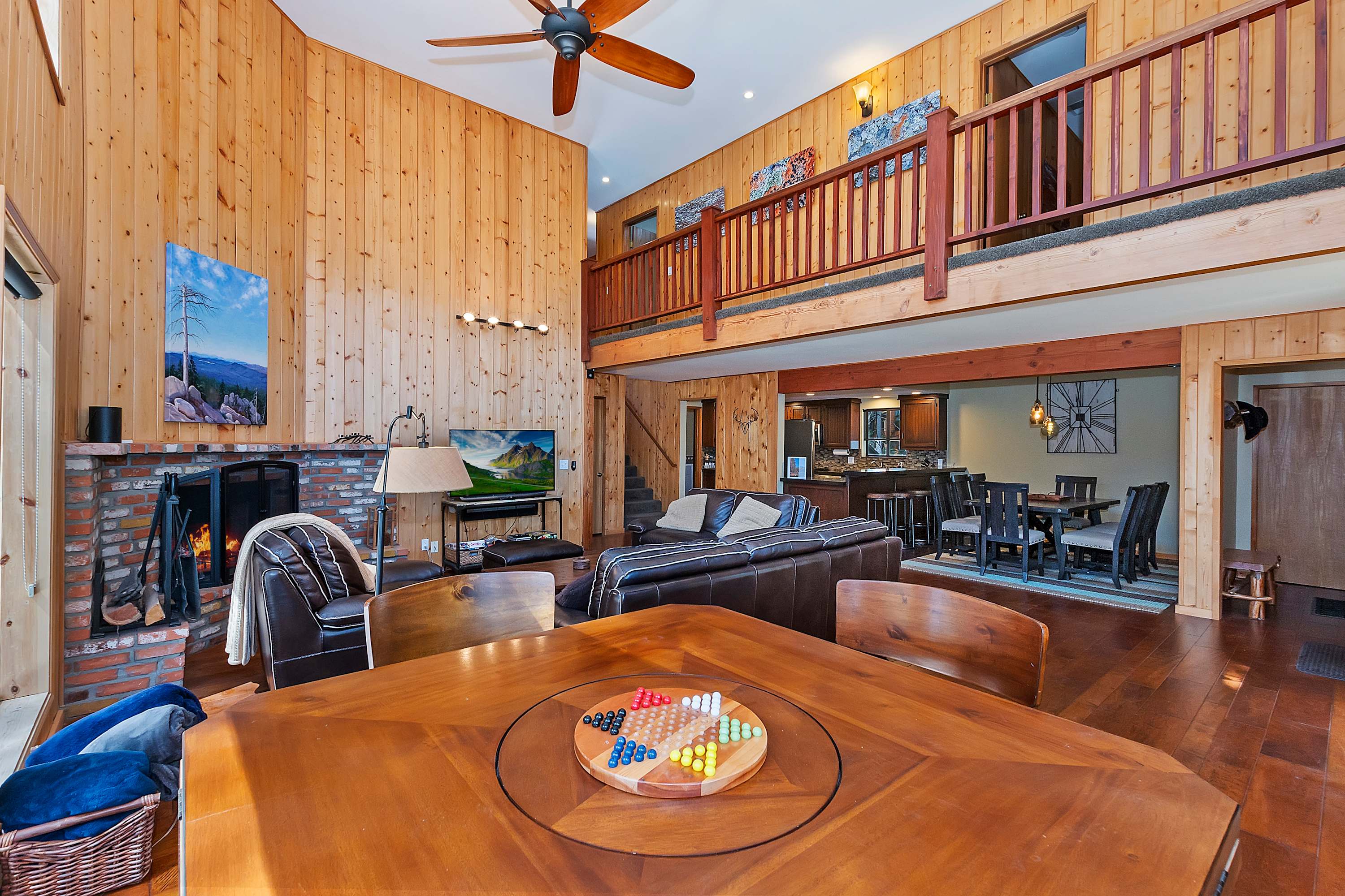 For even more entertainment, head to the garage-turned-game room, where excitement awaits with ping pong, and air hockey. A TV and a collection of board games make this the perfect hangout spot for kids and adults alike. Whether you’re soaking in the tranquility of the lake, gathering around the fireplace, or battling it out in a game of air hockey, this Green Valley Lake retreat offers something for everyone.