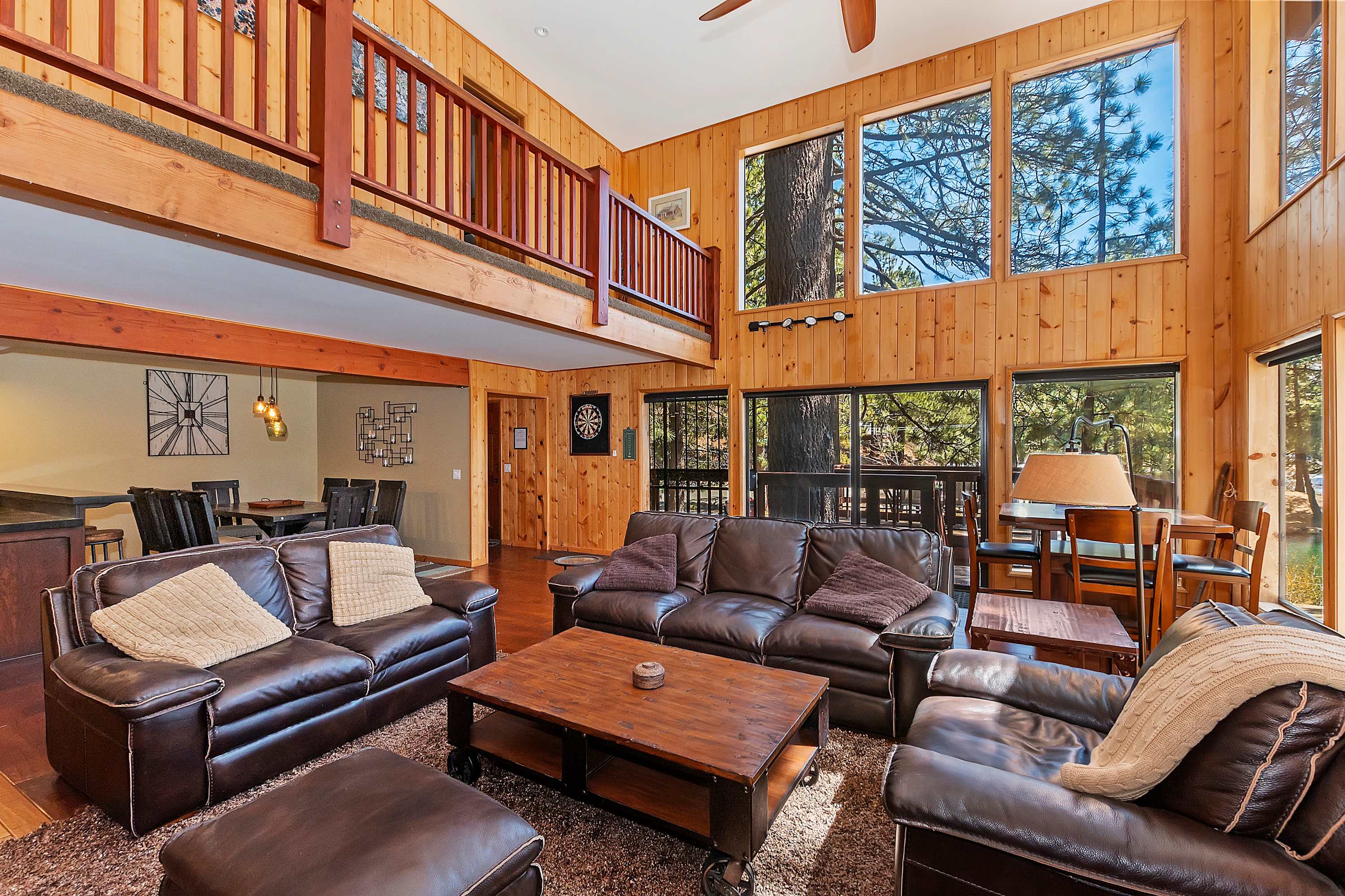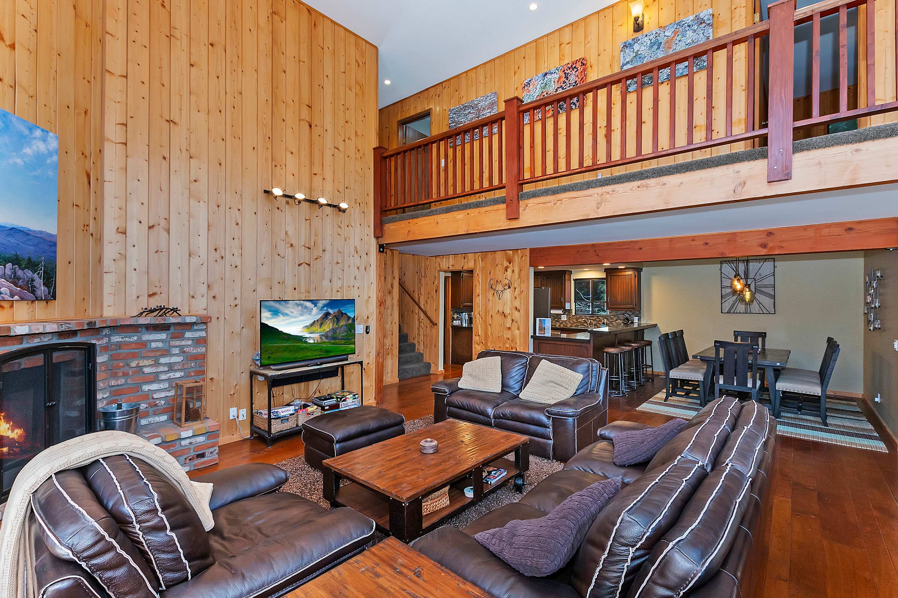 Step inside, and you’re immediately greeted by a warm and inviting atmosphere, with high ceilings and large windows that showcase breathtaking views of the lake. The spacious living room offers a plush couch, a love seat, and a cozy armchair, perfect for unwinding by the fireplace or streaming your favorite shows on the smart TV. A dedicated card and game table for four invites friendly competition, whether it’s poker night or a classic board game with family. Just beyond, the elegant dining table for eight provides the ideal setting for sharing meals, laughter, and unforgettable memories.