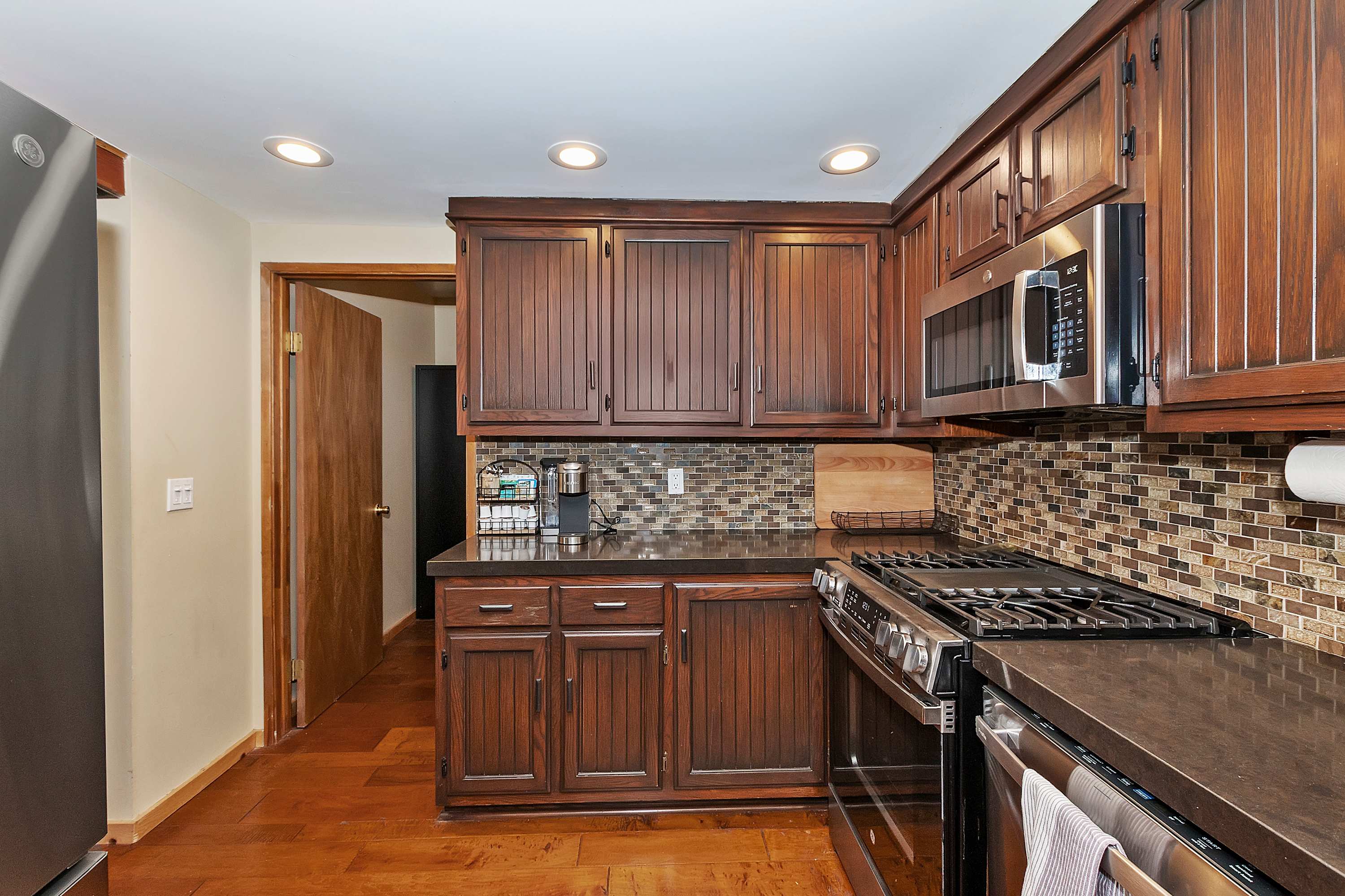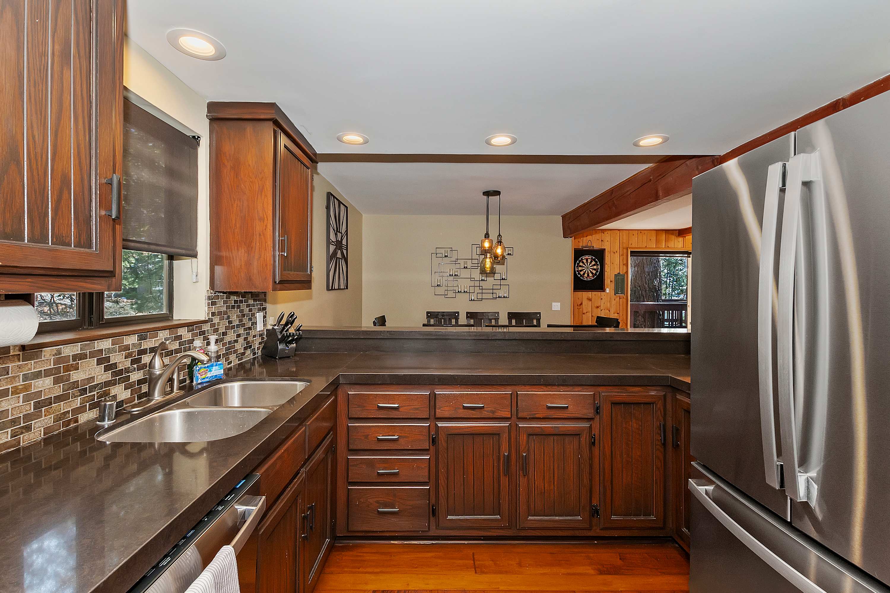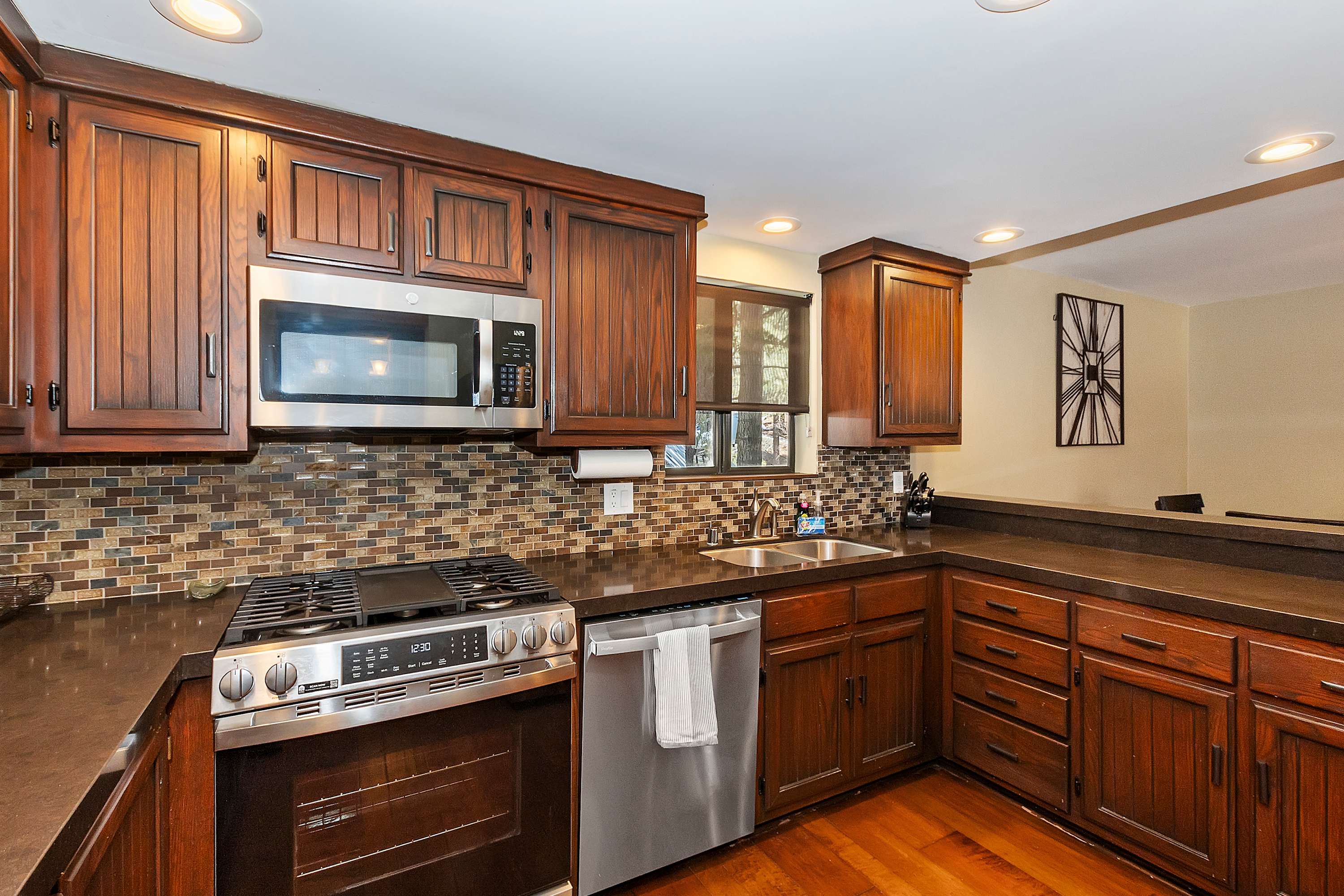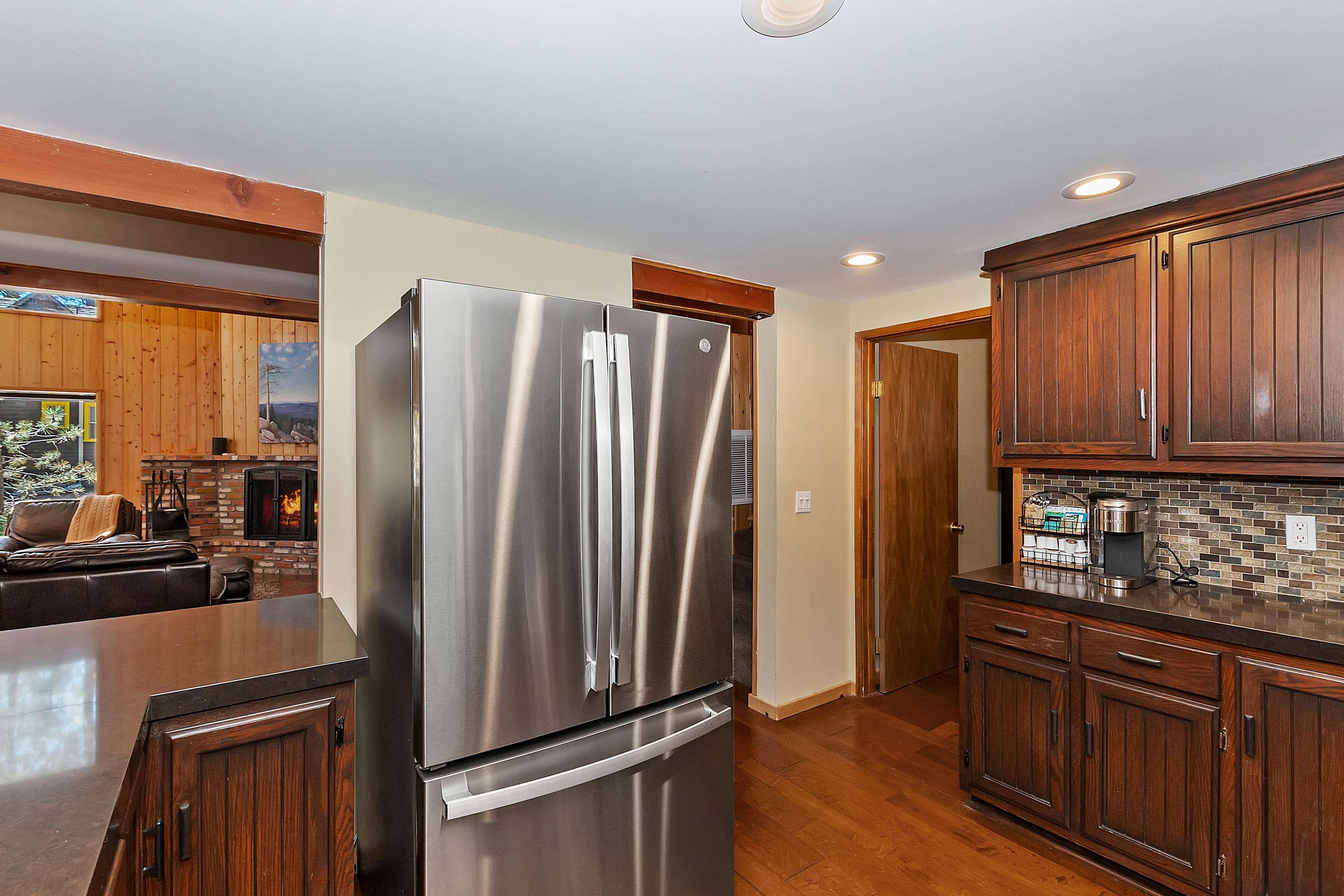 The kitchen is a dream for any home chef, featuring sleek dark countertops, rich dark cabinets, and stainless-steel appliances. A Keurig ensures your morning coffee is quick and convenient, while the counter seating for four makes it easy to chat while preparing meals. Step outside onto the expansive deck, where a table for six invites you to dine al fresco with stunning lake views as your backdrop. Fire up the grill for a delicious barbecue and savor the fresh mountain air as the sun sets over the water.