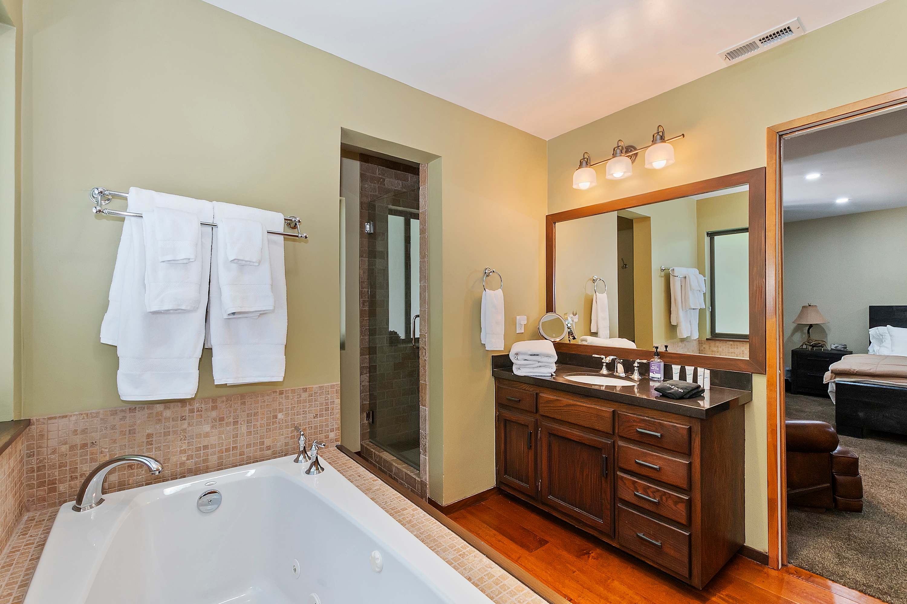 Bedroom #3 includes a king size bed, a smart TV, and an ensuite bathroom with a single vanity, a jetted tub, and a walk-in shower.