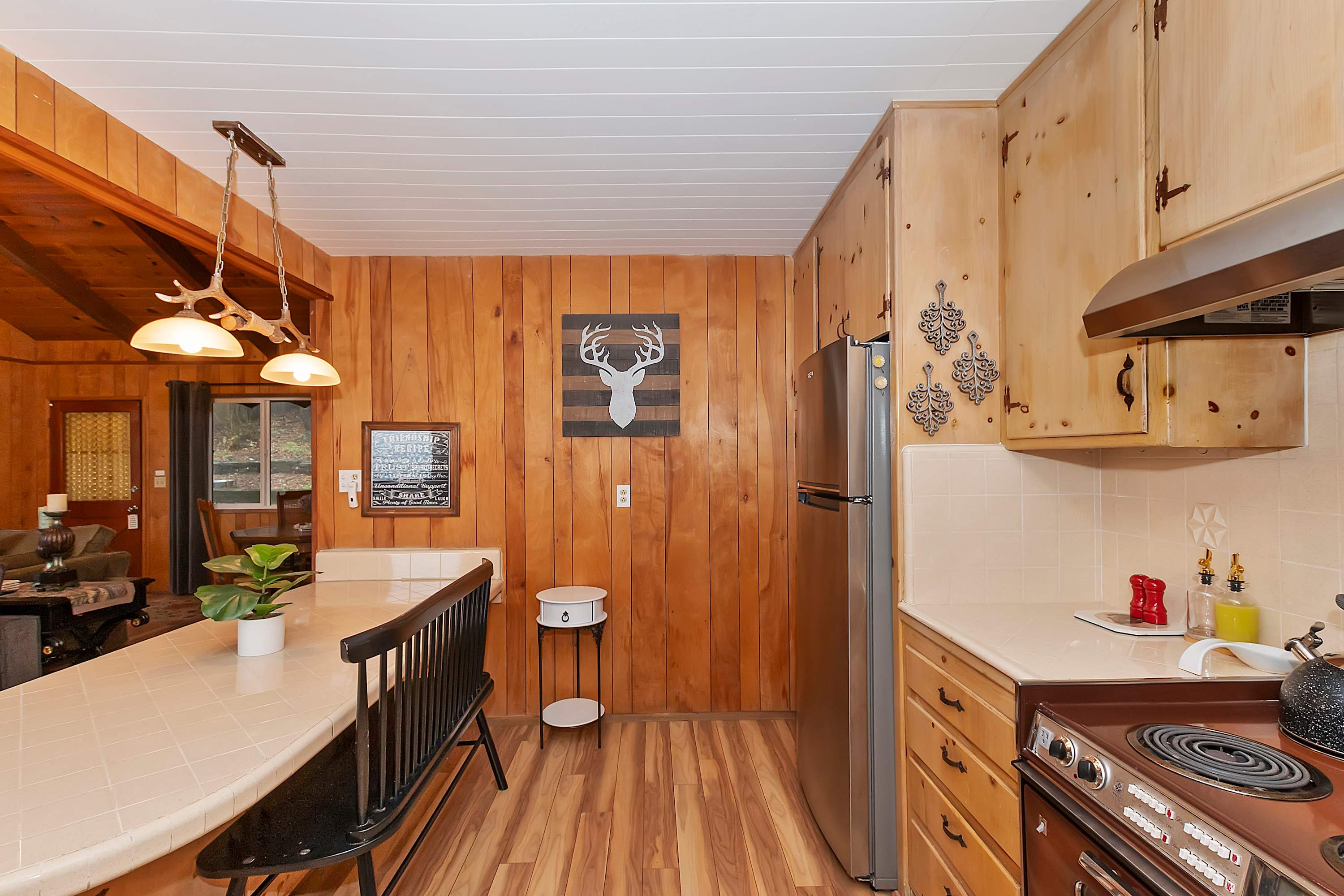 Inside the home, rustic charm meets modern comfort. The living room is warm and inviting, with high-peaked ceilings, a cozy fireplace, a plush sofa, loveseat, two comfy chairs, and a smart TV—perfect for movie nights after a day in the mountains. The fully equipped kitchen has everything you need to prepare meals at home, plus a Keurig and drip coffee maker to fuel your mornings. Pull up a seat at the counter with space for four, or gather around the unique dining table, which doubles as a bumper pool and poker table—ideal for family fun or late-night card games.