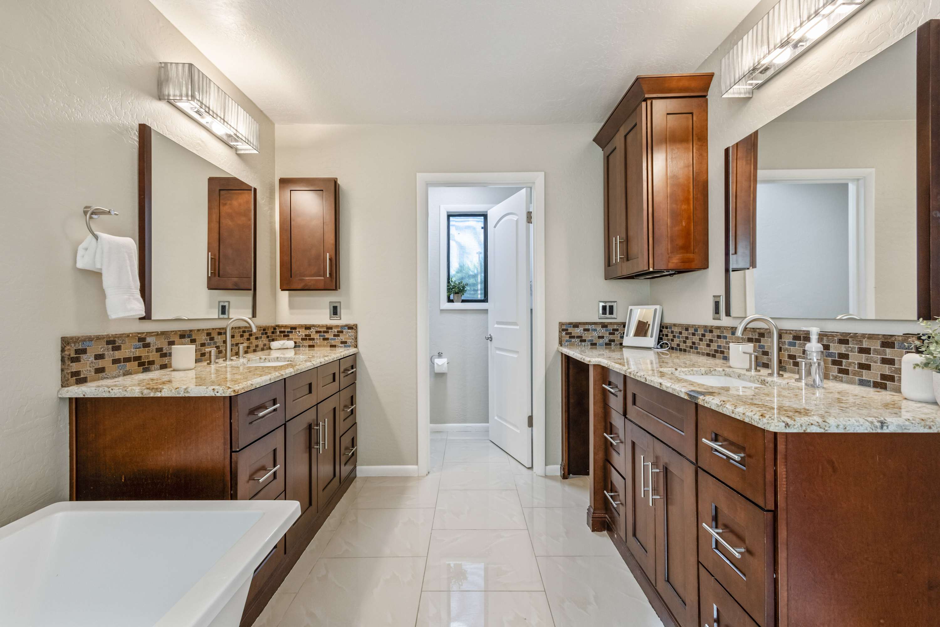 • Luxury ensuite bathroom with double vanities, soaking tub, and large walk-in shower with rain shower feature