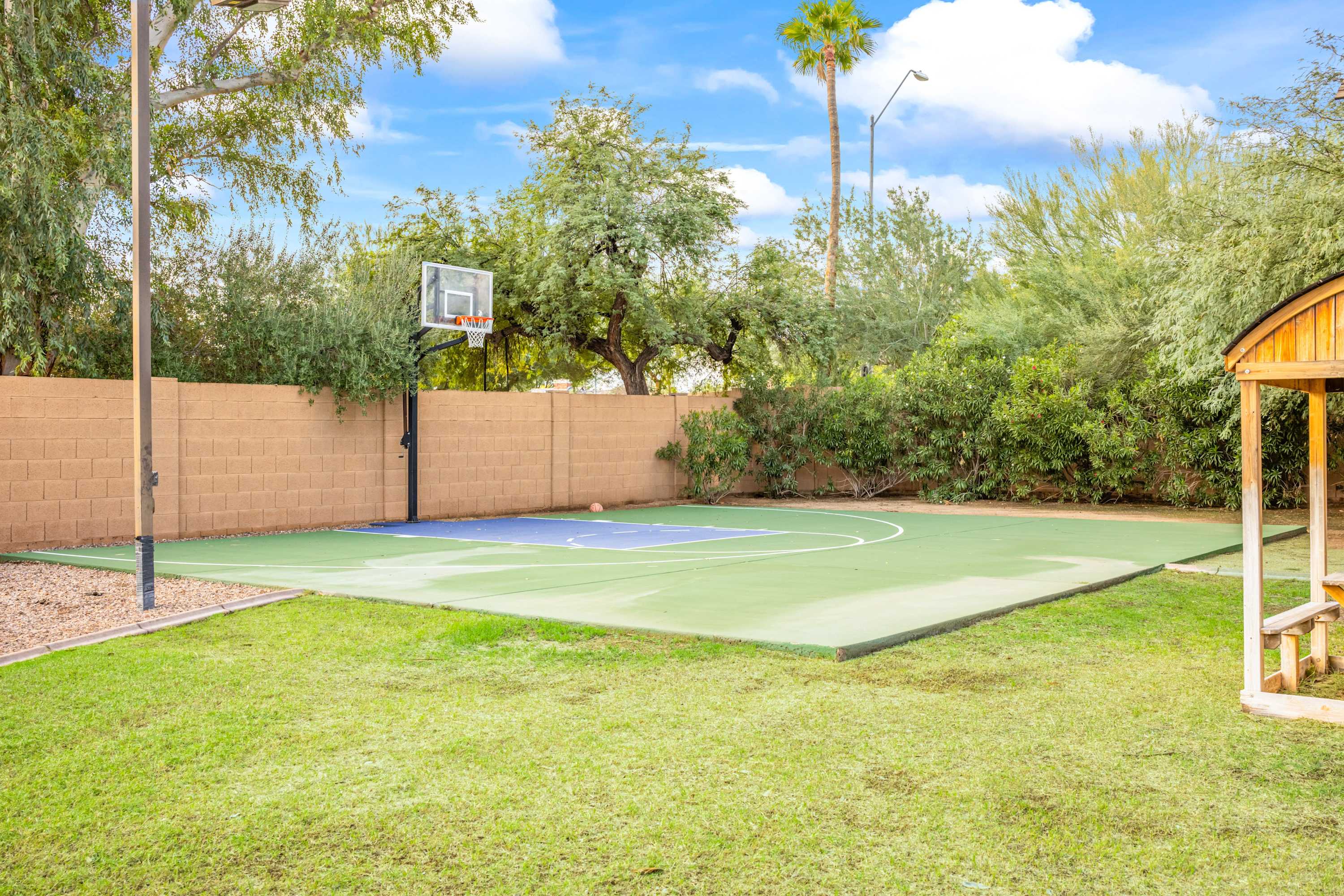 • Private Resort-Style Backyard with pool, lounge chairs, outdoor dining area, basketball court, fire-pit, and play set