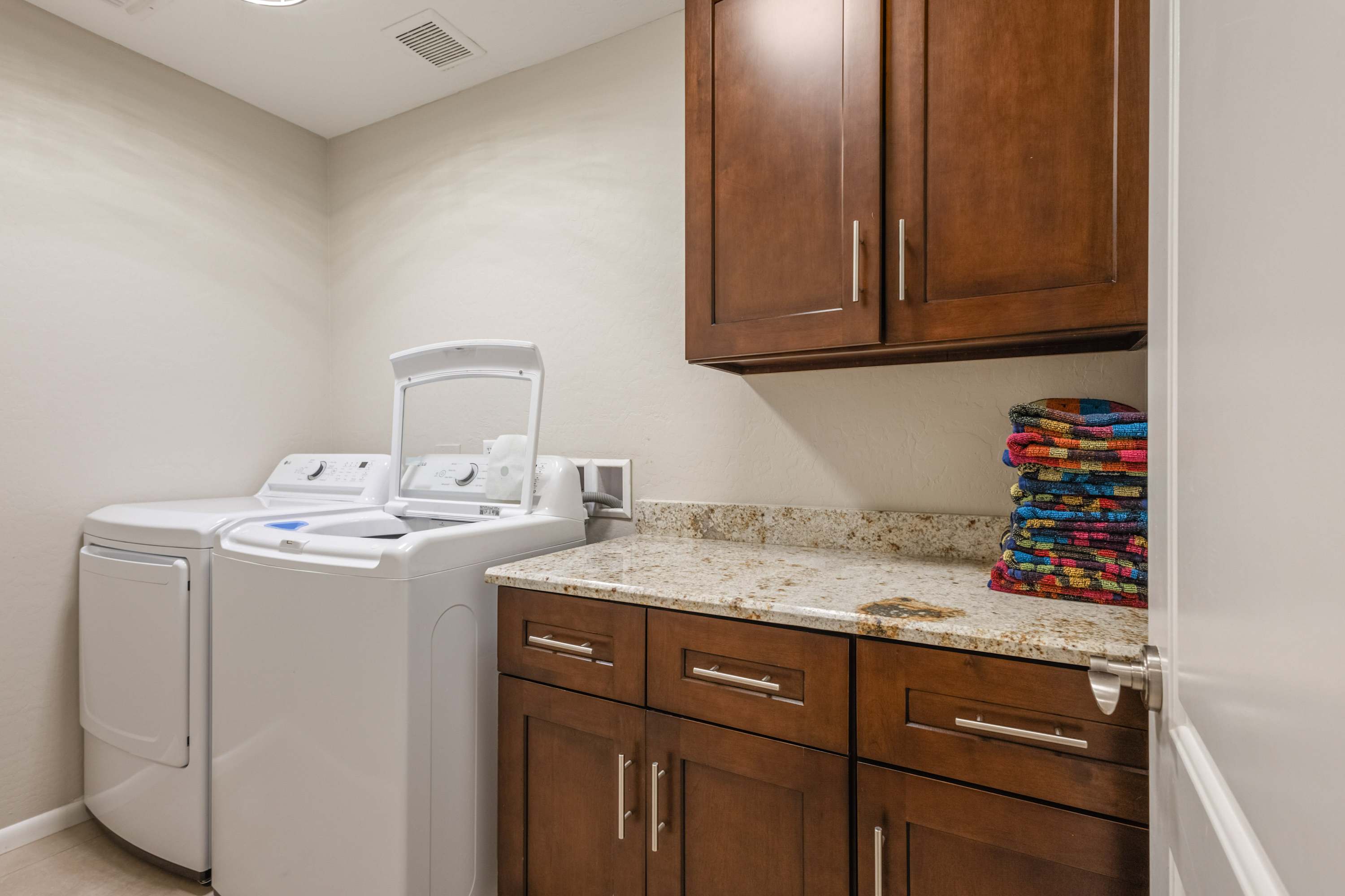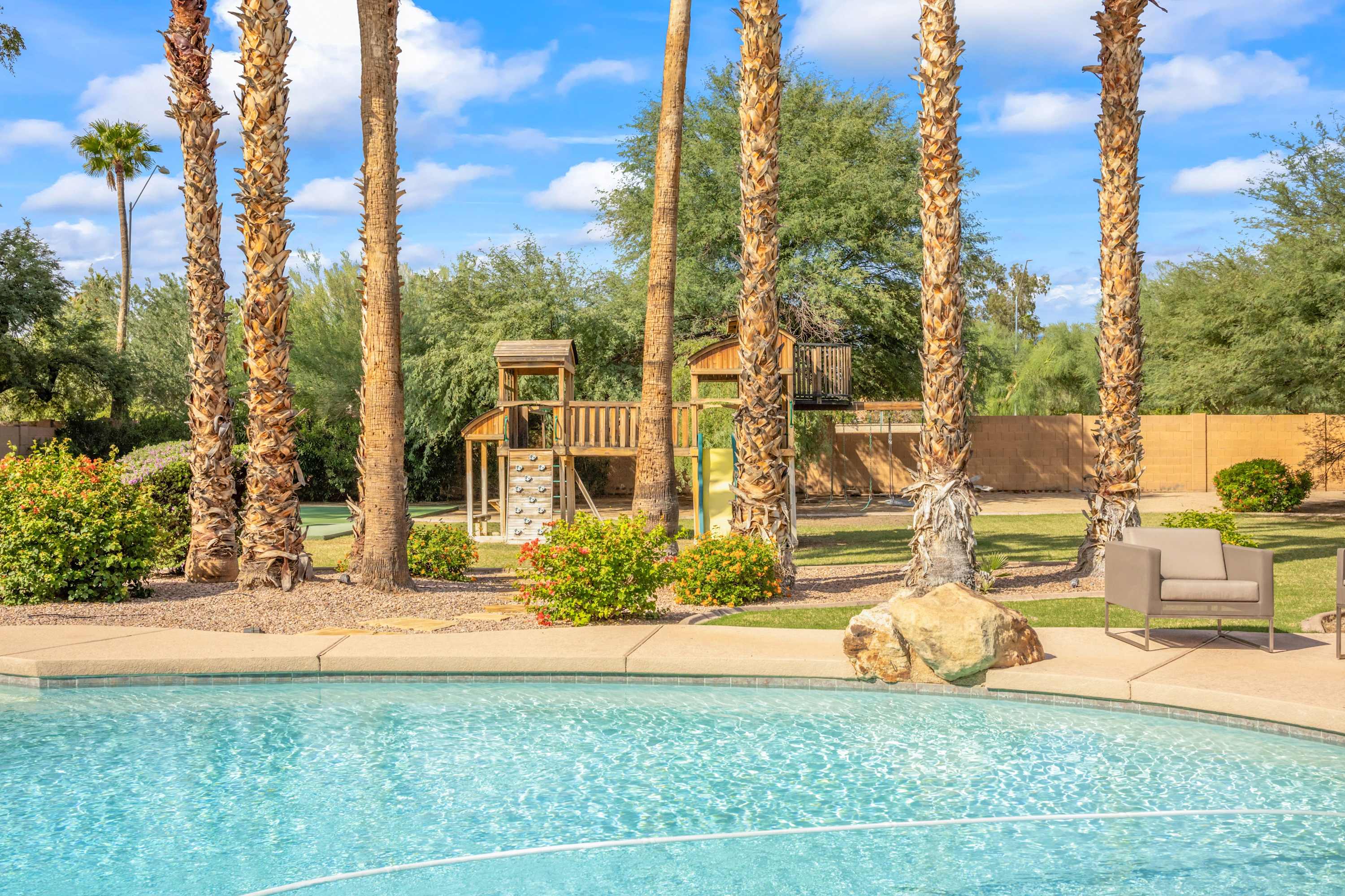 Step outside to your private backyard oasis, where the home truly shines. Cool off in the sparkling in ground pool, stretch out on lounge chairs under the Arizona sun, or challenge your group to a game of basketball. Kids will love the Clubhouse play set, and evenings are best spent gathered around the fire pit, grilling at the outdoor kitchen, and enjoying an al fresco meal at the patio dining table for four. This outdoor space is designed to feel like your own private resort—equal parts fun and relaxation.