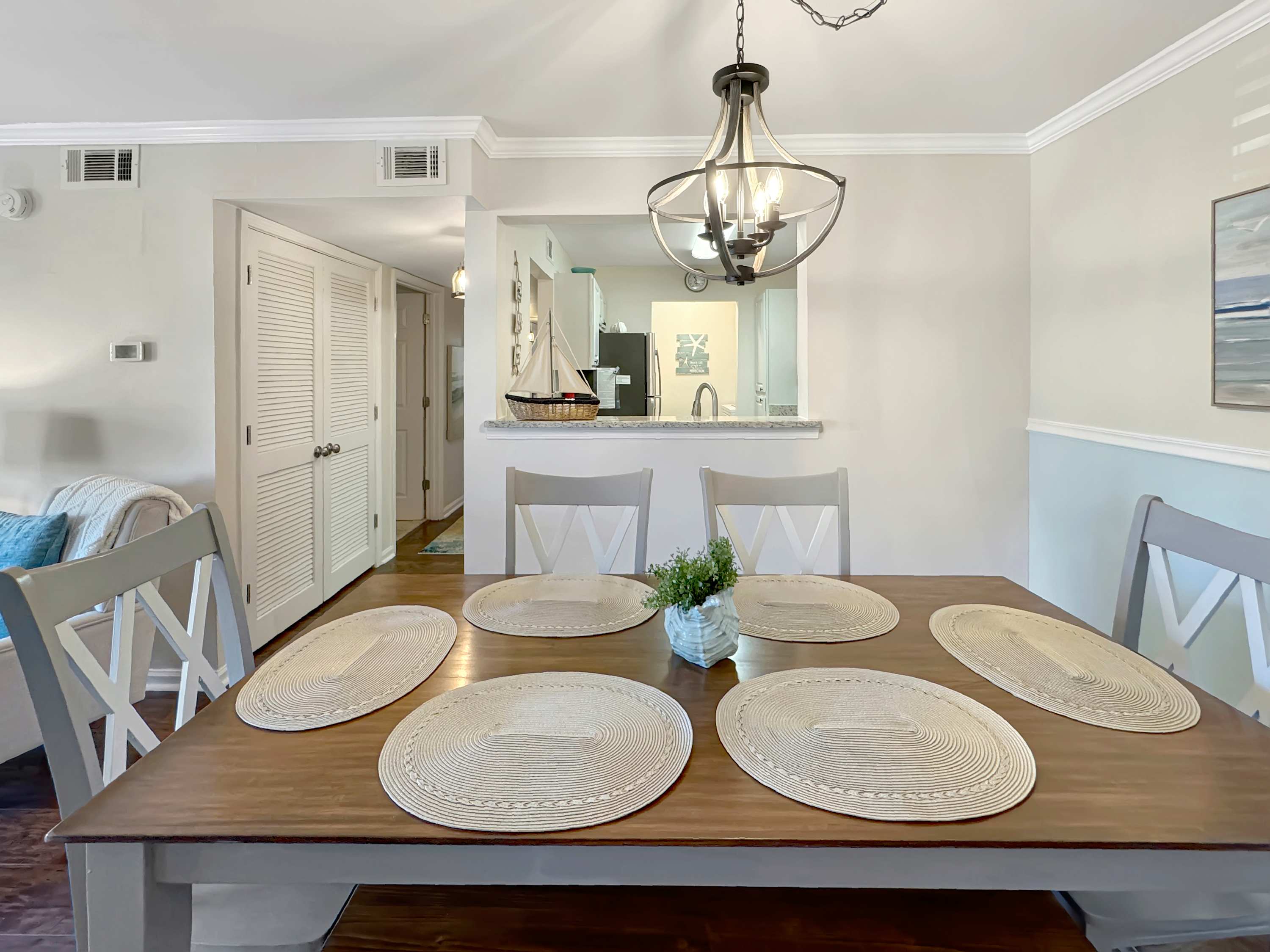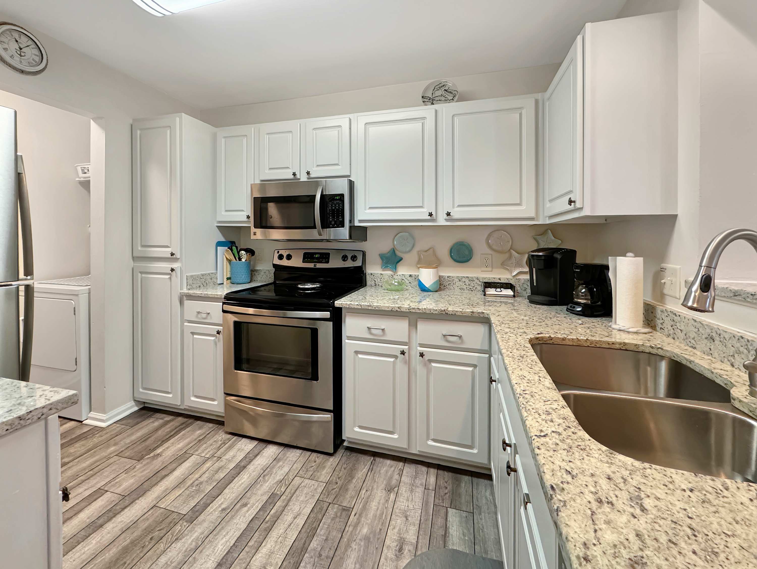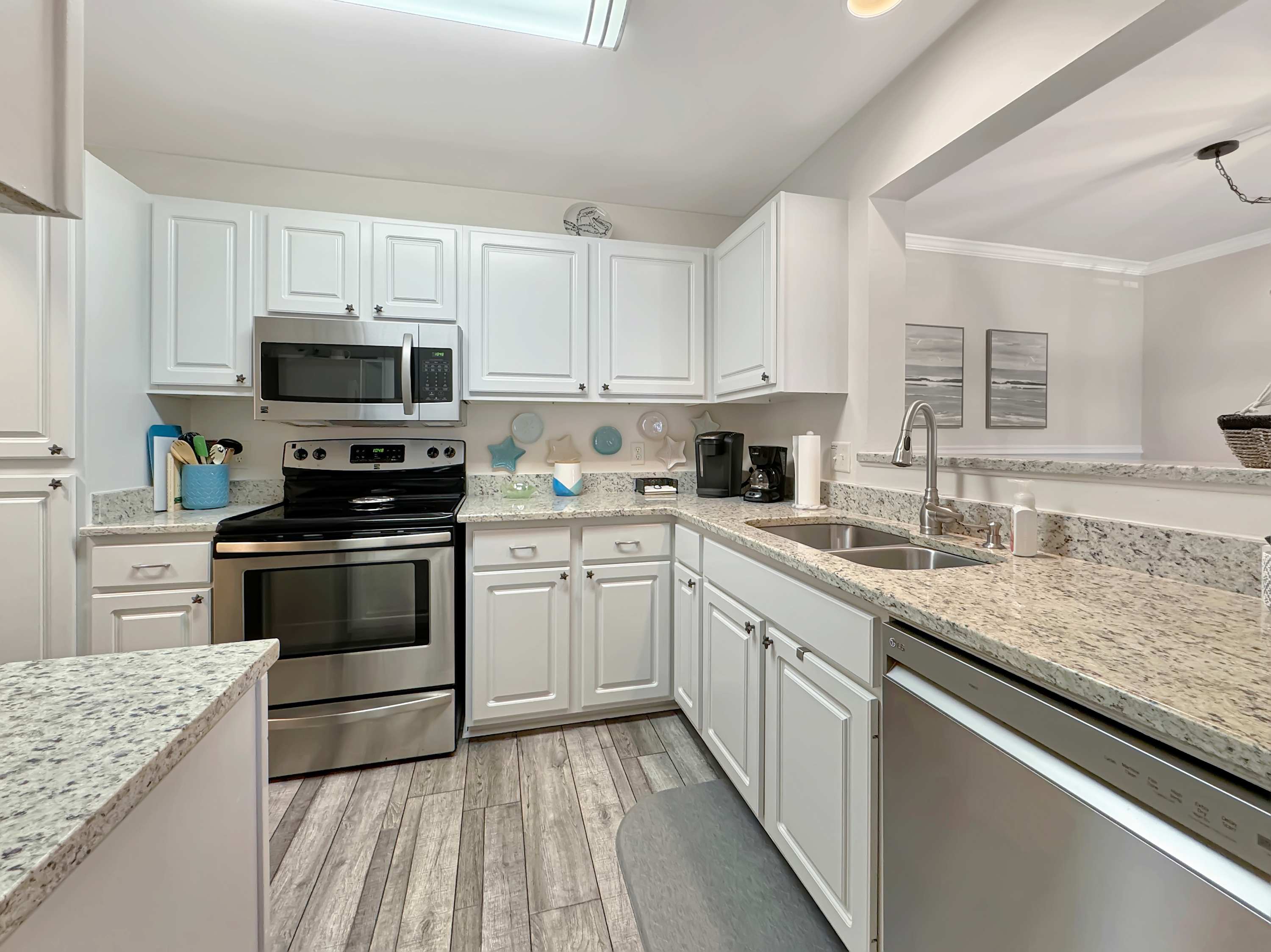Step inside this resort-style condo and feel the calm coastal vibes takeover. The kitchen is a dream for morning coffee lovers, offering both a drip machine and Keurig, surrounded by crisp white cabinets and gleaming stainless steel appliances. Enjoy meals and laughter around the dining table that seats six comfortably. The living room is a cozy gathering space, complete with a smart TV, plush couch, and two inviting armchairs—perfect for movie nights or lazy afternoons. Slide open the glass doors and step onto your private, covered patio, where a table for two and extra seating invites you to sip cocktails in the warm evening breeze. Plus, beach essentials are thoughtfully provided, so you’re always ready for a spontaneous seaside escape.