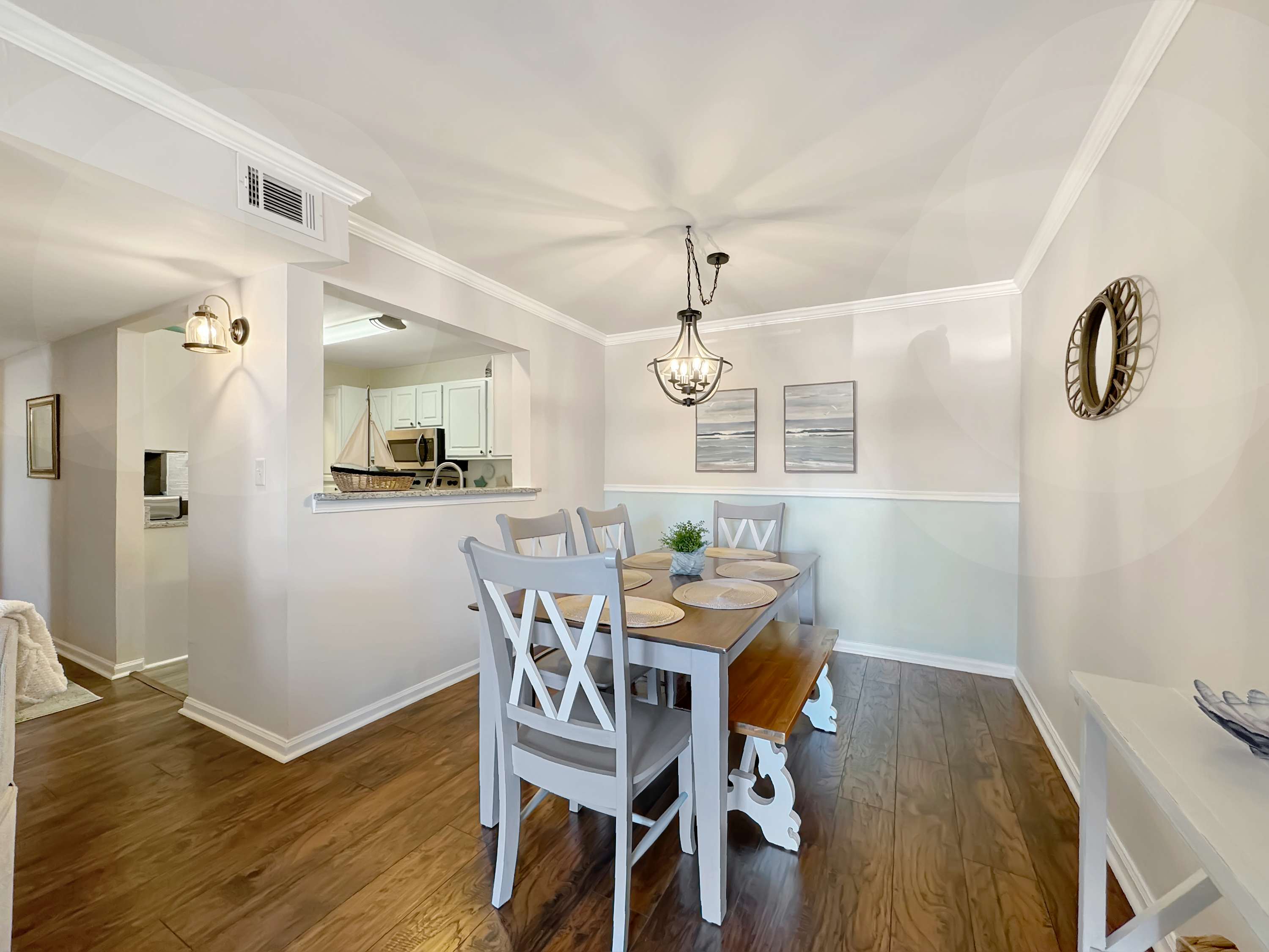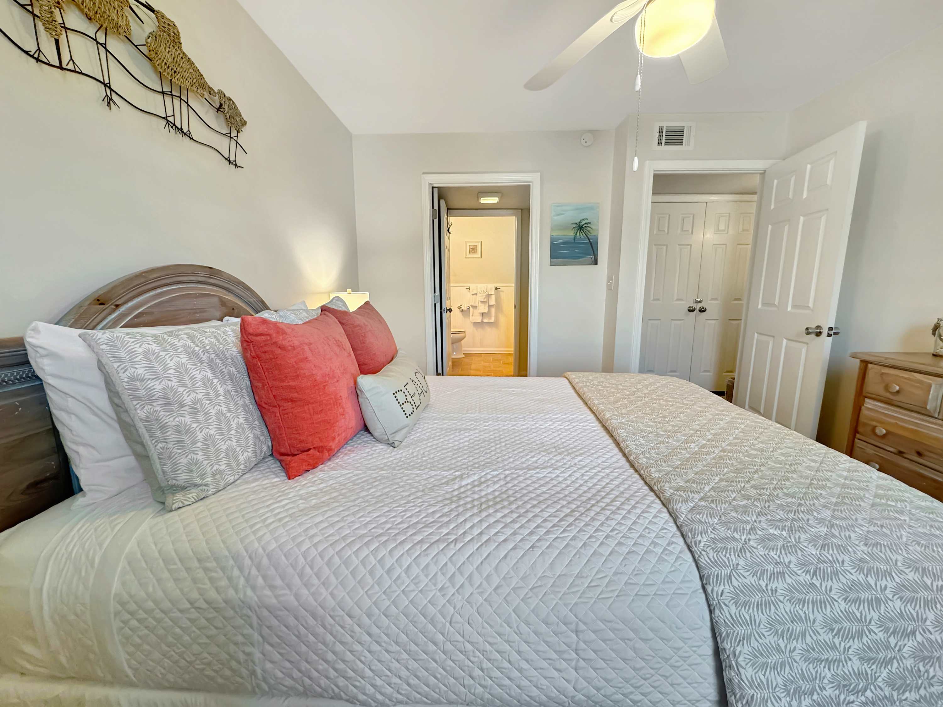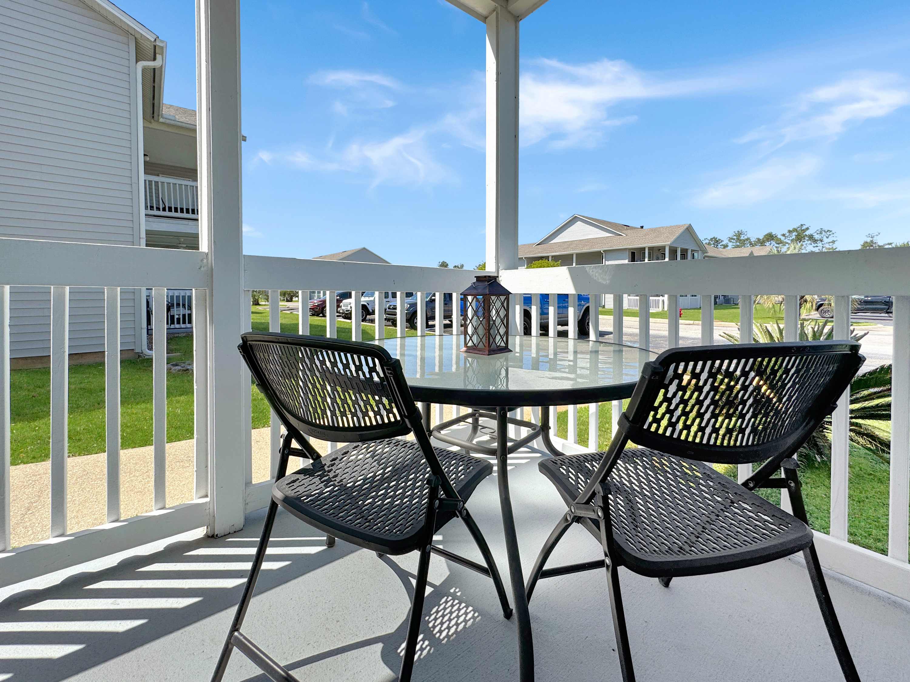 Step inside this resort-style condo and feel the calm coastal vibes takeover. The kitchen is a dream for morning coffee lovers, offering both a drip machine and Keurig, surrounded by crisp white cabinets and gleaming stainless steel appliances. Enjoy meals and laughter around the dining table that seats six comfortably. The living room is a cozy gathering space, complete with a smart TV, plush couch, and two inviting armchairs—perfect for movie nights or lazy afternoons. Slide open the glass doors and step onto your private, covered patio, where a table for two and extra seating invites you to sip cocktails in the warm evening breeze. Plus, beach essentials are thoughtfully provided, so you’re always ready for a spontaneous seaside escape.