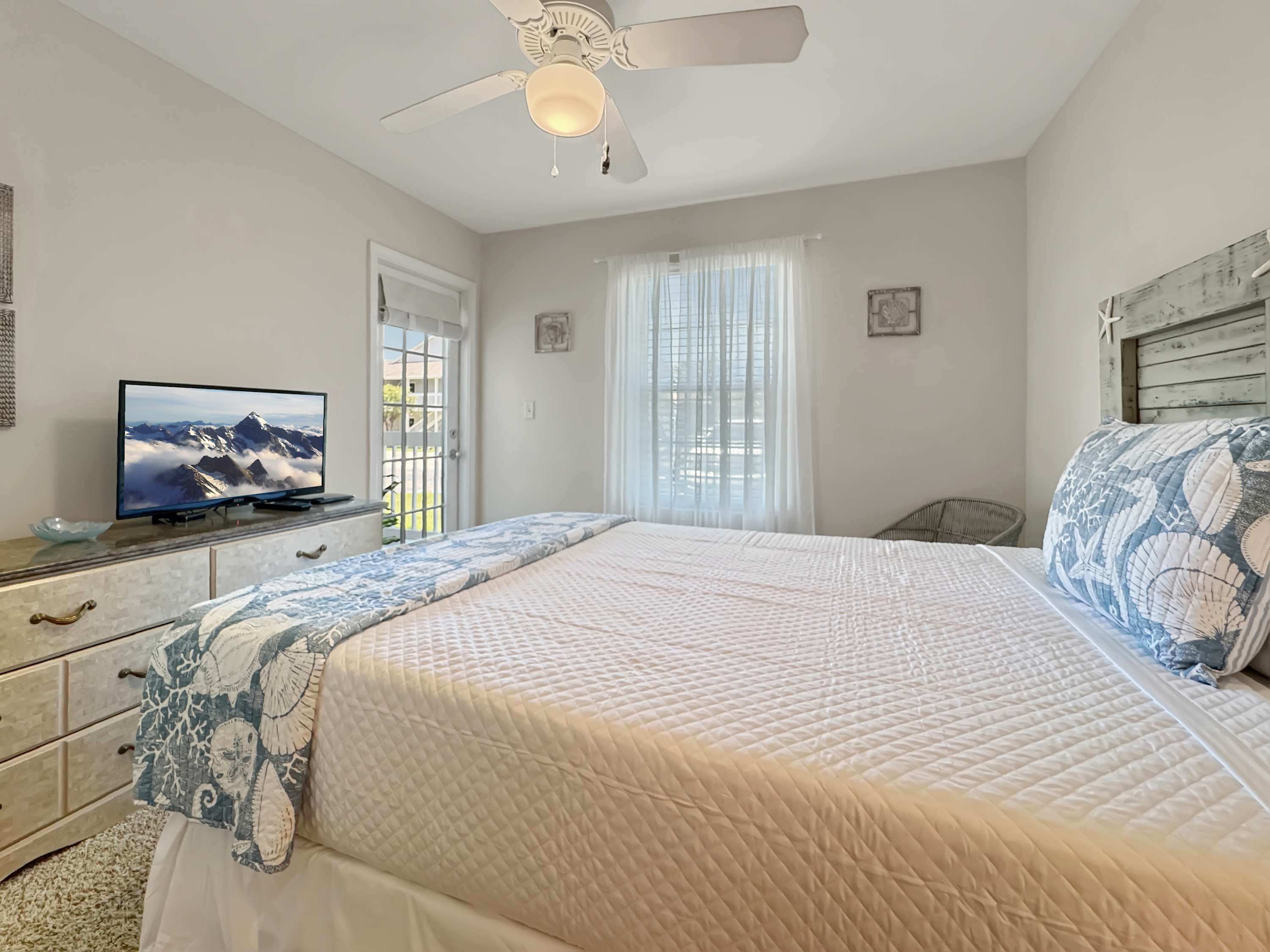 Bedroom #1 includes a queen size bed, patio access, and a smart TV.