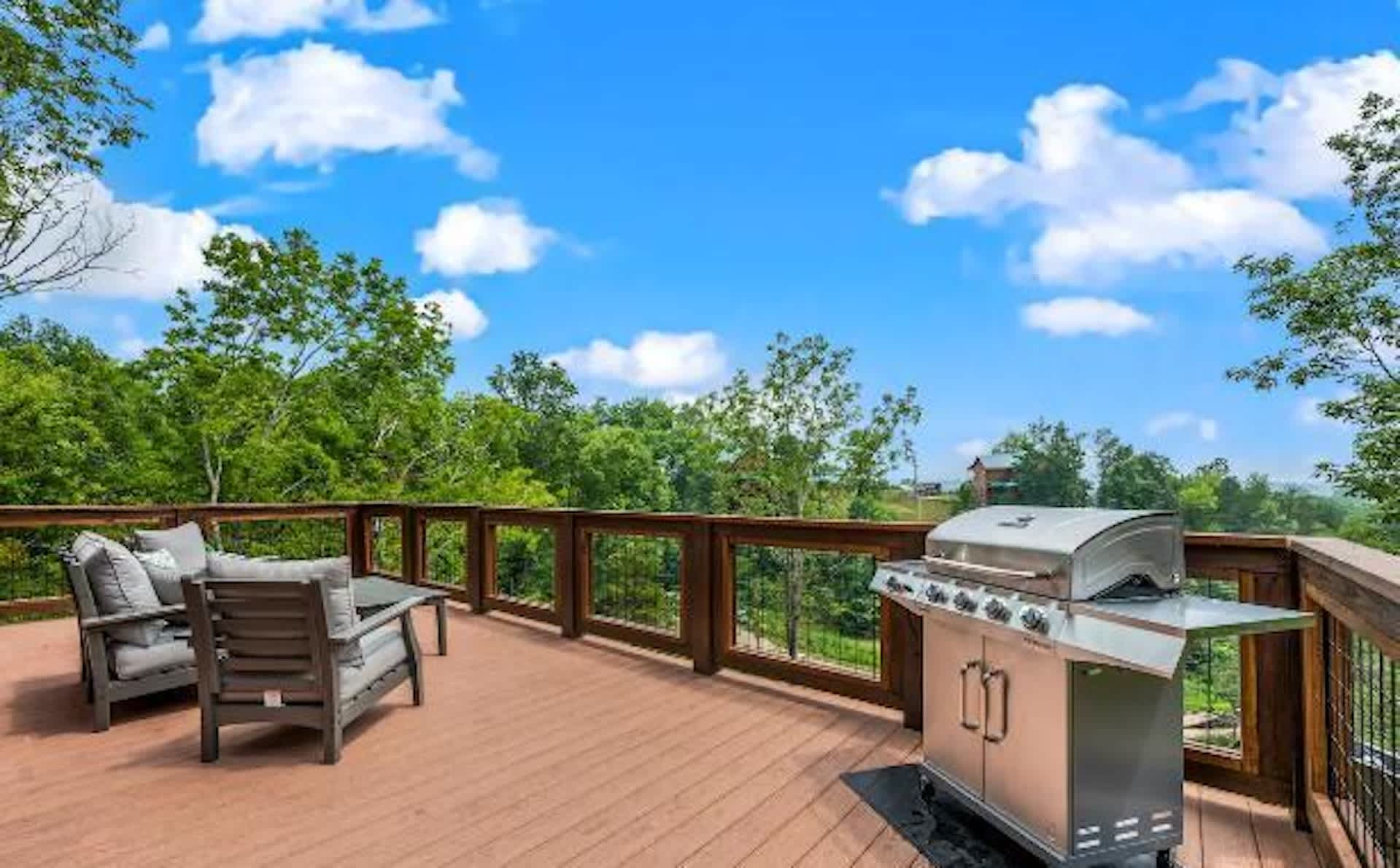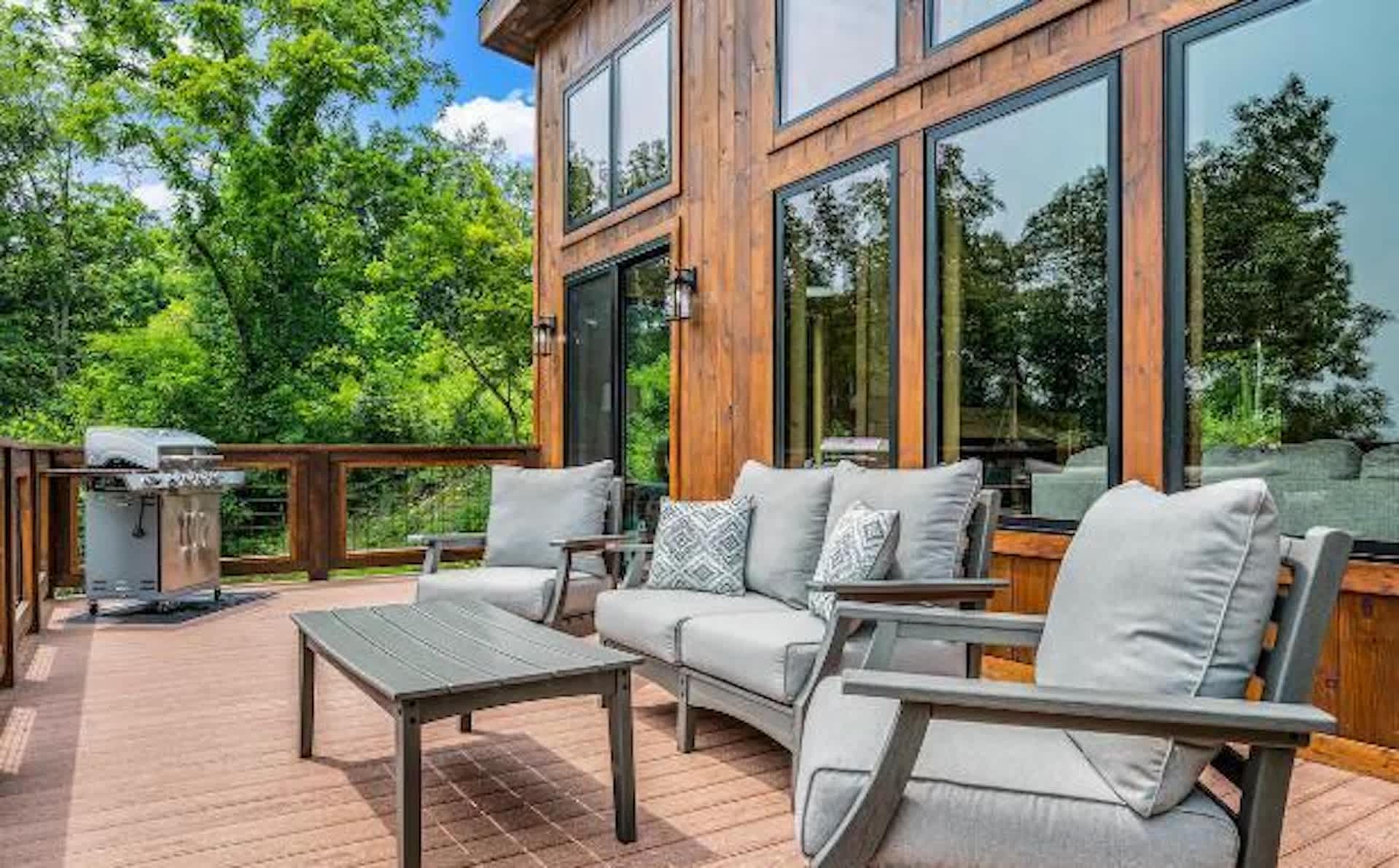 • Outdoor deck seating and a BBQ grill