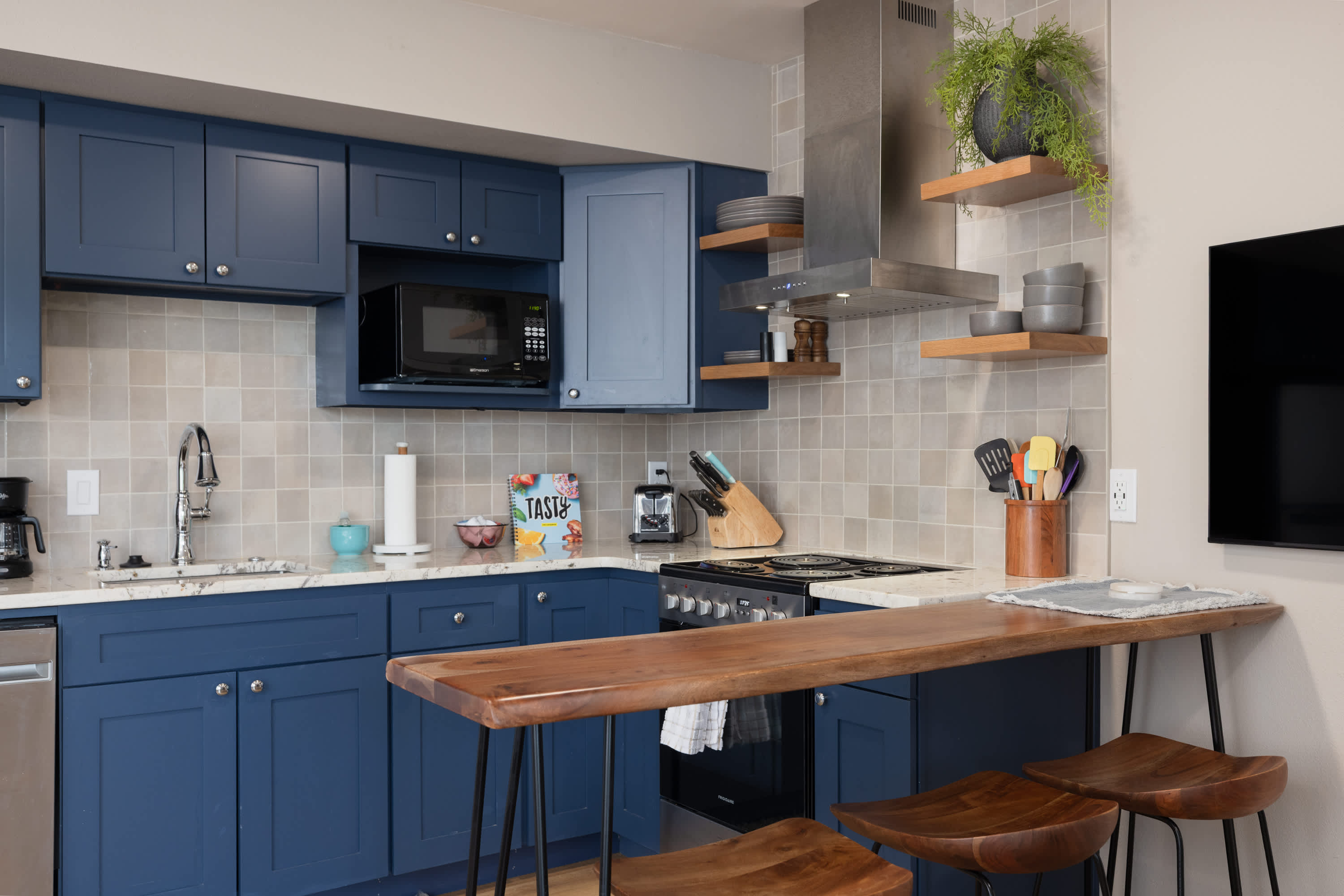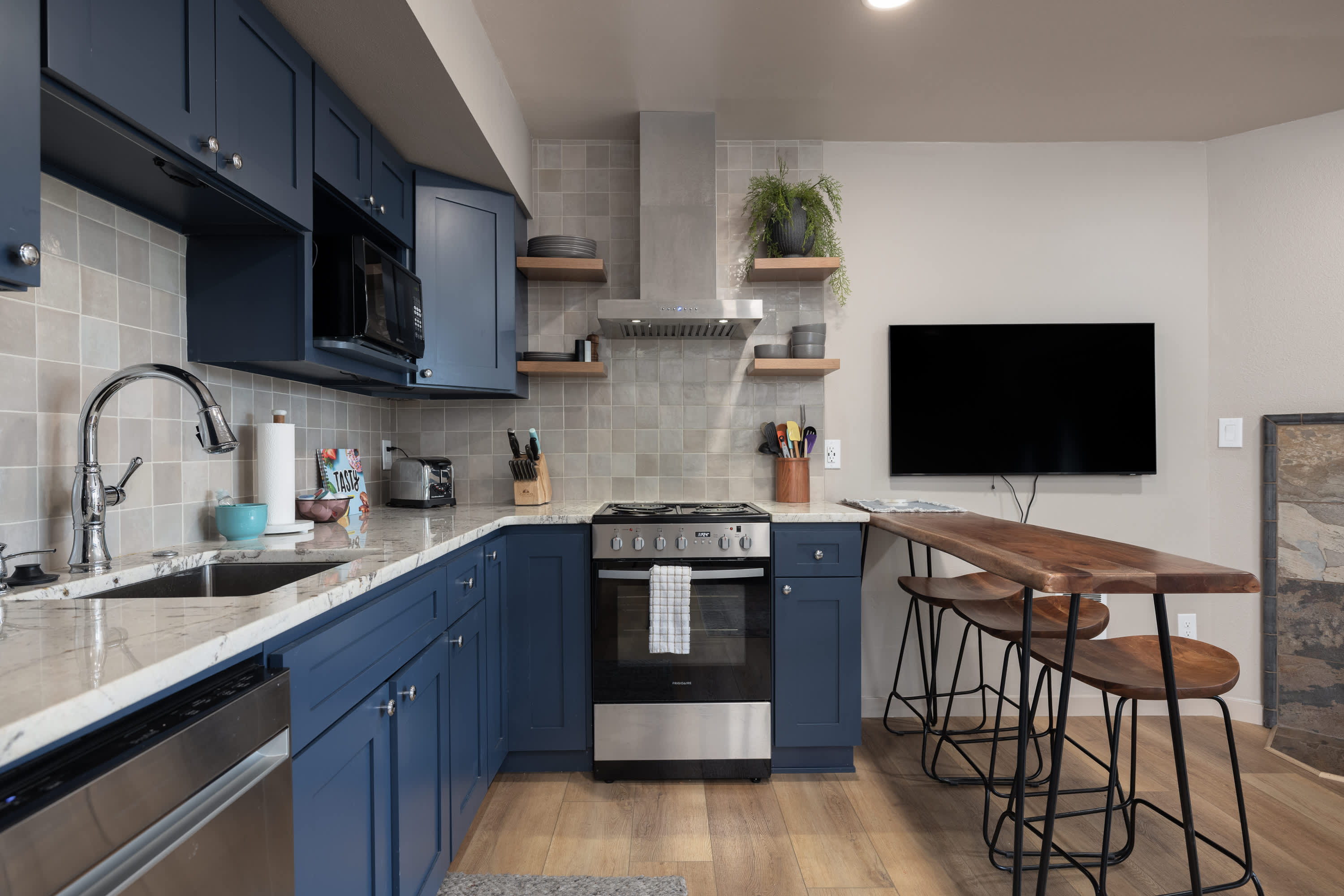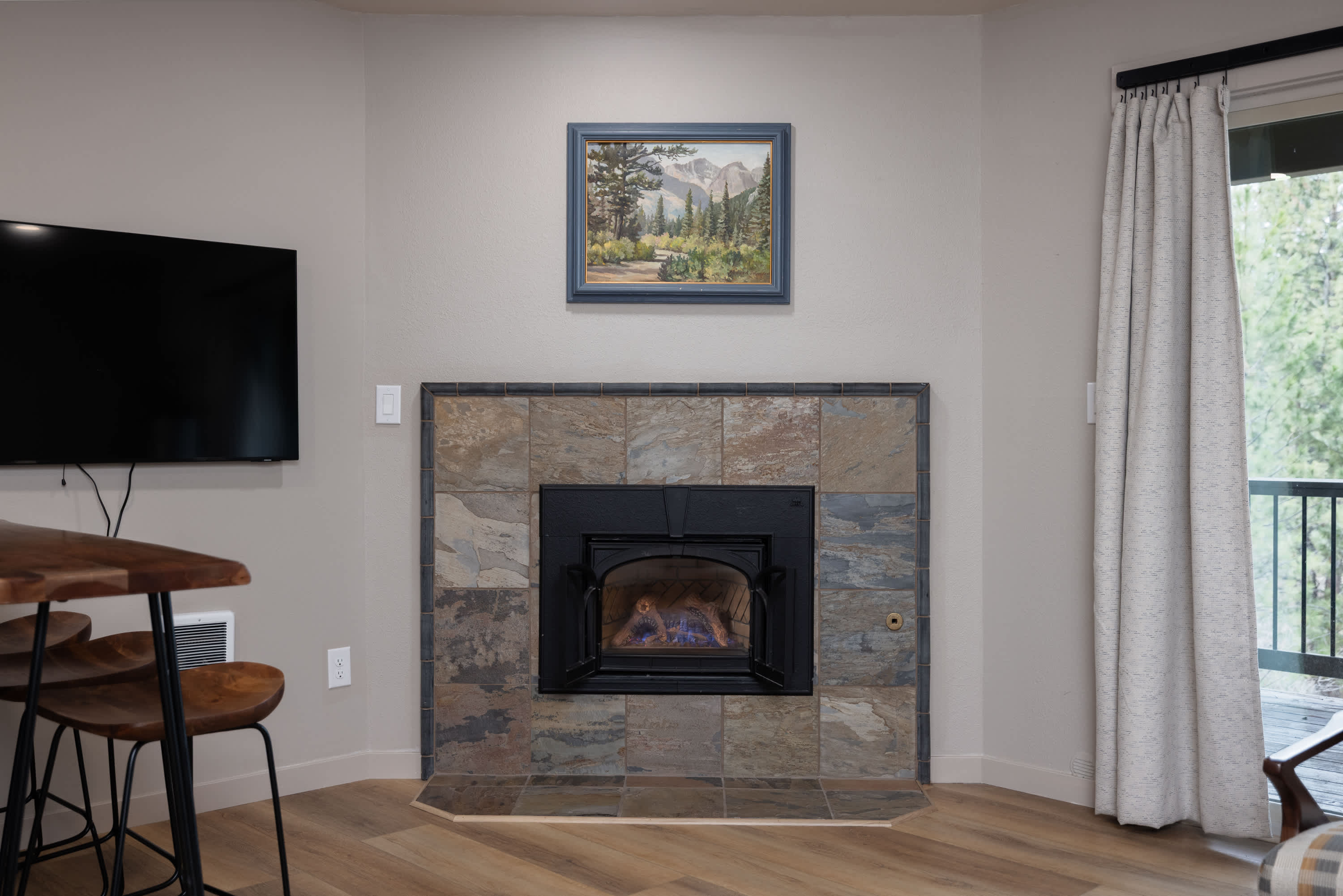 Step inside the condo and experience a space that invites you to slow down and settle in. The kitchen greets you with bold blue cabinets and elegant light stone countertops, fully stocked with everything you need—including both a Keurig and a drip coffee maker—for the perfect morning brew. Pull up a seat at the high-top counter with space for three and enjoy breakfast while the morning light streams in. The living room is cozy and welcoming, with plush armchairs, a smart TV, and a fireplace that’s perfect for unwinding after a day outdoors.