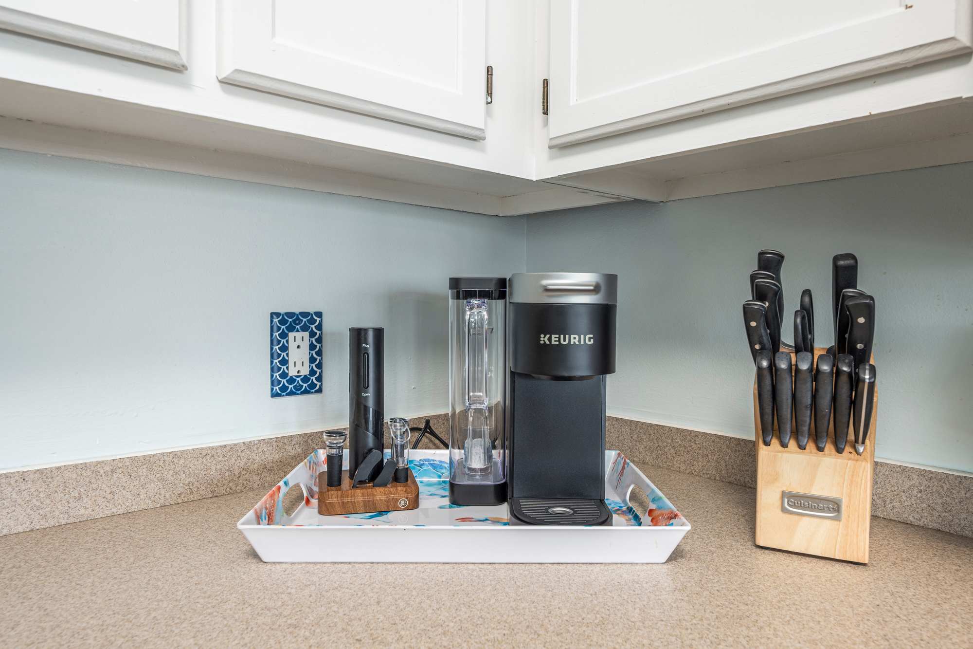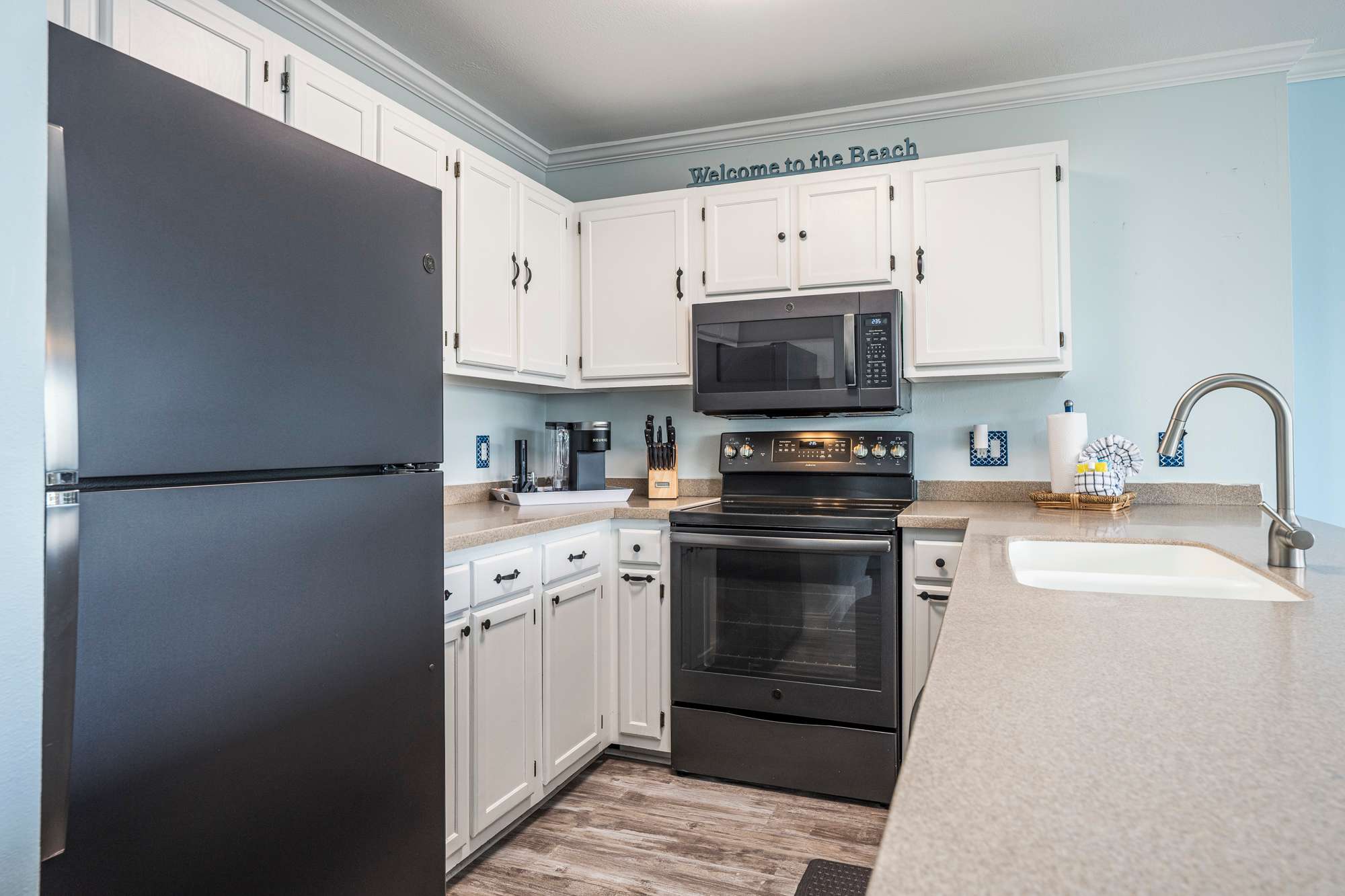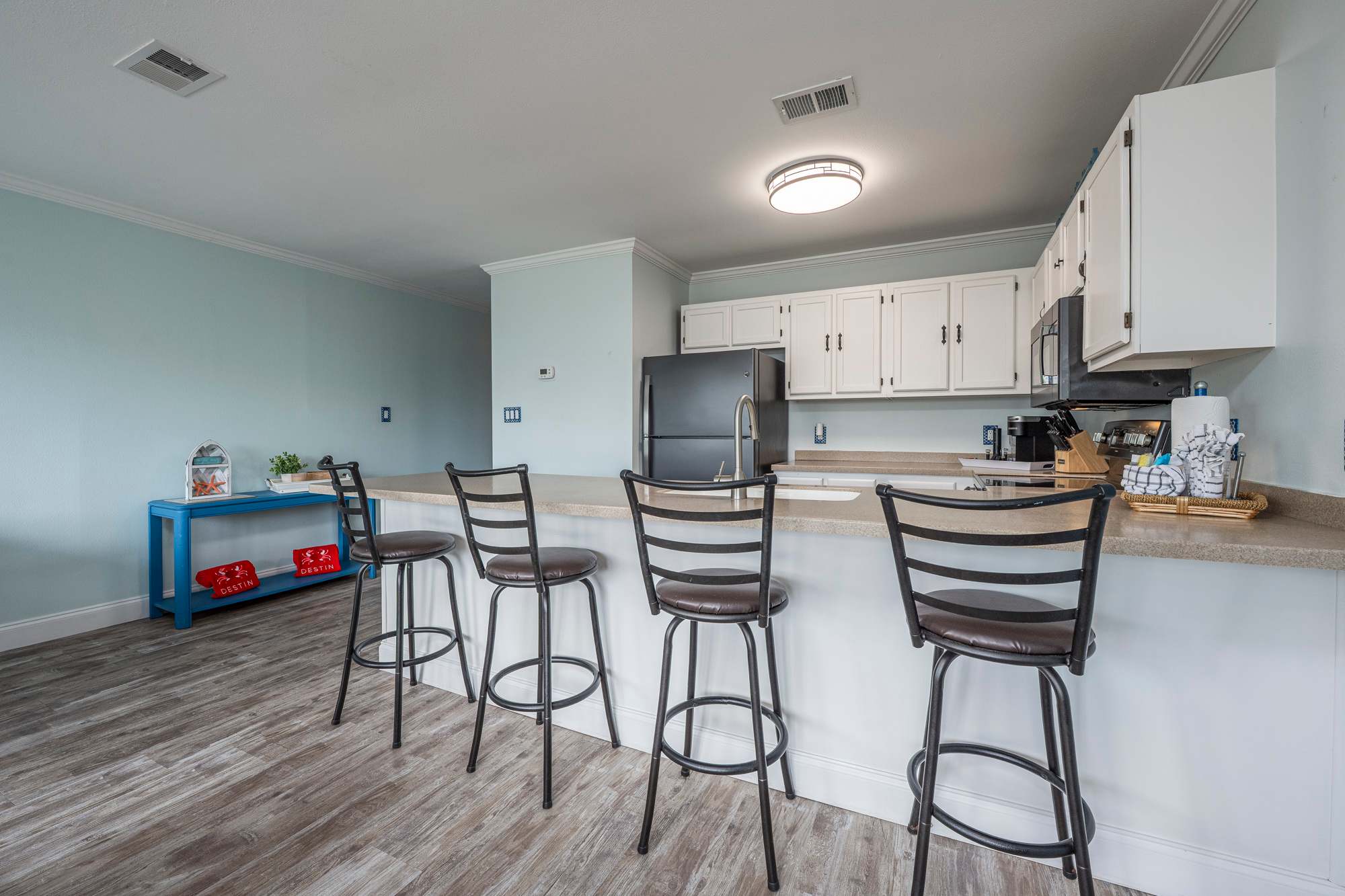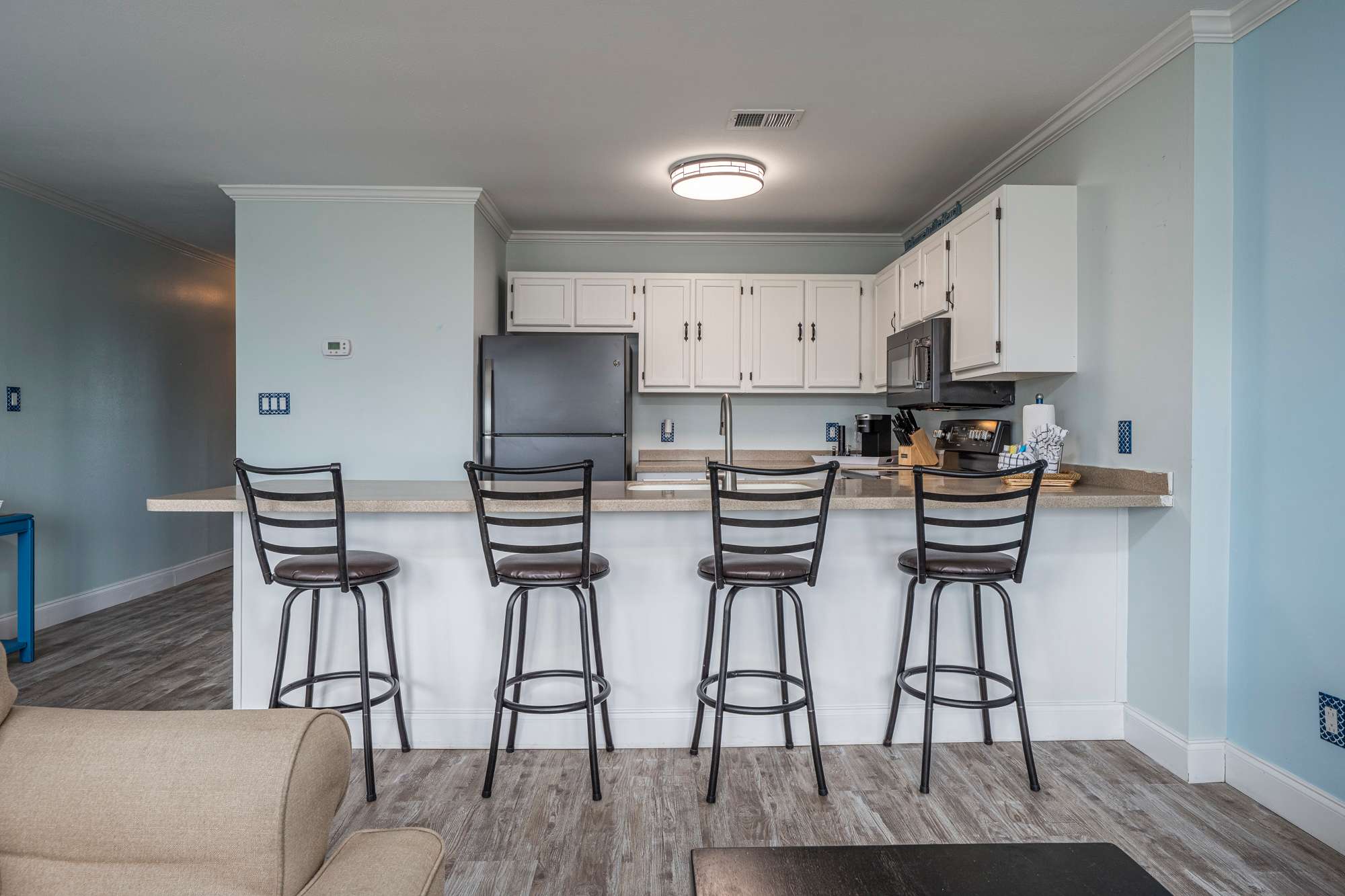 This open‑concept kitchen blends modern style with everyday convenience, featuring dark stainless steel appliances, ample counter space, and a fully stocked setup for effortless meal prep. Start your mornings with your choice of drip or single‑cup coffee before gathering at the bar‑top seating for four—perfect for breakfast, casual meals, or evening drinks. The kitchen also includes thoughtful extras like a sphere‑shaped ice maker, blender, complete knife set, electric wine opener, wine aerator, wine chiller, wine corks, and an assortment of glassware including wine, rocks, and Moscow mule glasses, along with shaker cups—everything you need to cook, mix, and unwind with ease.