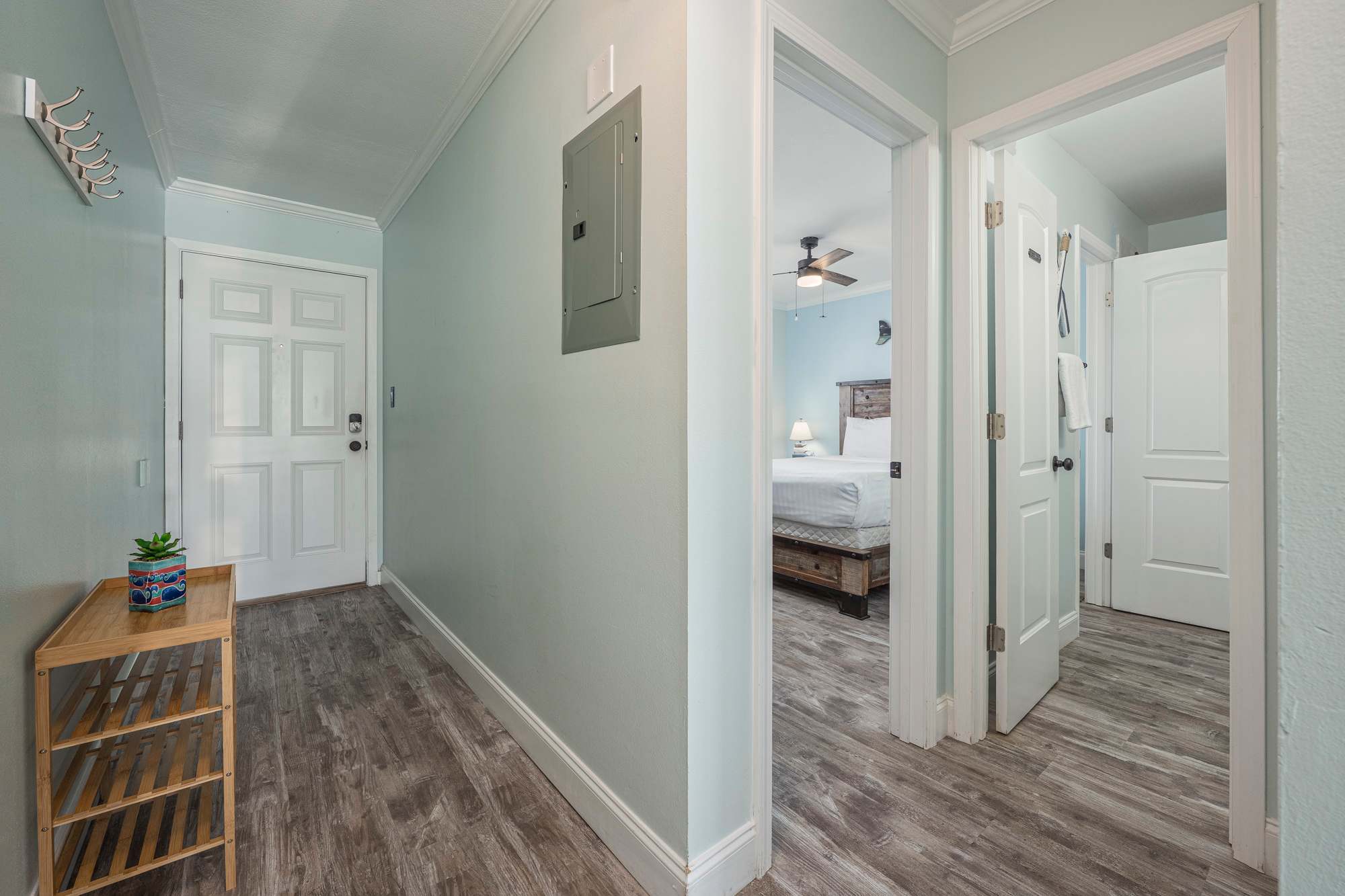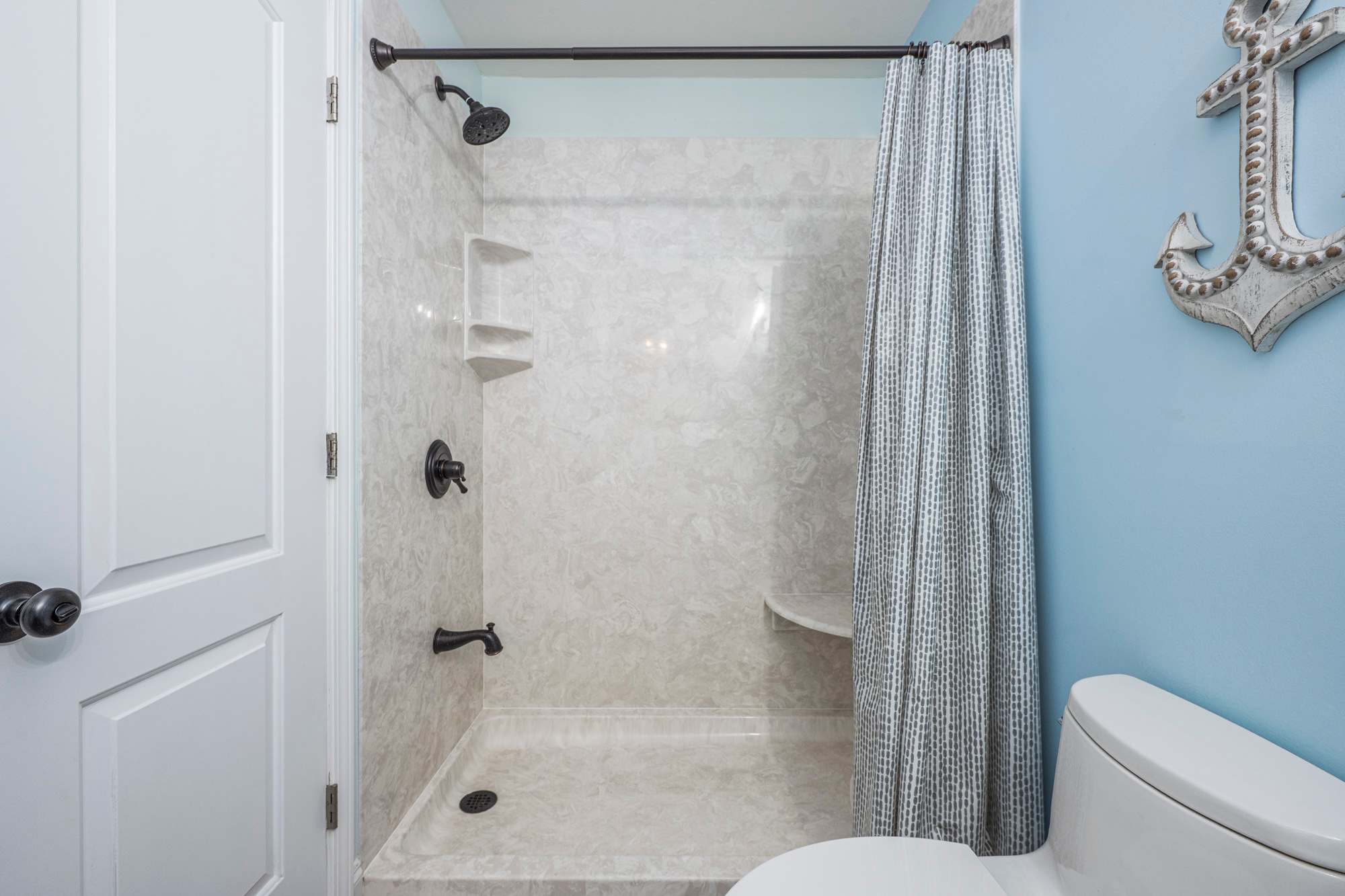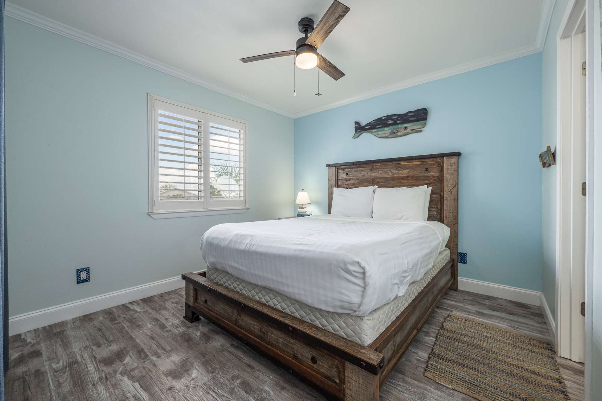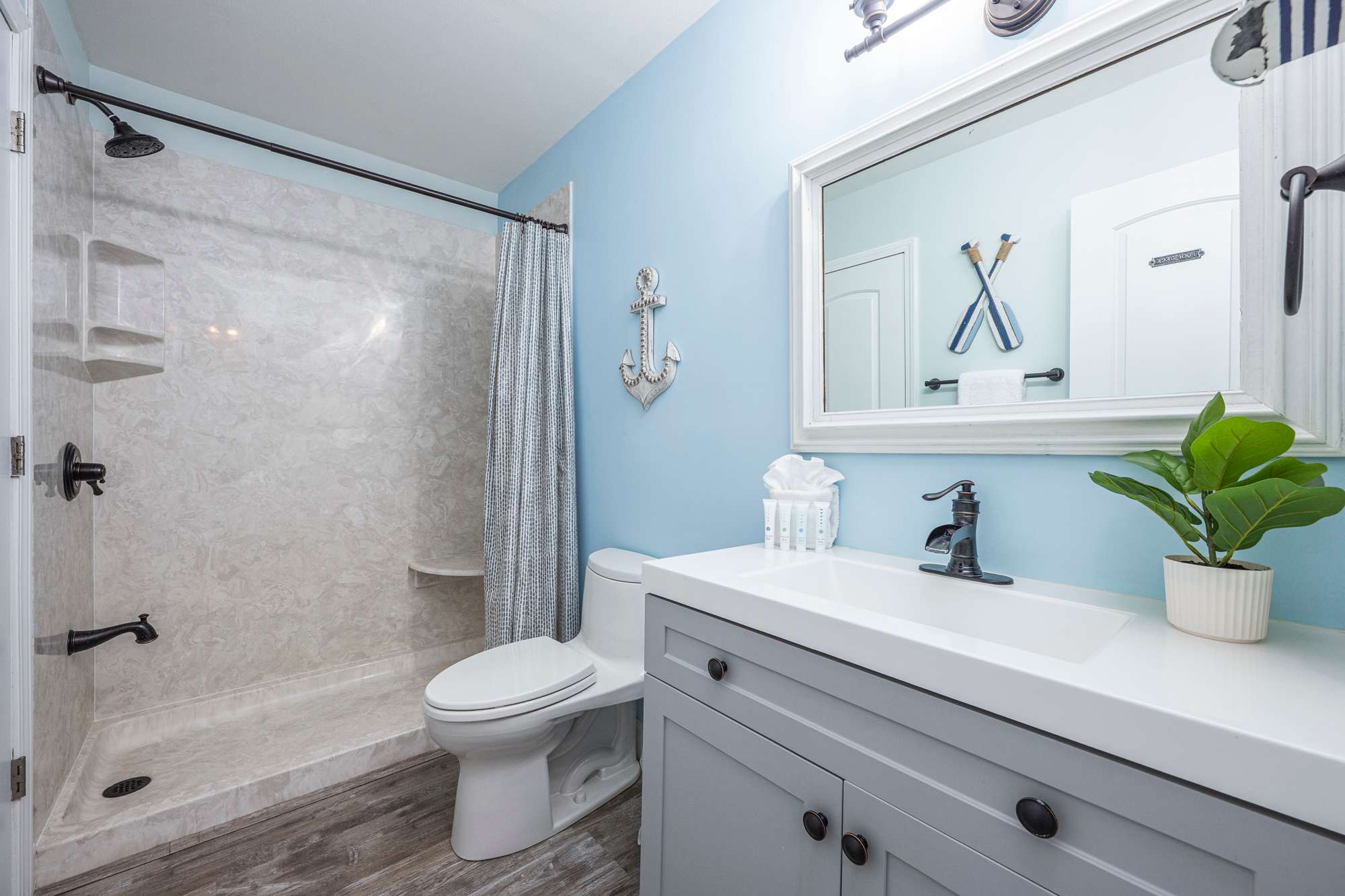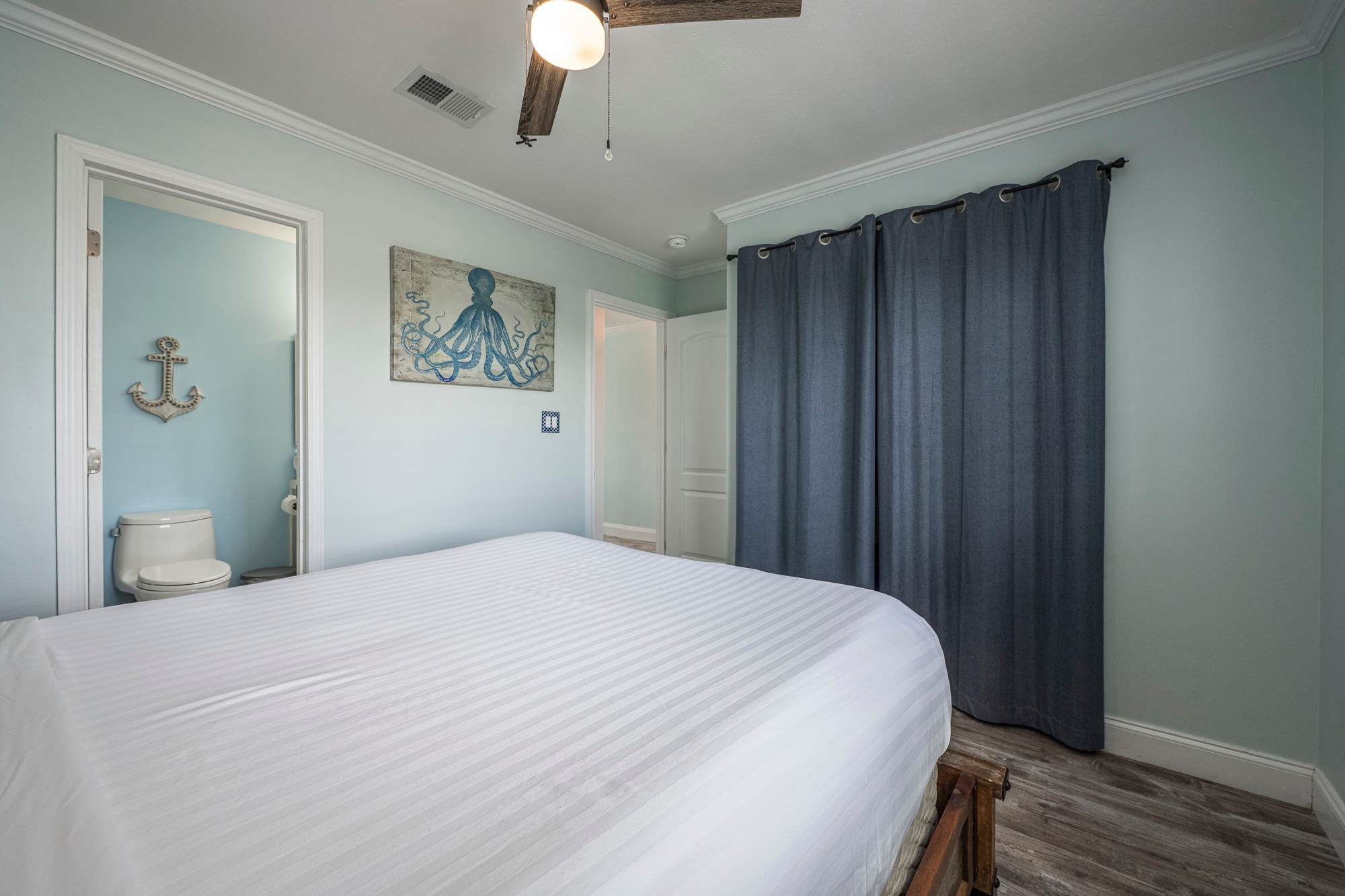 The bedroom features a comfortable queen‑size bed, a ceiling fan, and direct access to a Jack‑and‑Jill bathroom with a single vanity and a walk‑in shower for added convenience. Inside the bedroom closet, you’ll also find beach gear provided for your stay, including a beach wagon, Adult sized life jackets paired with an inflatable paddle board, yeti cooler, sand toys, skim boards, a beach umbrella, and beach chairs—everything you need for effortless days at the beach.