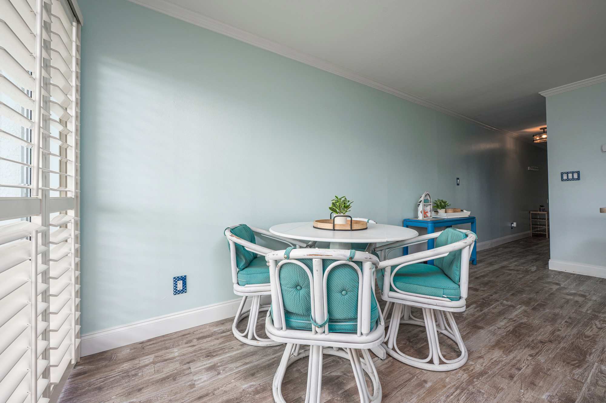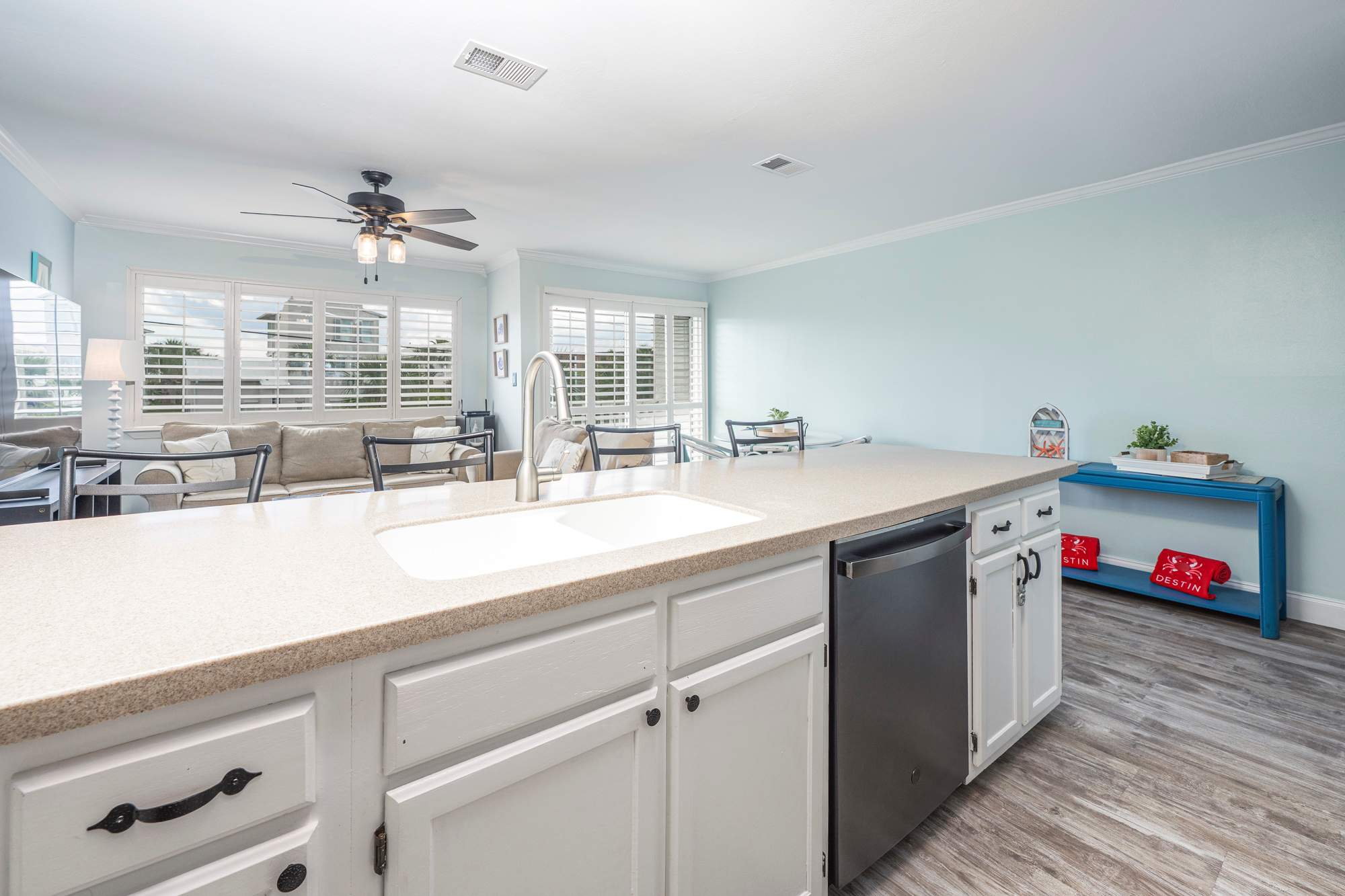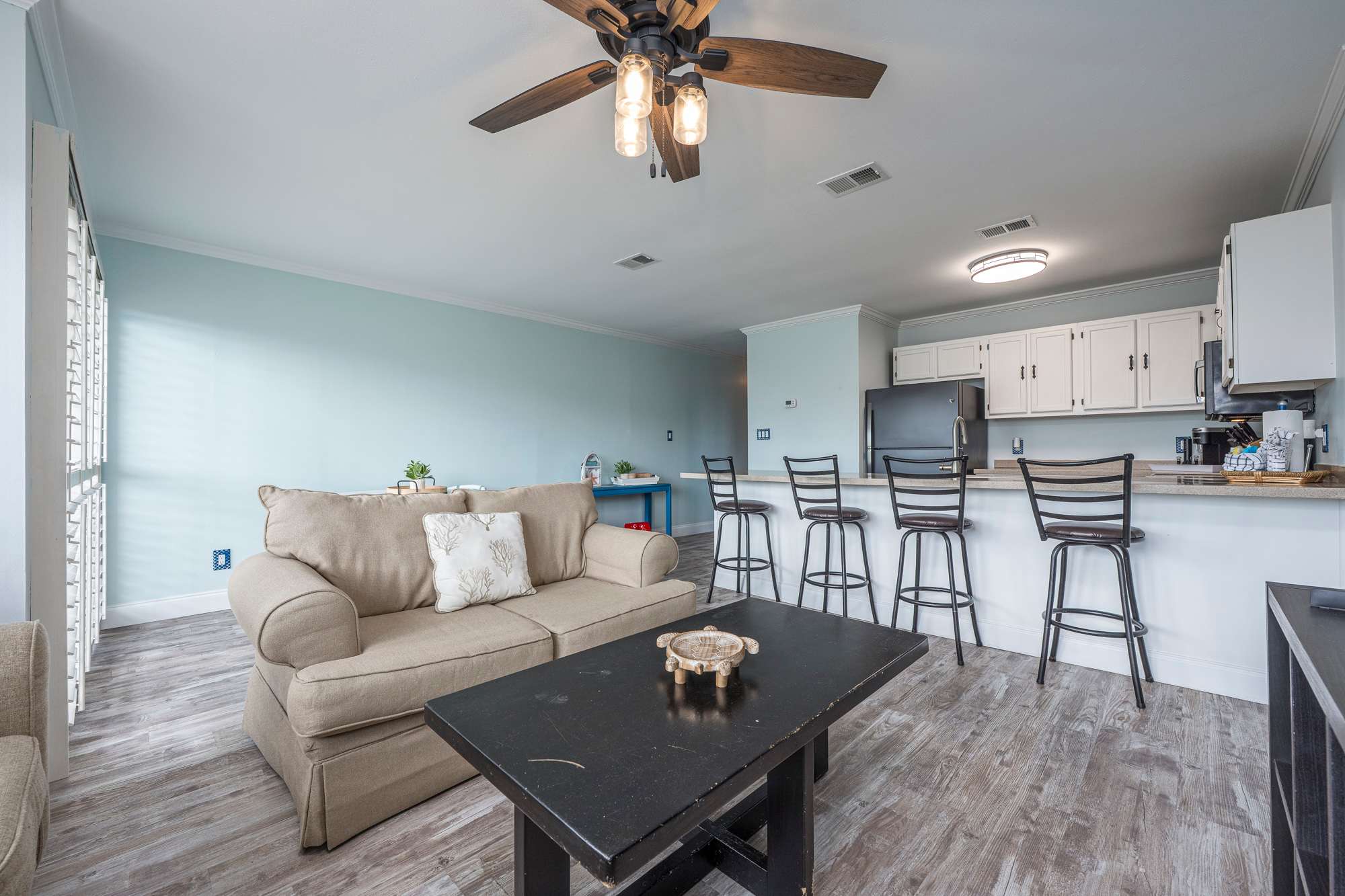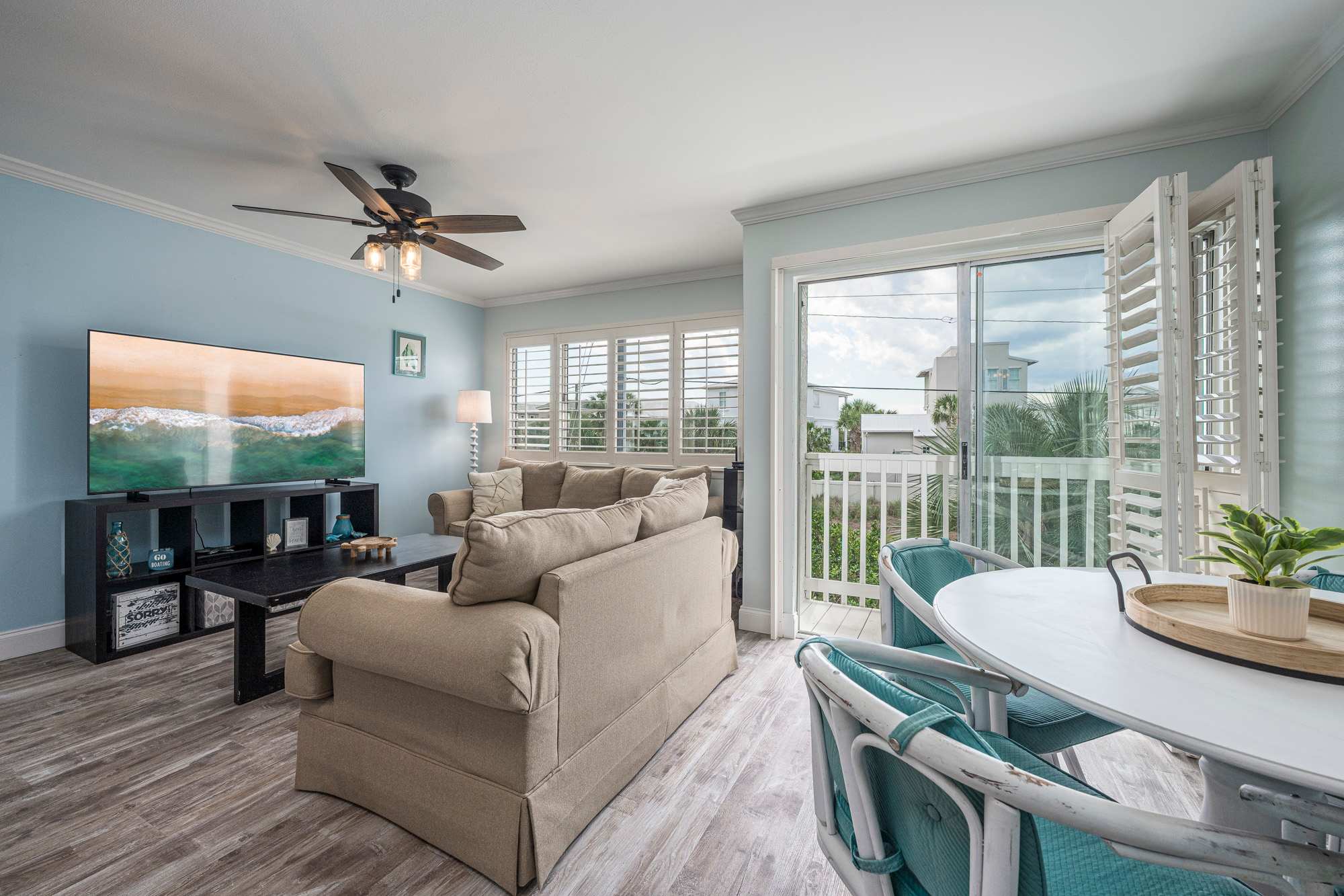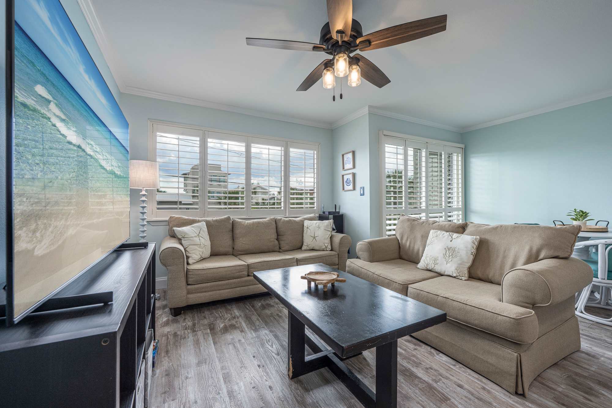 Step into a bright, coastal‑inspired living room thoughtfully designed for comfort and relaxation. Soft blue walls and large windows with plantation shutters fill the space with natural light, while a plush sofa that converts to a queen‑size sleeper and a coordinating loveseat provide inviting seating for lounging or movie nights, centered around a large coffee table. A large smart TV is paired with a sound system and DVD player for an enhanced entertainment experience. Finished with tasteful beach décor, this airy space is the perfect place to unwind after a day by the shore.