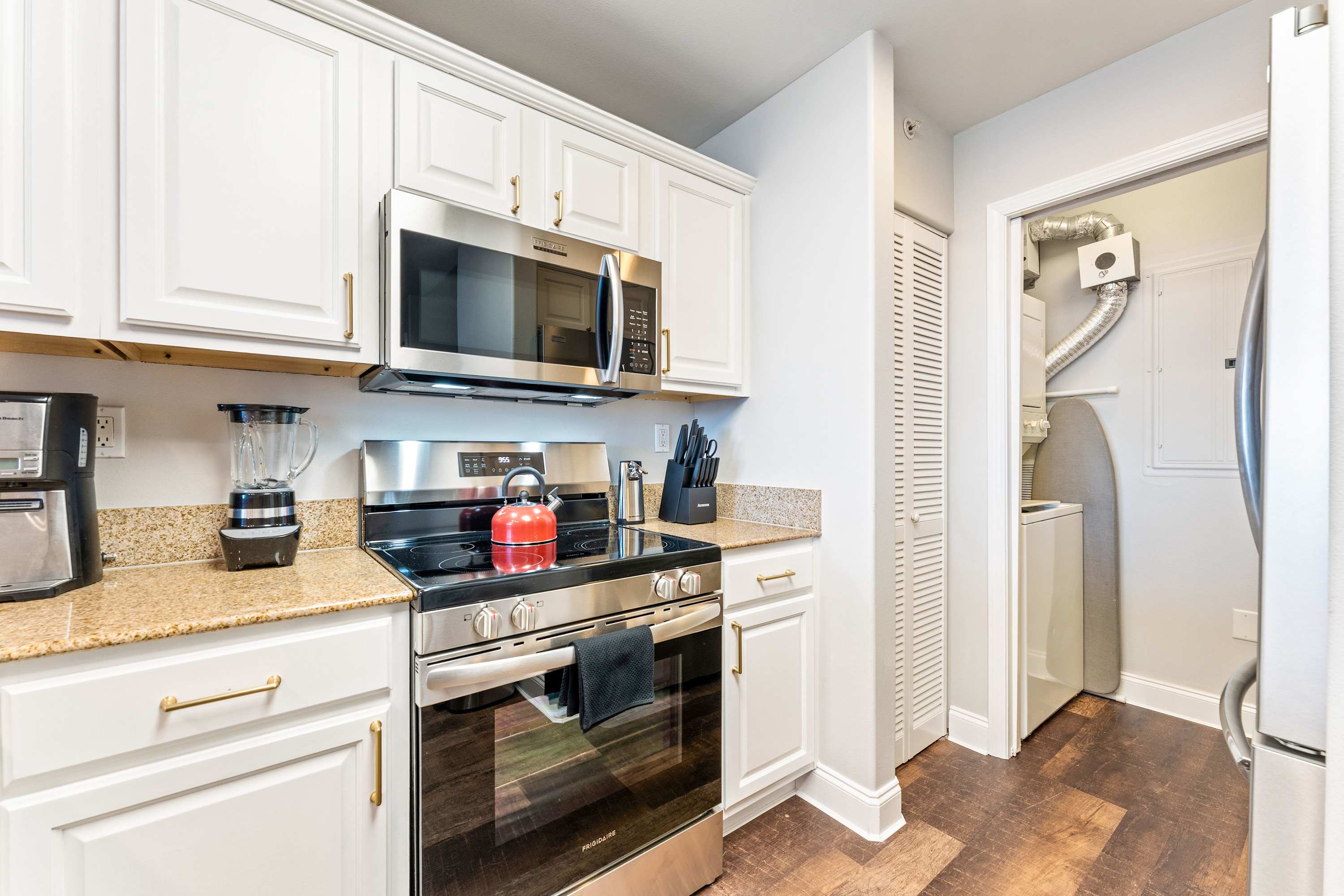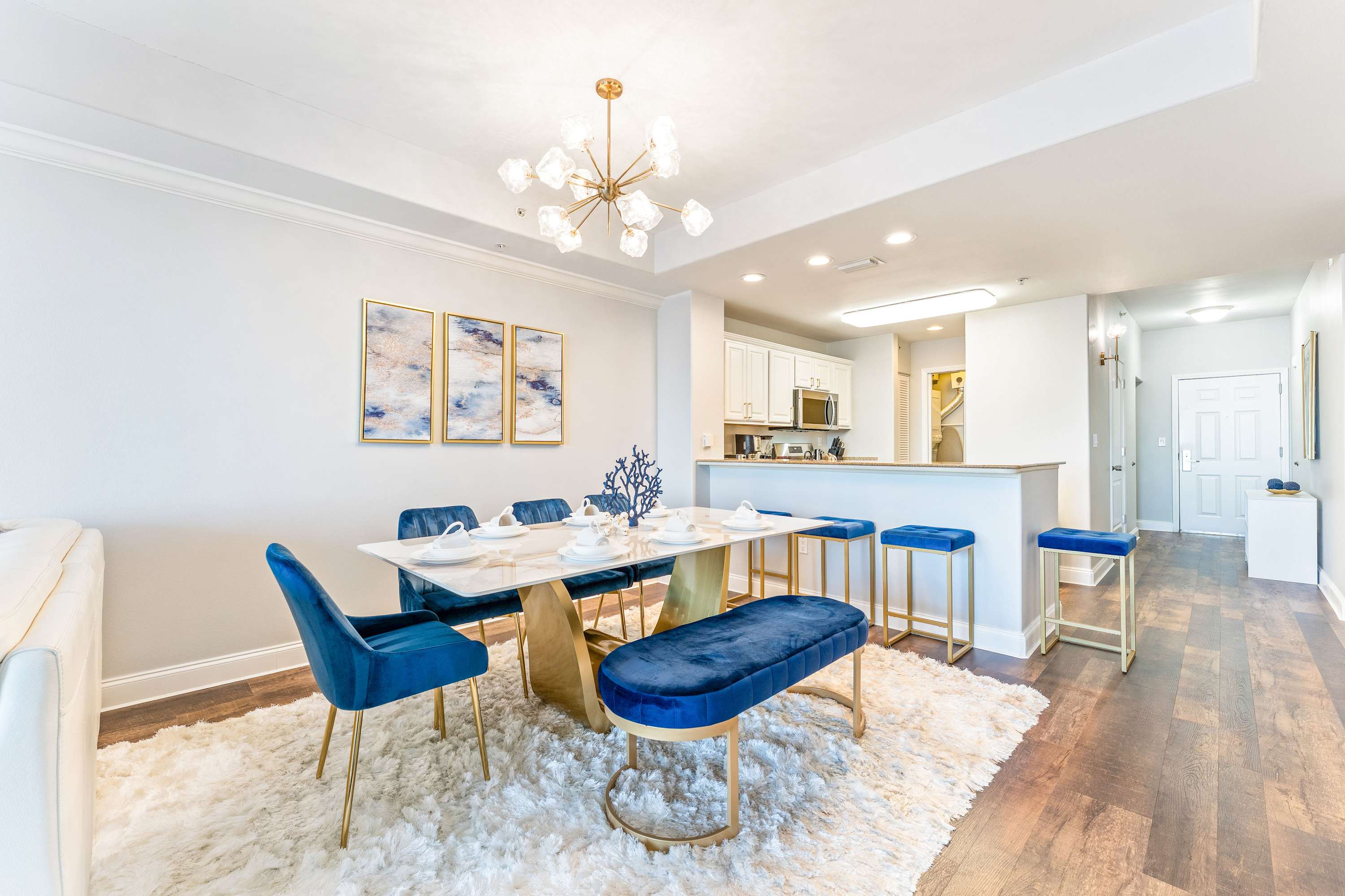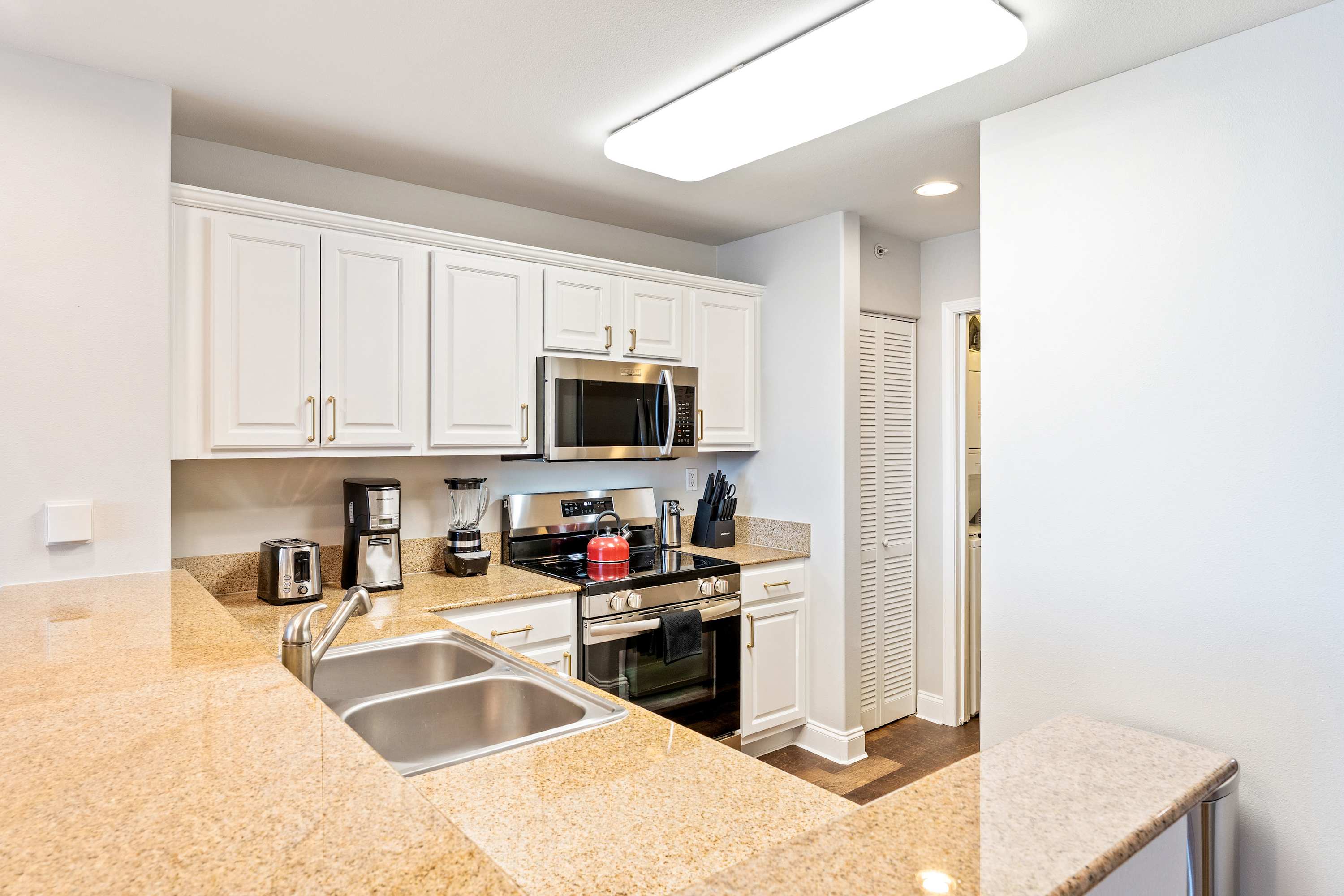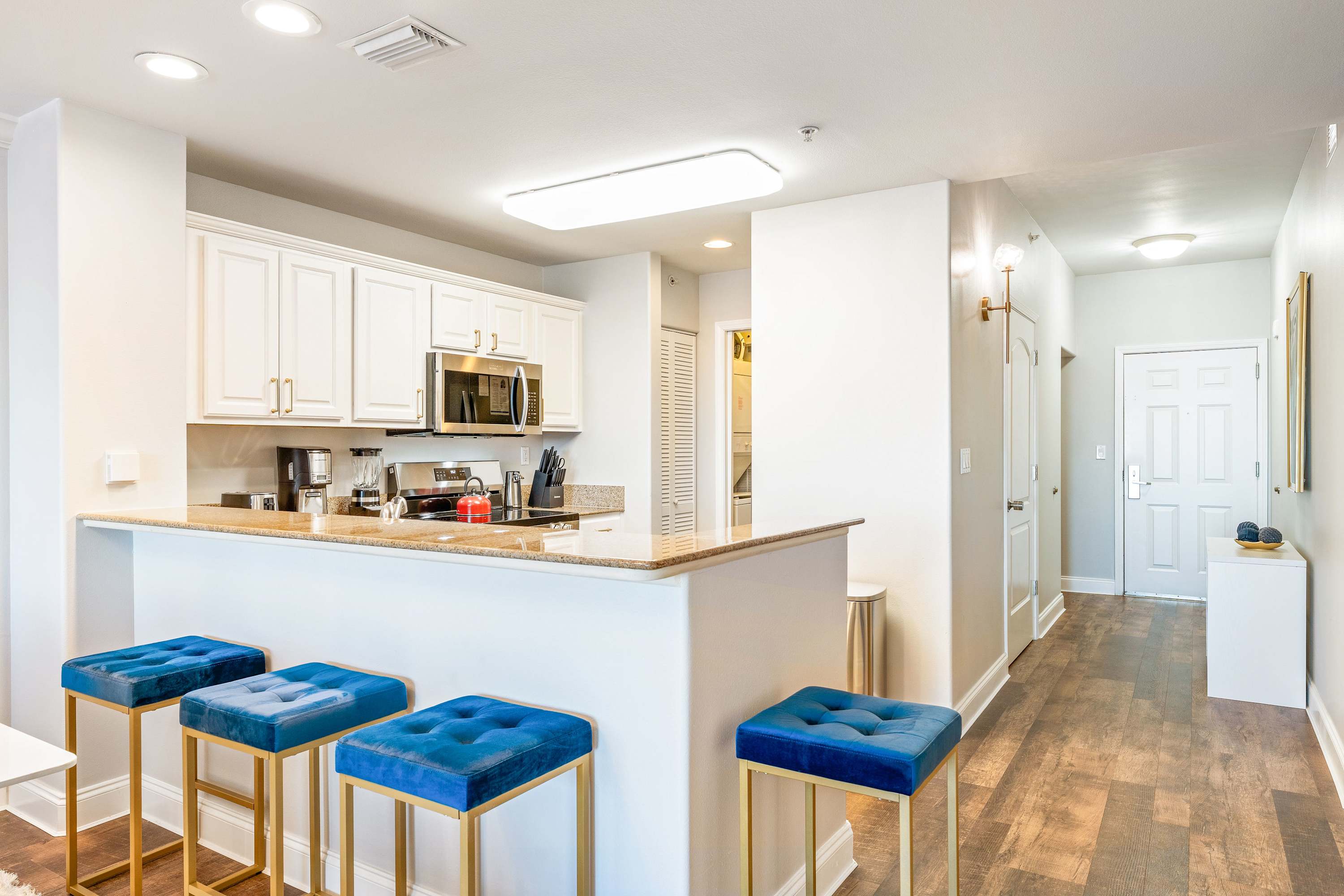 Step inside this beautifully designed condo, where modern elegance meets comfort. The kitchen welcomes you with sleek white cabinetry, striking brown granite countertops, and stainless appliances. Whether you’re preparing breakfast or enjoying a late-night snack, the counter seating for four makes it a great place to gather. Just beyond, the dining area features a sophisticated white marble-top table with seating for seven—perfect for family meals or game nights. Speaking of game nights, this home includes its own private game room, complete with a stand-up arcade game, Pac-Man, Mortal Kombat, and a ring toss game.