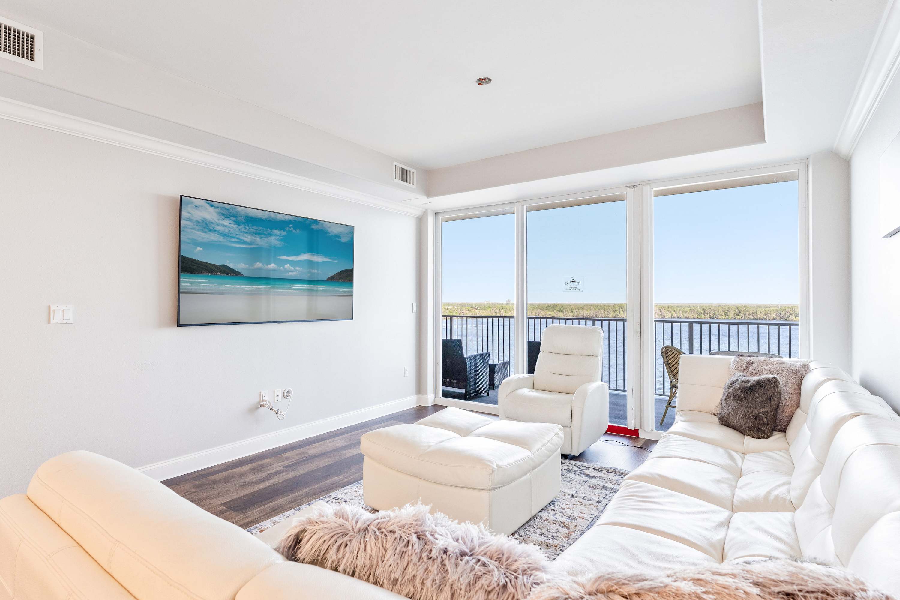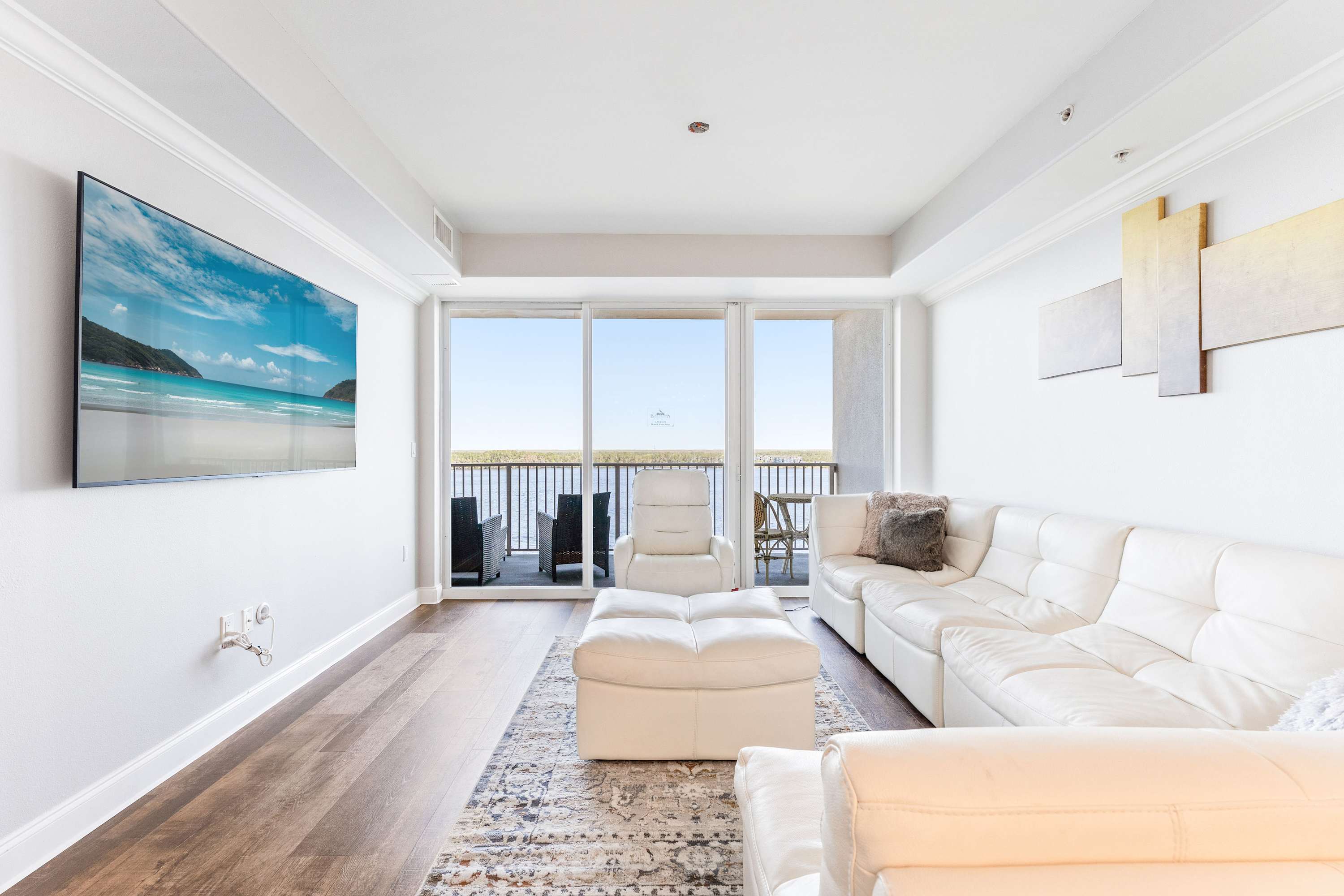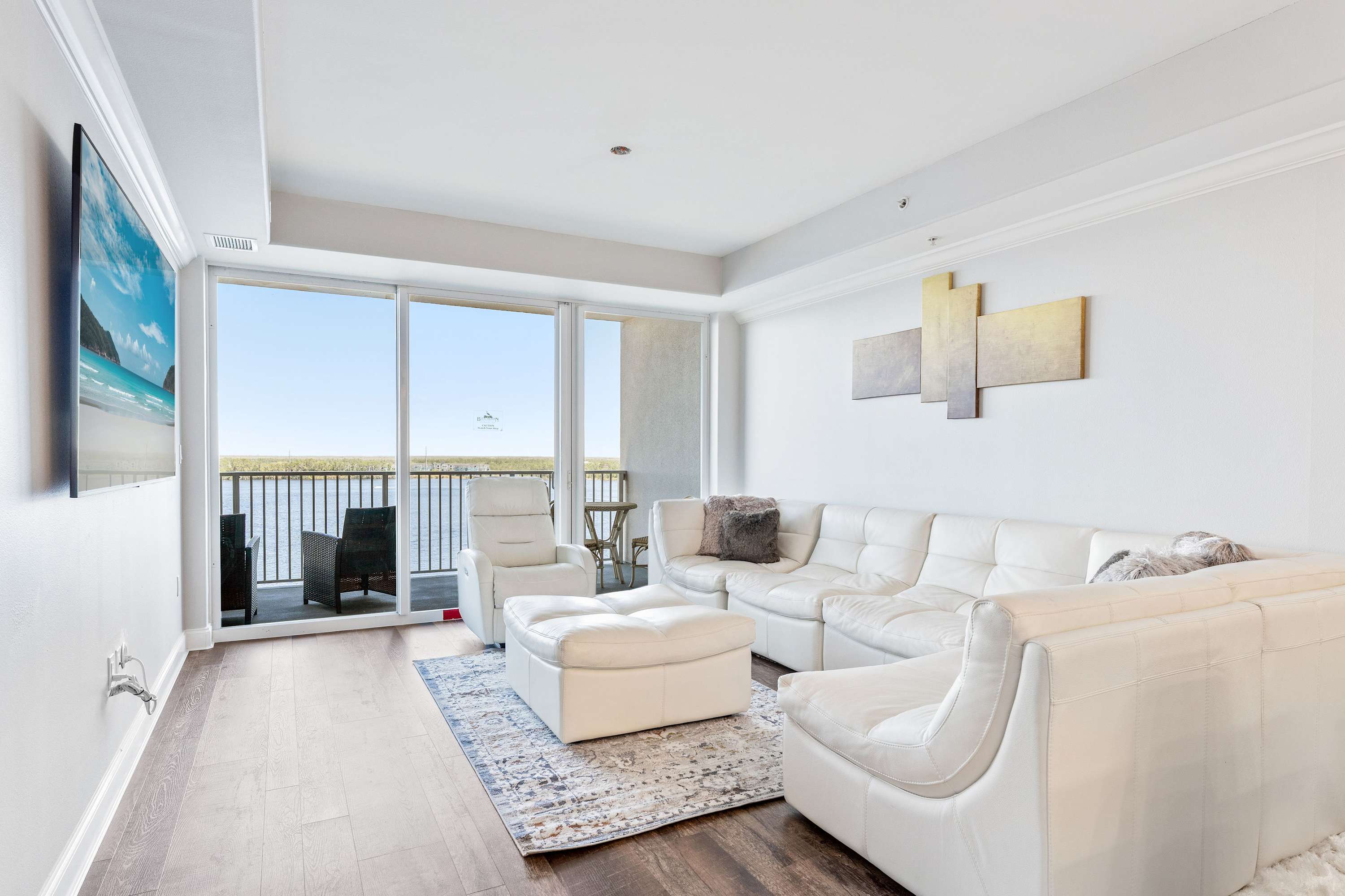 Head into the open-concept living space to unwind in style, featuring a wrap-around white leather sectional that comfortably seats six, along with a matching recliner and ottoman for added relaxation. A smart TV is mounted for your entertainment, ideal for movie nights after a day of adventure. But the true showstopper is the oversized sliding glass door that leads to your private balcony, where remarkable views of Lake Bryan and the resort’s pools and boardwalks await. The balcony includes comfortable seating and a table for two, providing the perfect spot to enjoy your morning coffee or a glass of wine at sunset.
