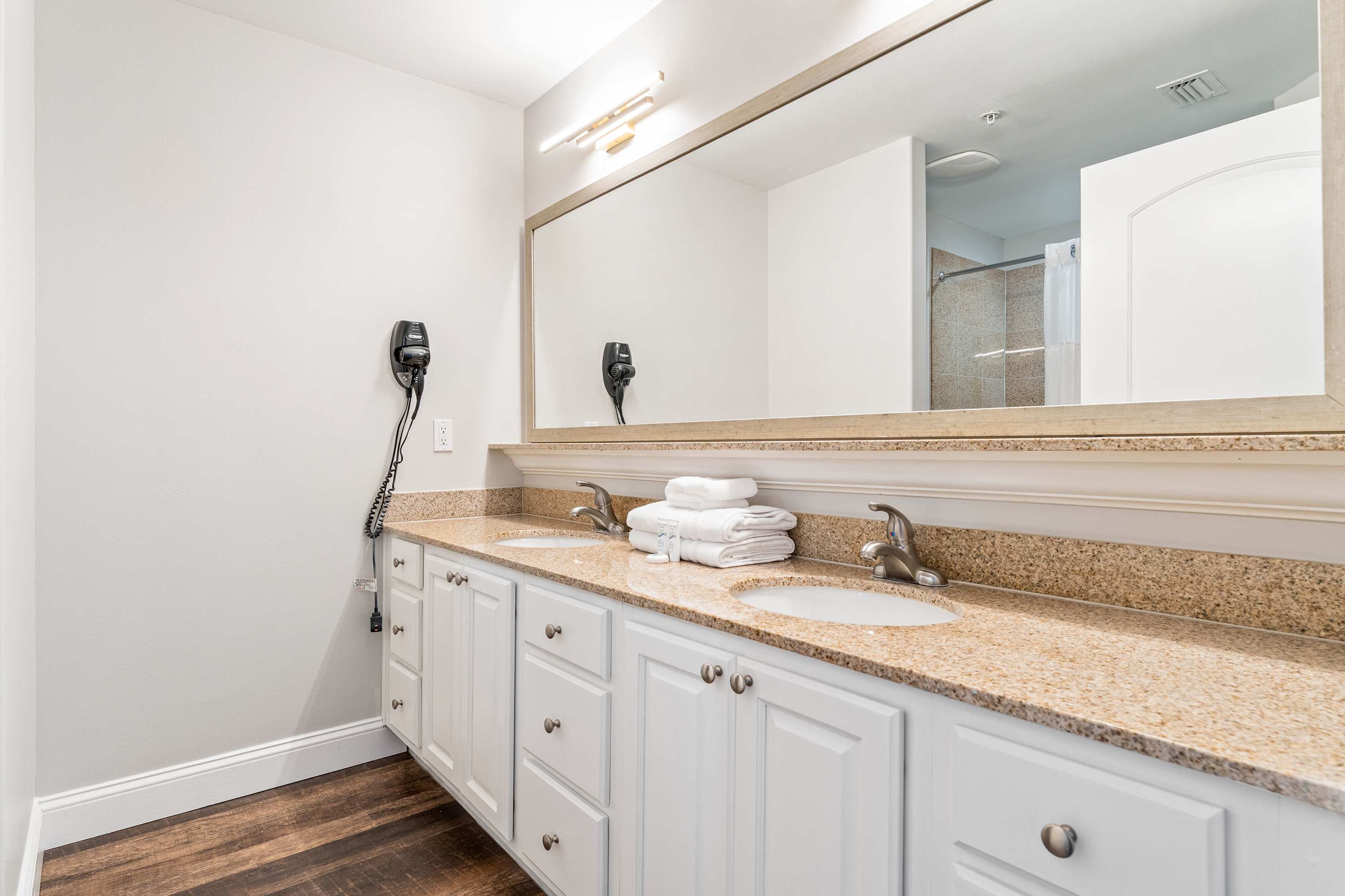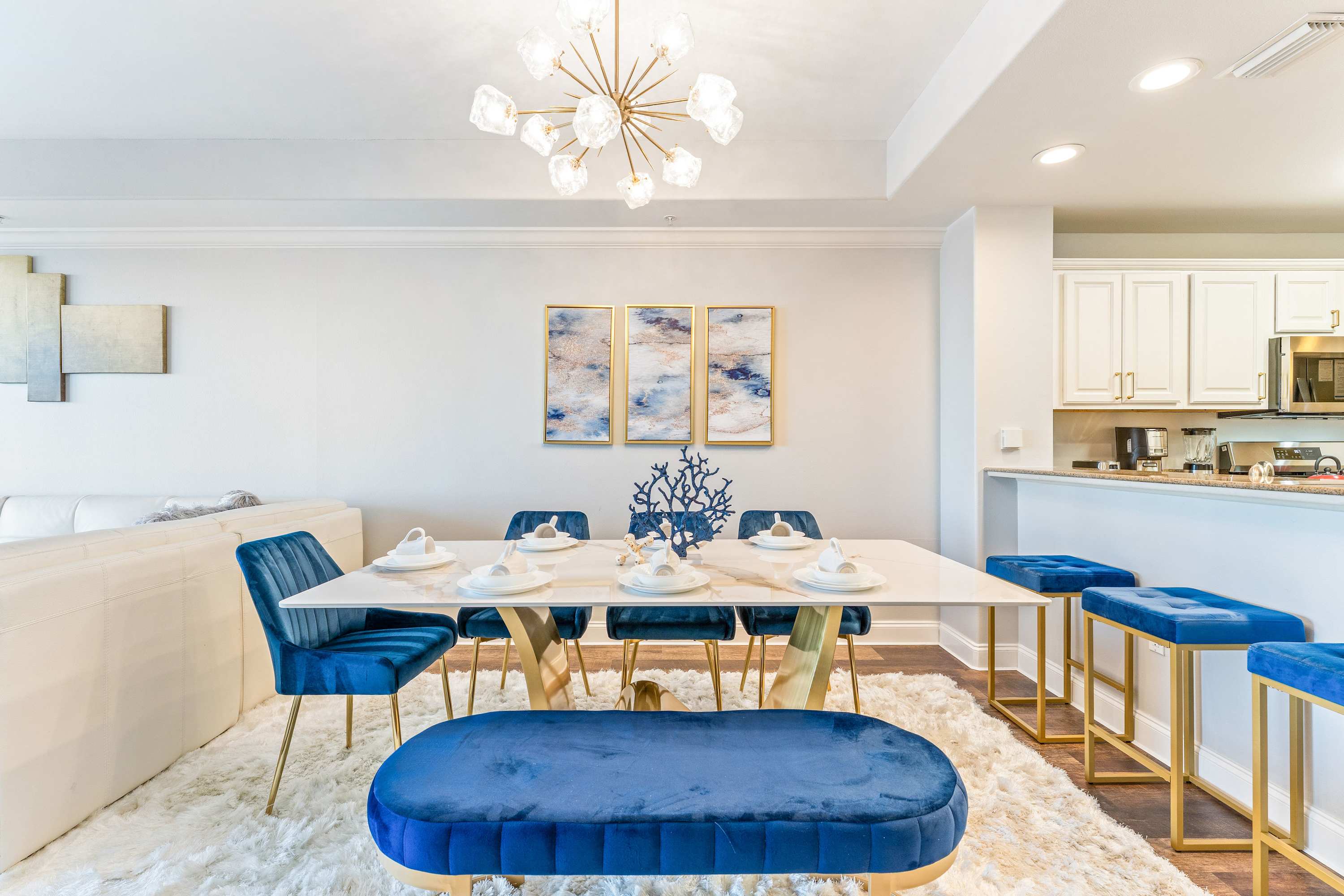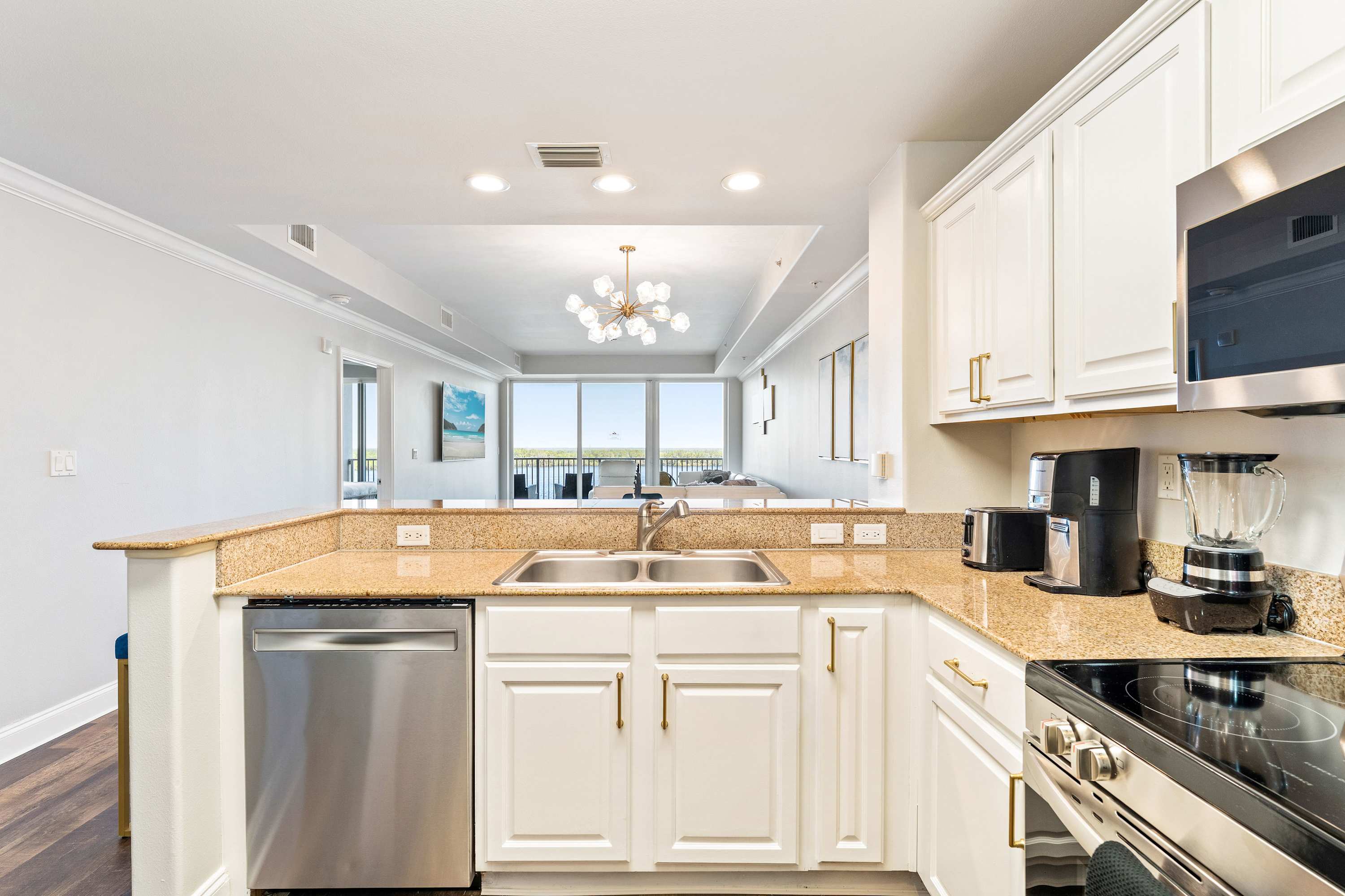 Head into the open-concept living space to unwind in style, featuring a wrap-around white leather sectional that comfortably seats six, along with a matching recliner and ottoman for added relaxation. A smart TV is mounted for your entertainment, ideal for movie nights after a day of adventure. But the true showstopper is the oversized sliding glass door that leads to your private balcony, where remarkable views of Lake Bryan and the resort’s pools and boardwalks await. The balcony includes comfortable seating and a table for two, providing the perfect spot to enjoy your morning coffee or a glass of wine at sunset.