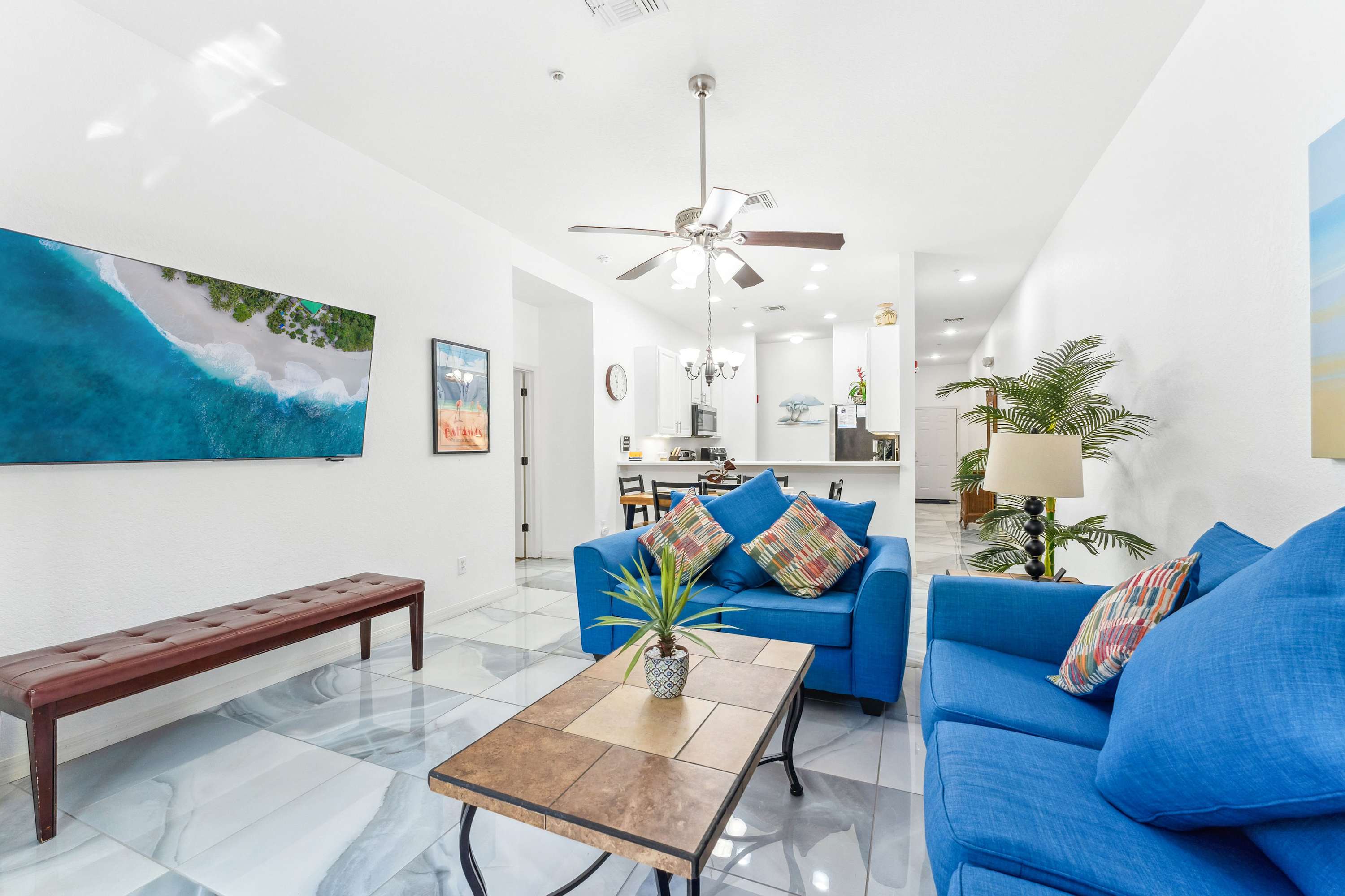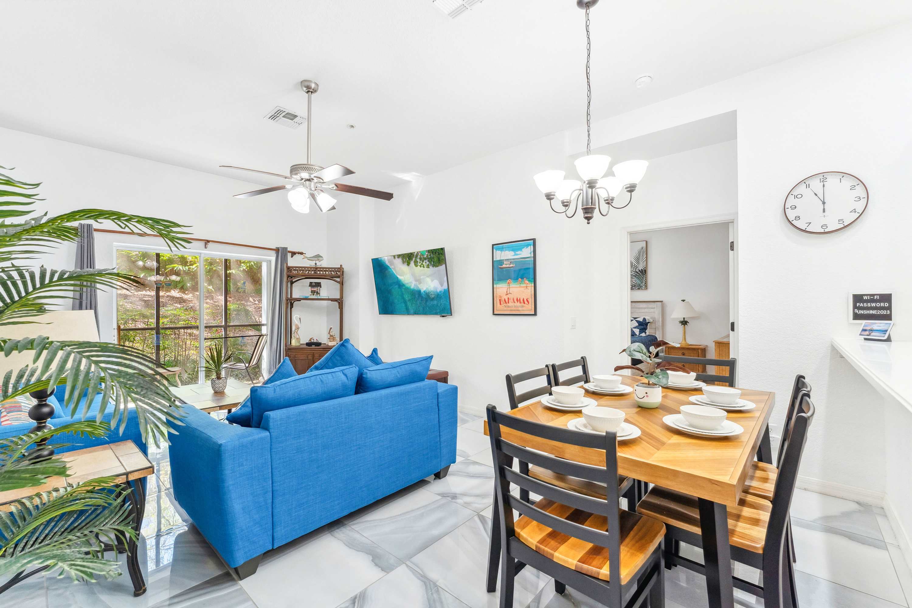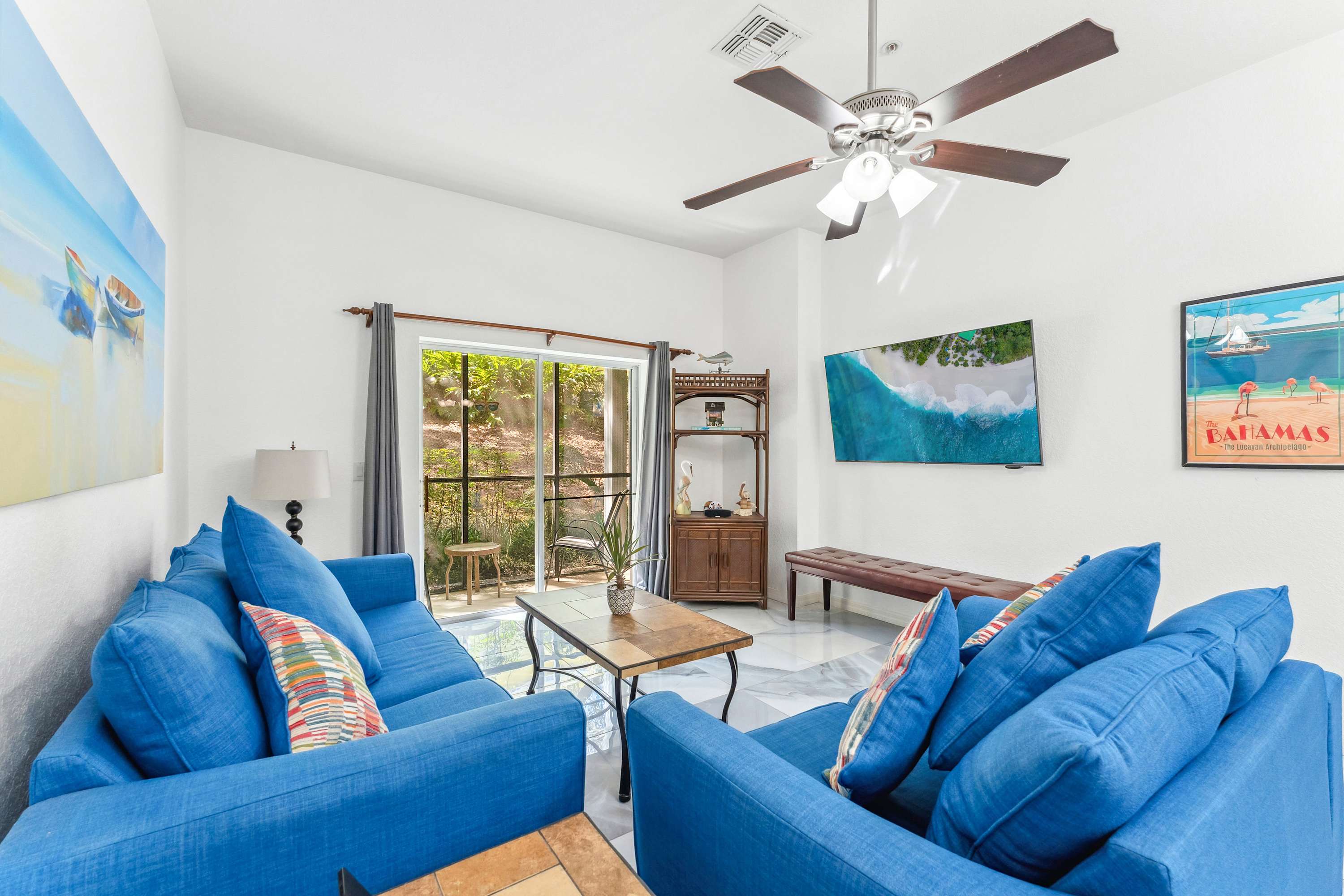 Just past the kitchen, the inviting living room offers a plush loveseat and sofa, centered around a smart TV ideal for movie nights or catching up on your favorite shows. Step out onto the screened-in patio though the sliding glass doors, where a cozy table for two invites you to sip coffee or cocktails while soaking in the resort’s Caribbean-inspired views. This peaceful outdoor space is perfect for starting your day with a gentle breeze or winding down with a sunset toast. For added fun, Serene Stay at Bahama Bay also offers a selection of board games—ideal for family game nights or rainy-day entertainment. With its blend of relaxing resort amenities, inviting home comforts, and prime location near Florida’s top attractions, this Bahama Bay Resort retreat offers the ultimate vacation experience.