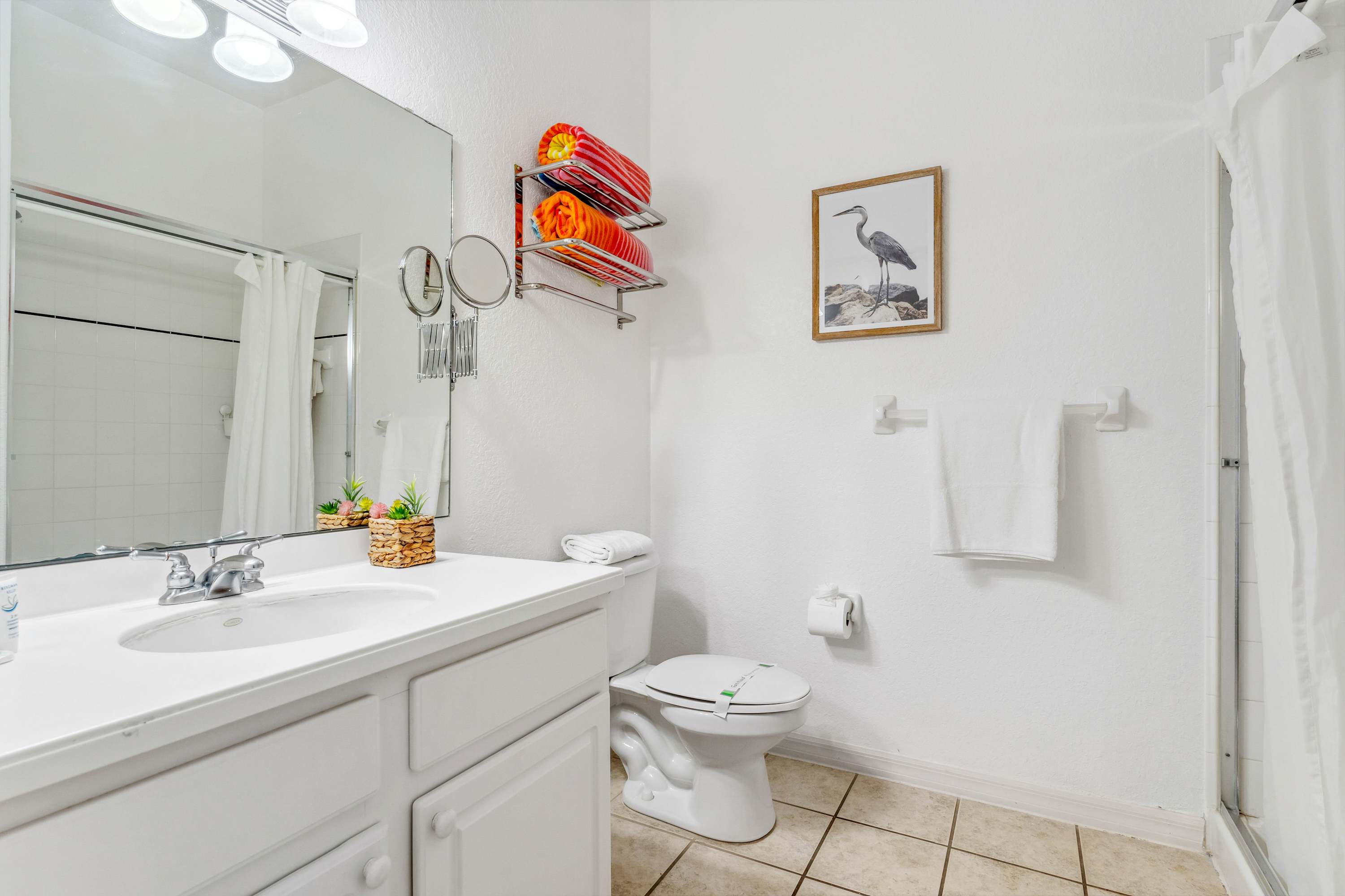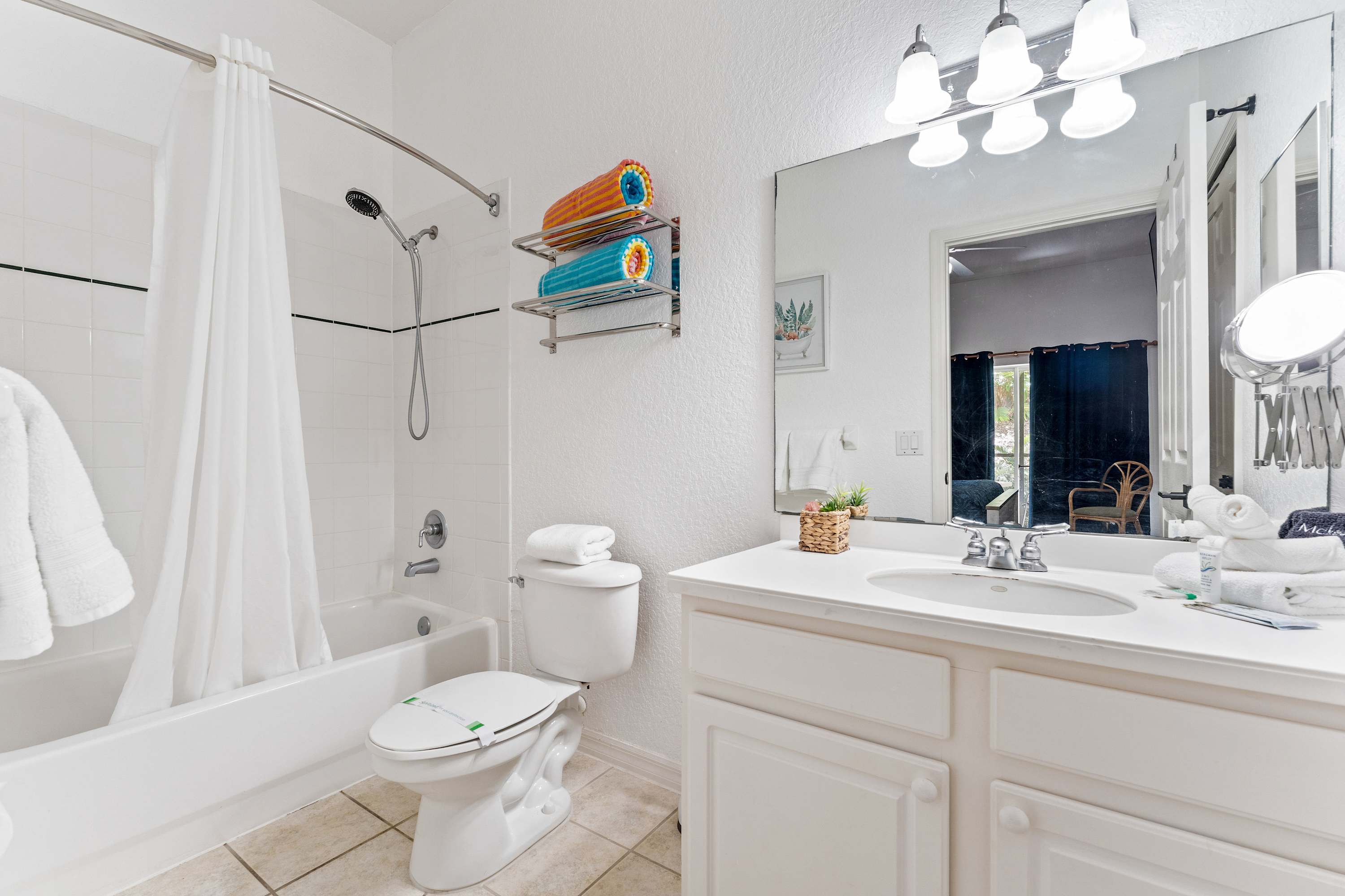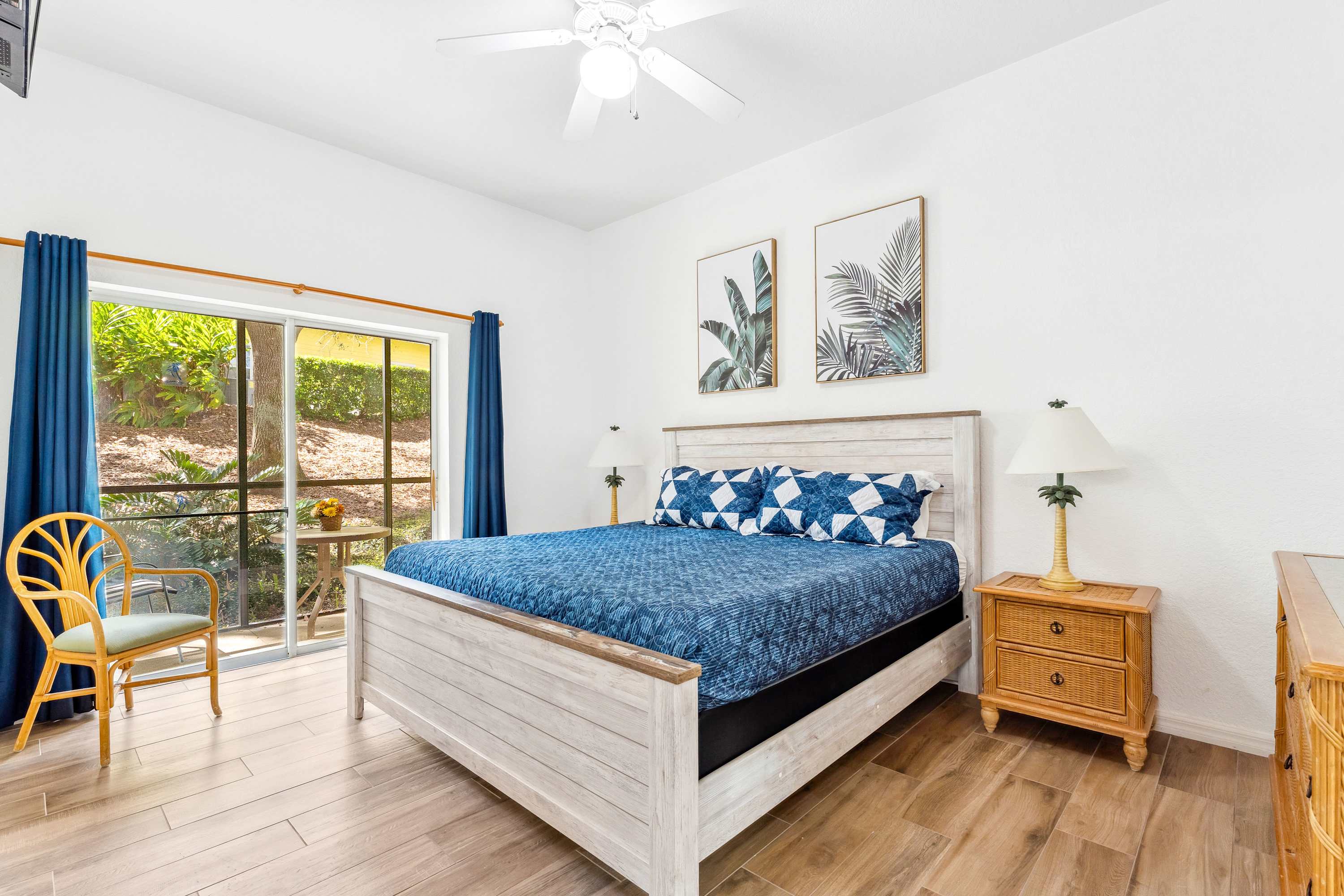 Just past the kitchen, the inviting living room offers a plush loveseat and sofa, centered around a smart TV ideal for movie nights or catching up on your favorite shows. Step out onto the screened-in patio though the sliding glass doors, where a cozy table for two invites you to sip coffee or cocktails while soaking in the resort’s Caribbean-inspired views. This peaceful outdoor space is perfect for starting your day with a gentle breeze or winding down with a sunset toast. For added fun, Serene Stay at Bahama Bay also offers a selection of board games—ideal for family game nights or rainy-day entertainment. With its blend of relaxing resort amenities, inviting home comforts, and prime location near Florida’s top attractions, this Bahama Bay Resort retreat offers the ultimate vacation experience.