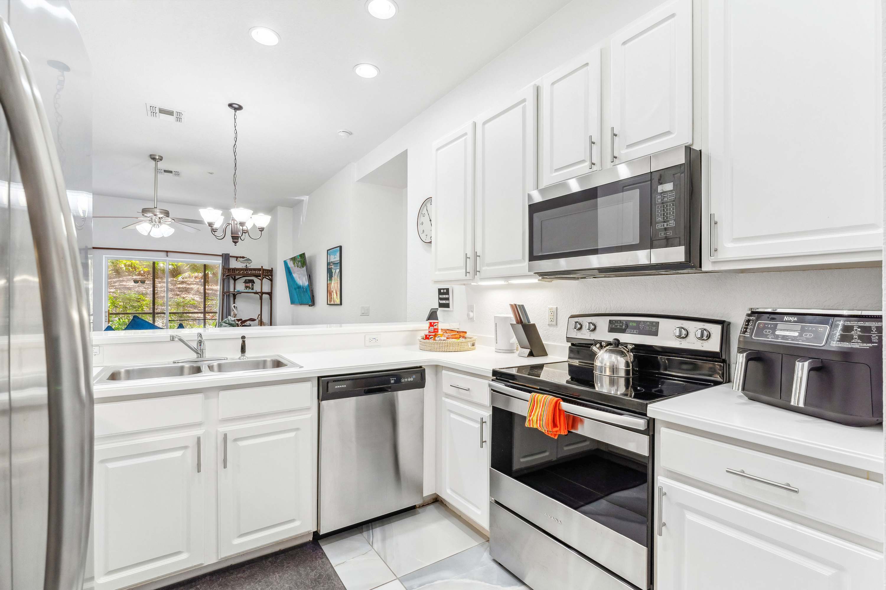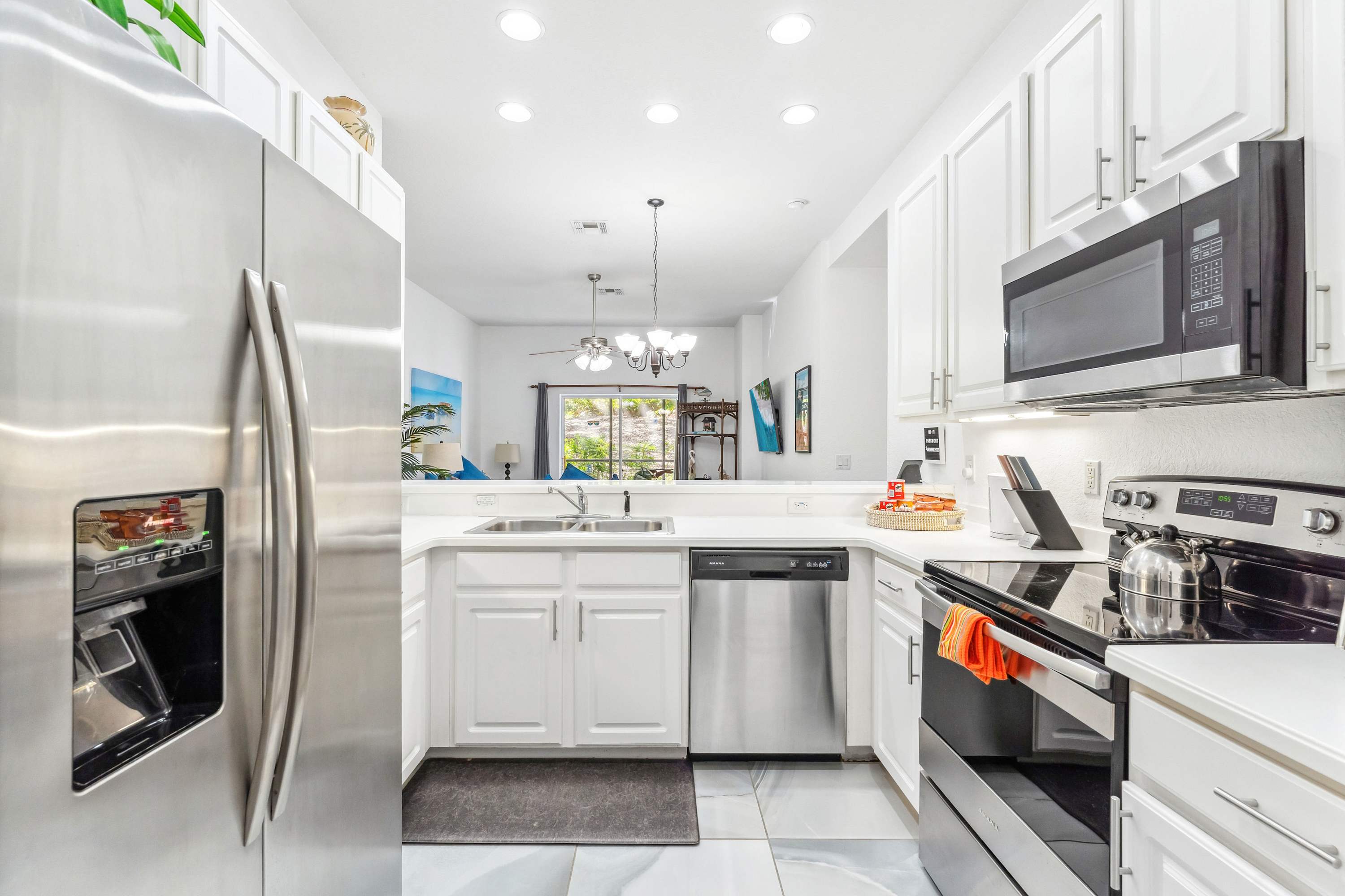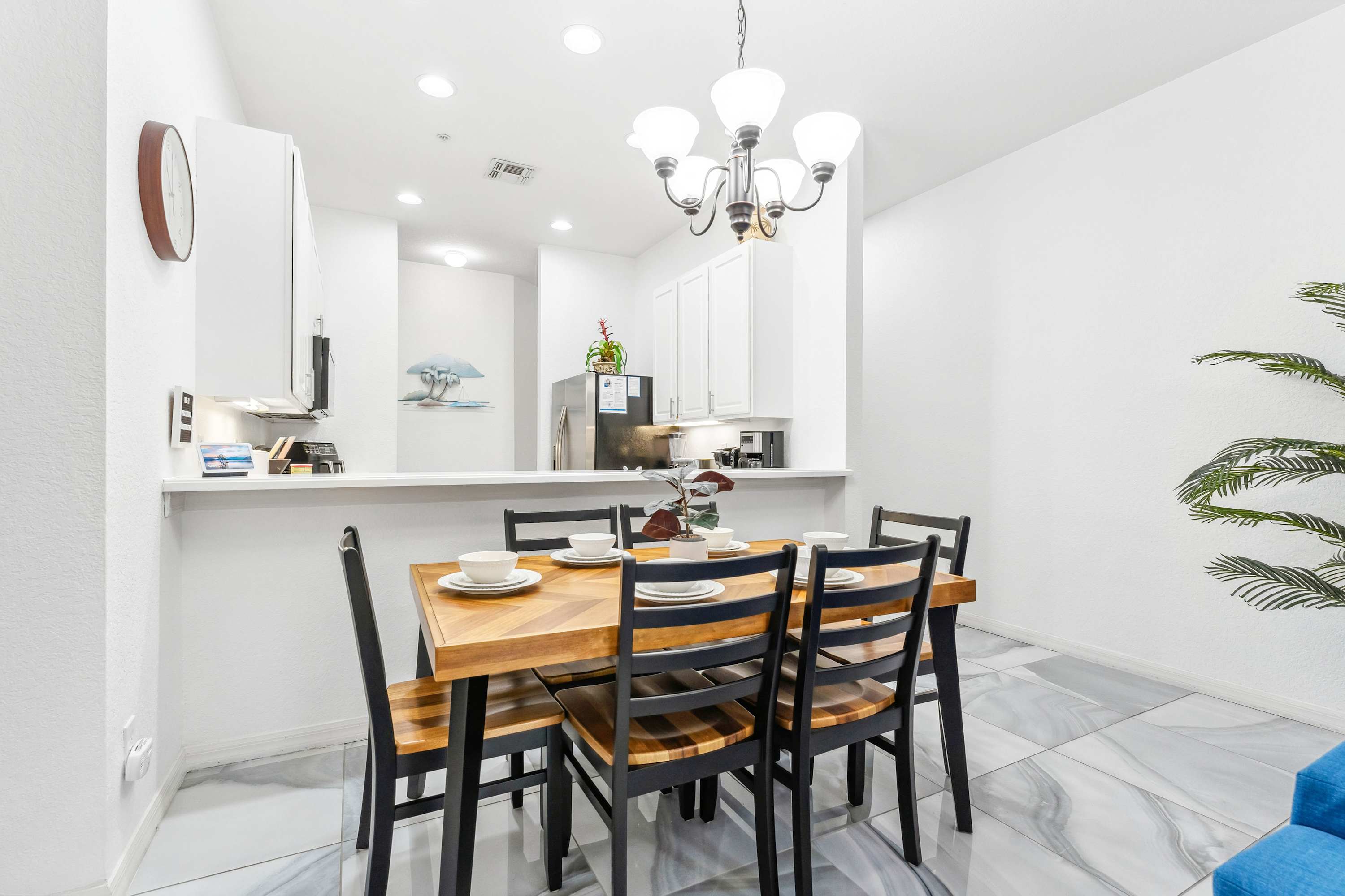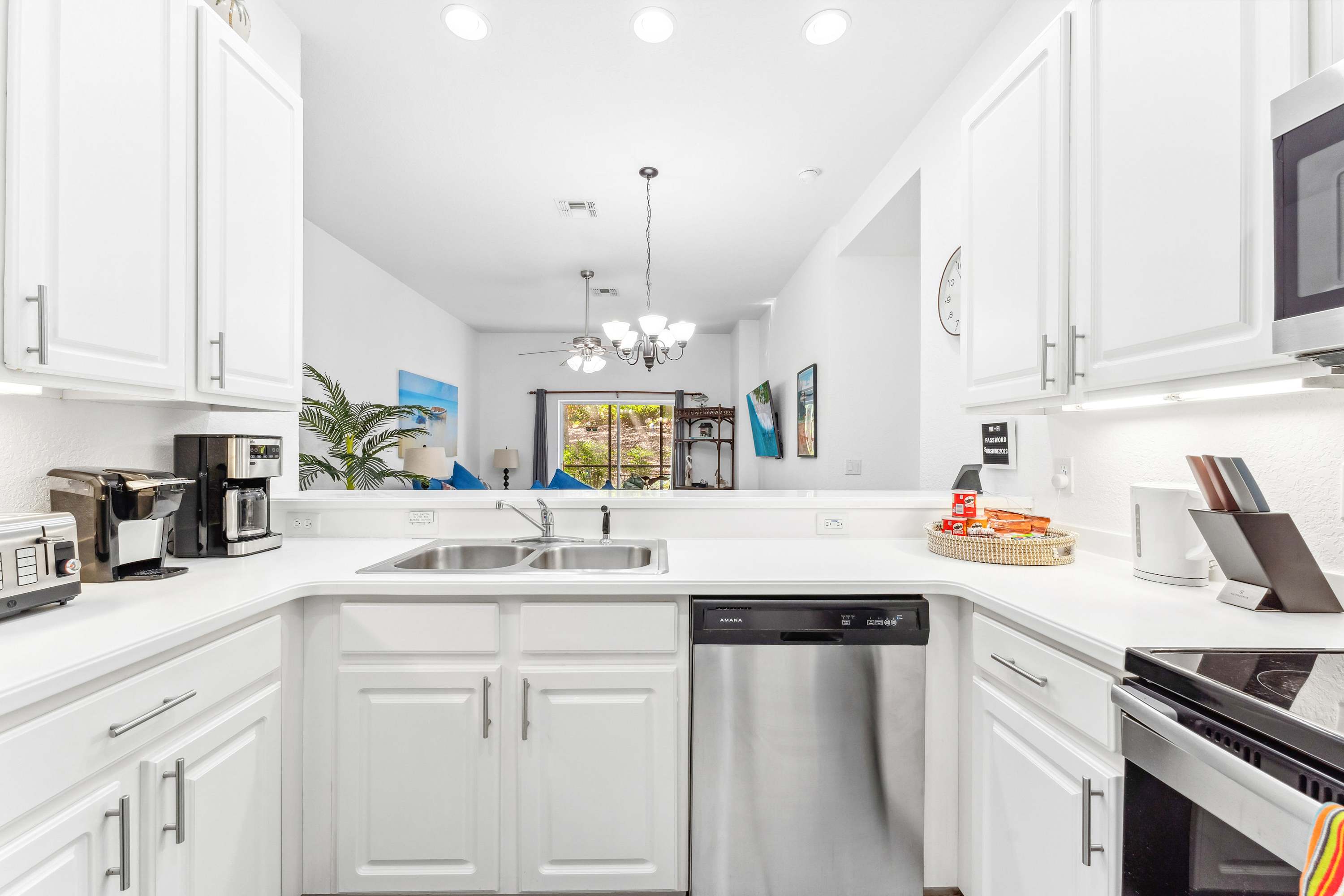 Whether you’re seeking relaxation at the Cenote Day Spa or planning a trip to the nearby Orlando theme parks, your vacation can be as peaceful or active as you’d like at Serene Stay at Bahama Bay. Step inside this charming vacation home, where comfort and convenience await. The fully equipped kitchen features sleek stainless steel appliances, bright white cabinets stocked with essentials, and a dual drip/on-demand coffee maker—perfect for brewing your morning cup before heading out to explore. Gather around the dining table for six to enjoy a delicious breakfast or unwind with family dinners after a day of adventure.
