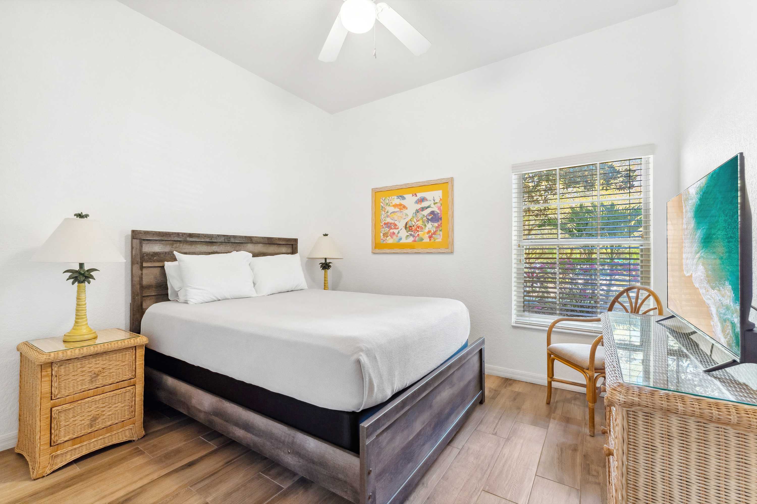 Bedroom #2 includes a queen size bed and a smart TV.