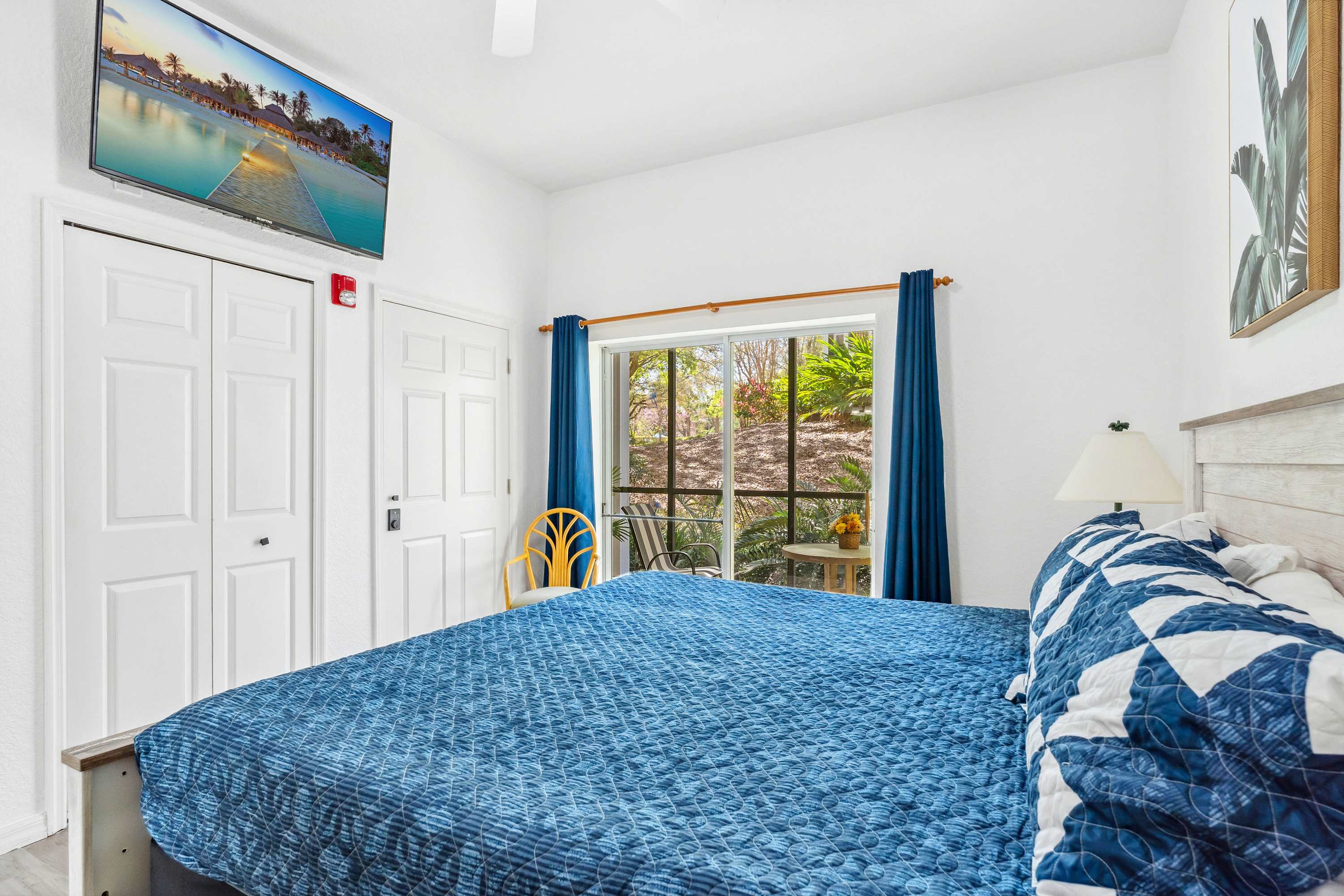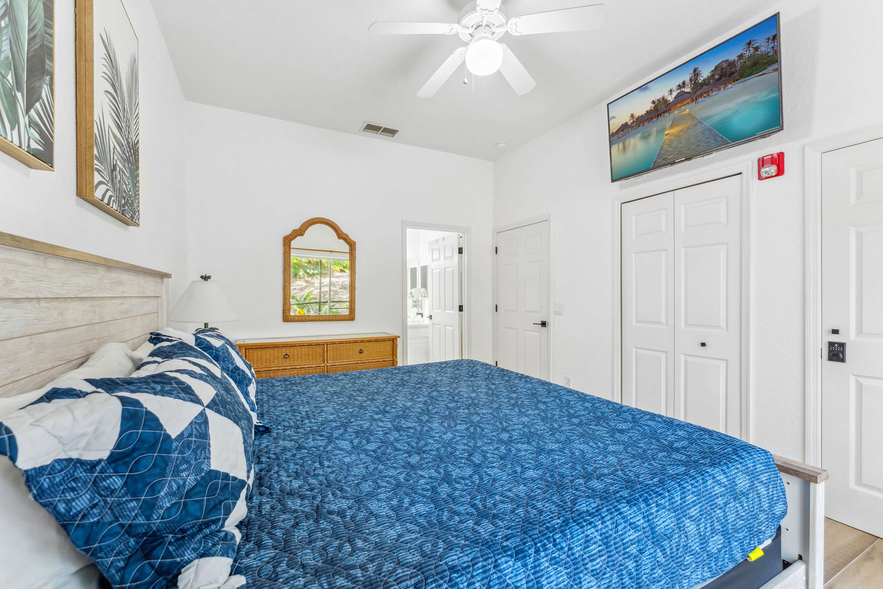 Bedroom #3 includes a king size bed, a smart TV, patio access, and an ensuite bathroom with a single vanity and a shower/tub combo.