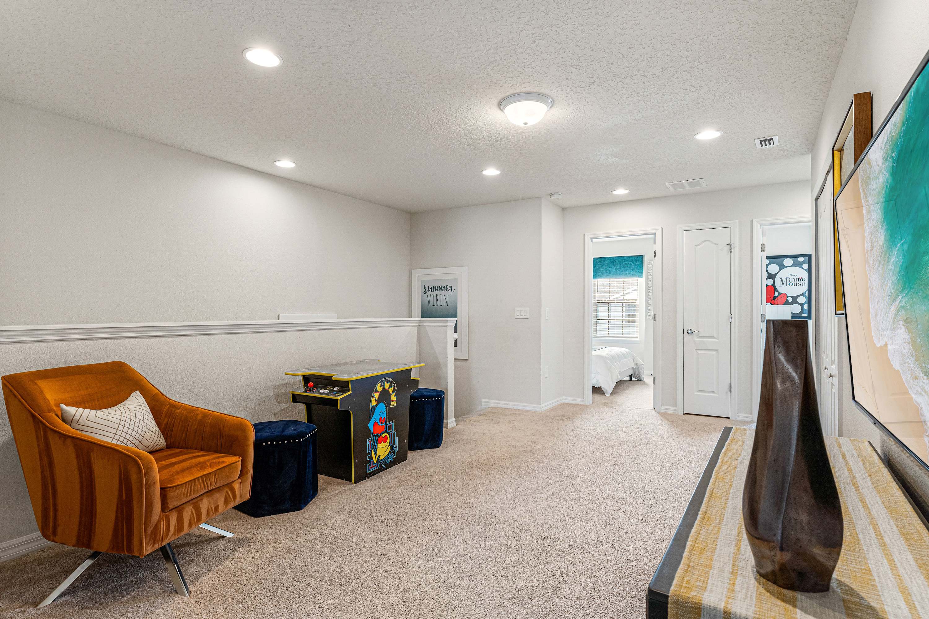 Step inside to a welcoming and stylish living area, featuring two spacious sofas surrounding a smart TV—ideal for movie nights or unwinding after a day of adventure. From the living room, walk out to the lanai, where seating for six invites you to sip your morning coffee while soaking in the Florida breeze or enjoy a sunset dinner in the fresh air. Wrap up your evenings with a dip in the private pool or lounge poolside with a cocktail in hand while the kids have some friendly competition in the loft with an arcade table game, Pac man, and a smart TV.