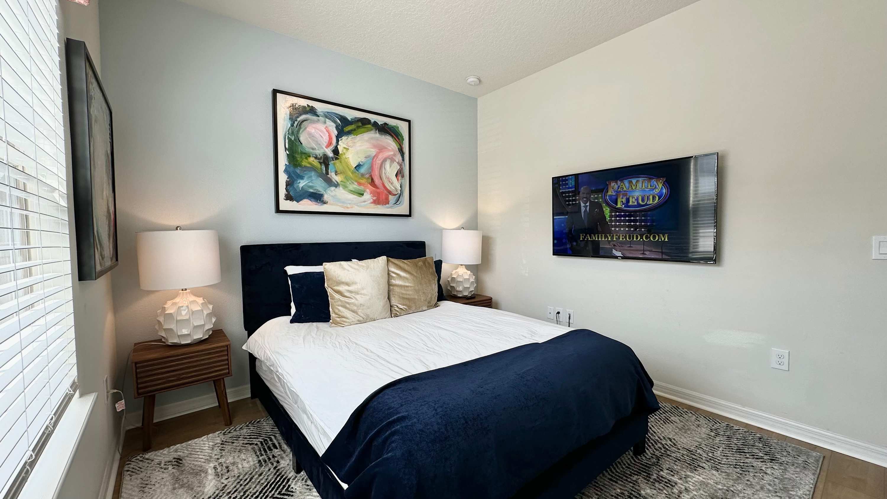 Bedroom #2 includes a queen size bed, a smart TV, and an ensuite bathroom with a single vanity and a walk-in shower.